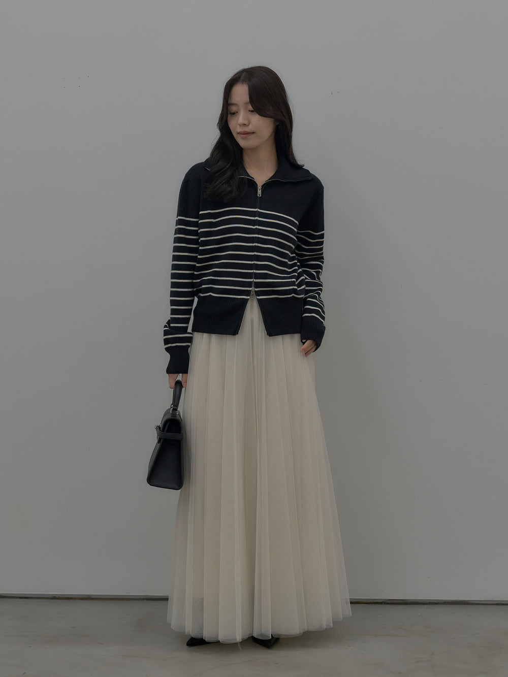 【SET】ダブルZIPハイネックボーダーニットトップス+ボリュームチュールスカート(2set)