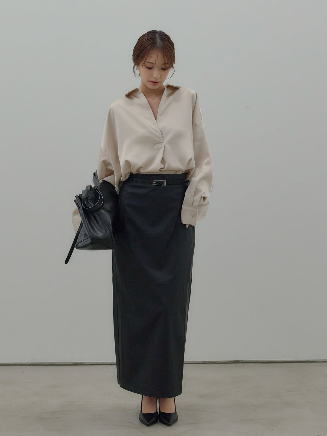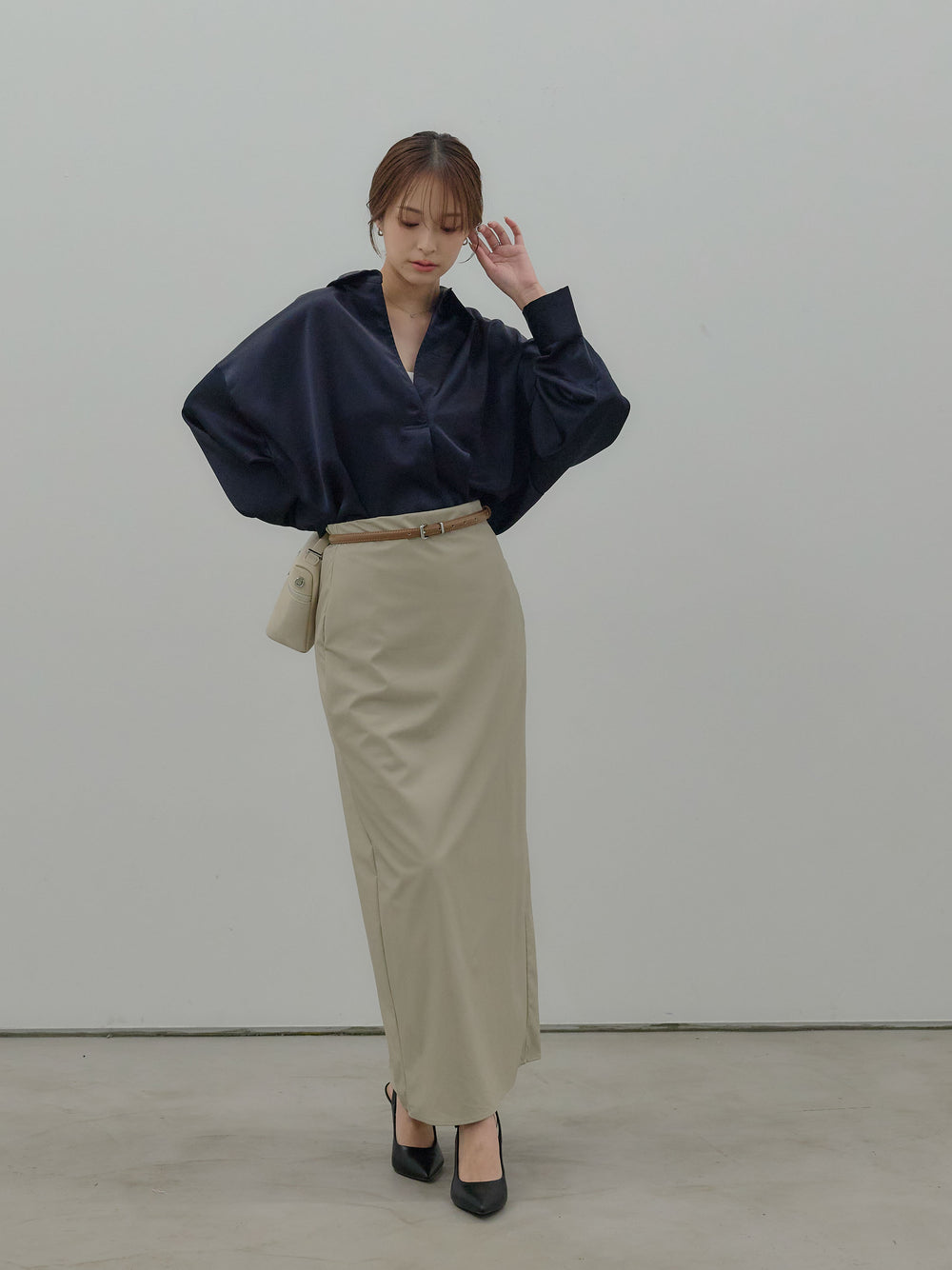 【SET】襟付きポロトップス+ナローAラインサテンスカート(2set)