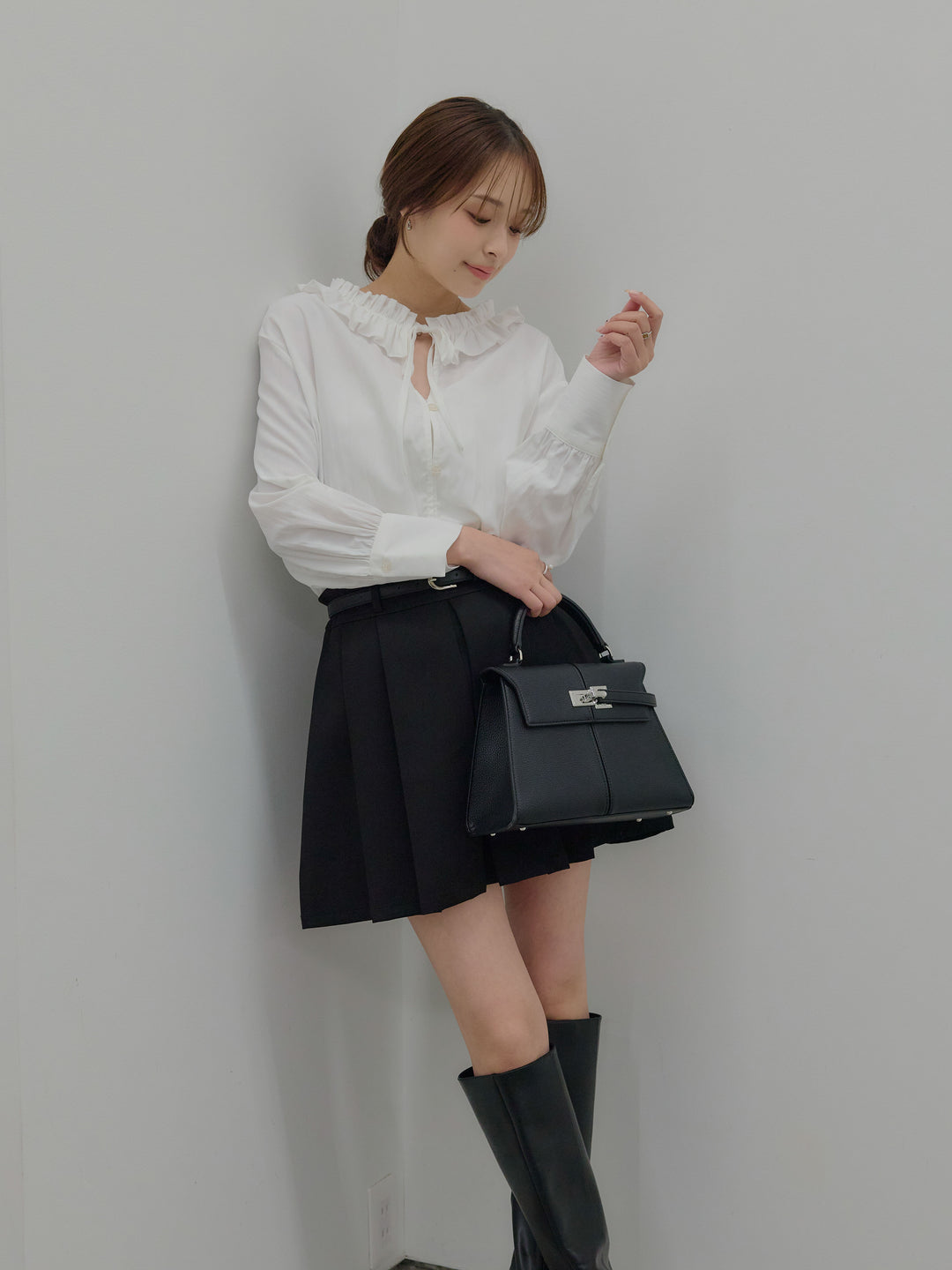 【SET】フリルネックリボンブラウス+ベルト付きプリーツミニスカート(2set)