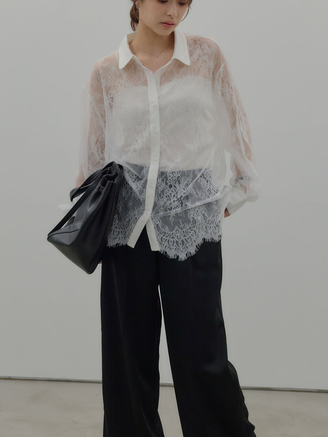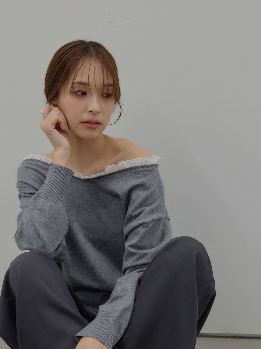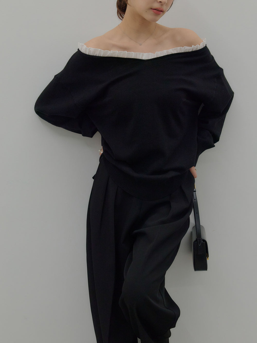 【SET】レース襟ニットトップス+【Essential】センタープレスサテンパンツ(2set)
