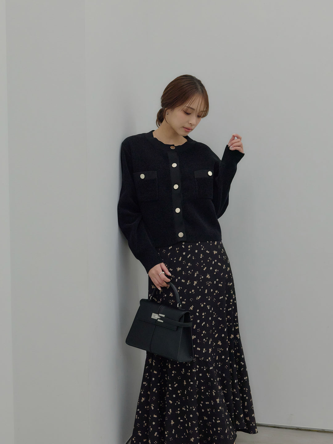 【SET】ゴールドボタンモールニットカーディガン+フラワーパターンマーメイドフレアスカート(2set)