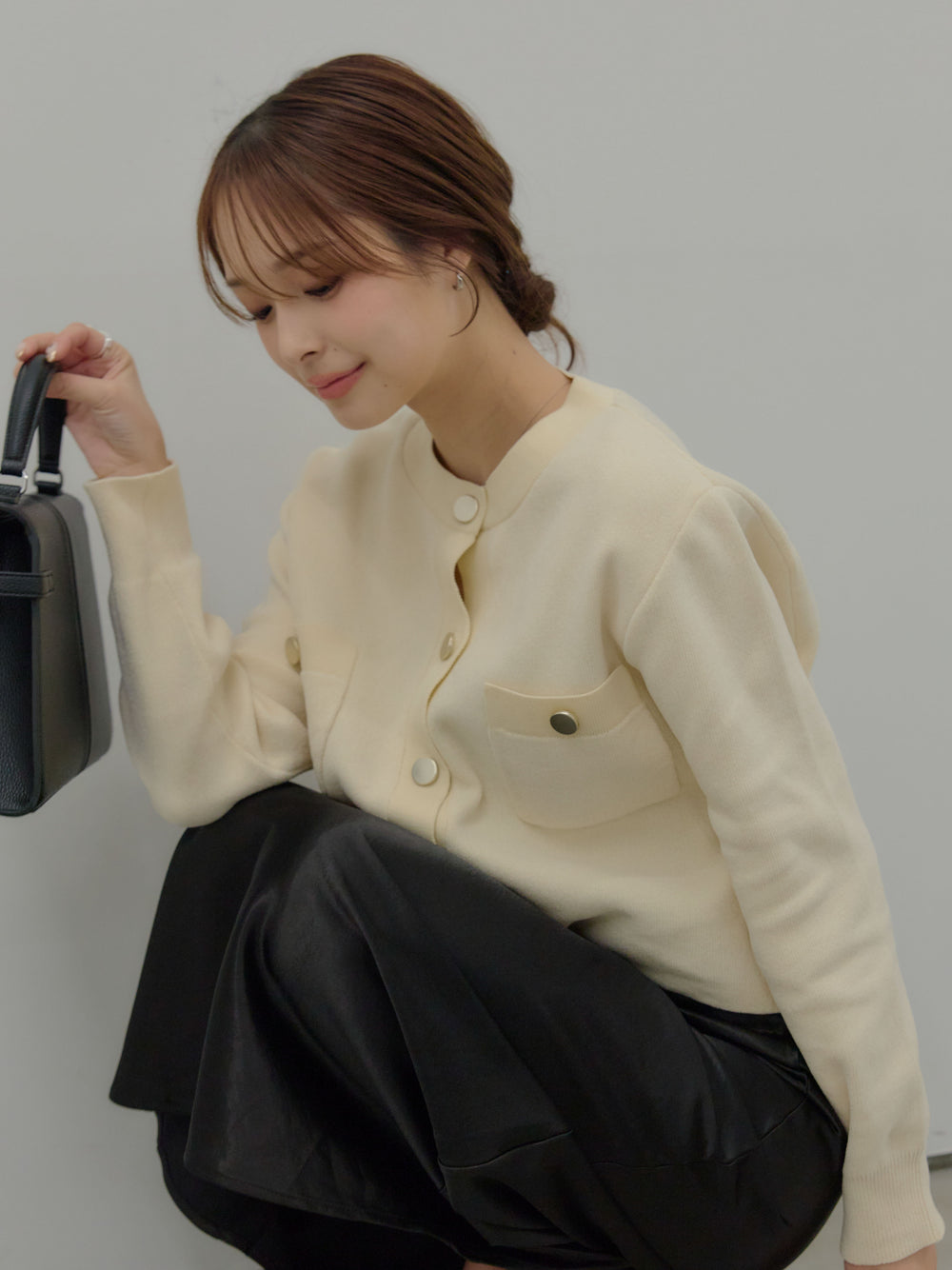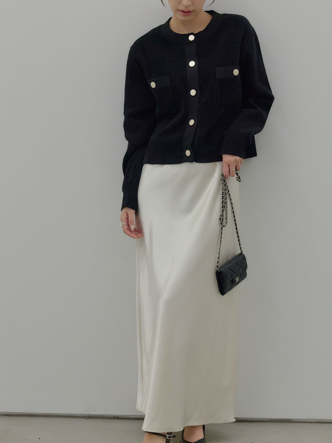 【SET】シルバーボタンコンパクトニットカーディガン+バイカラーフリルチュールスカート(2set)