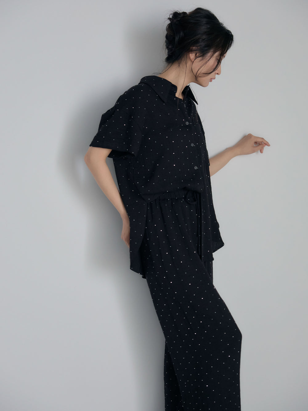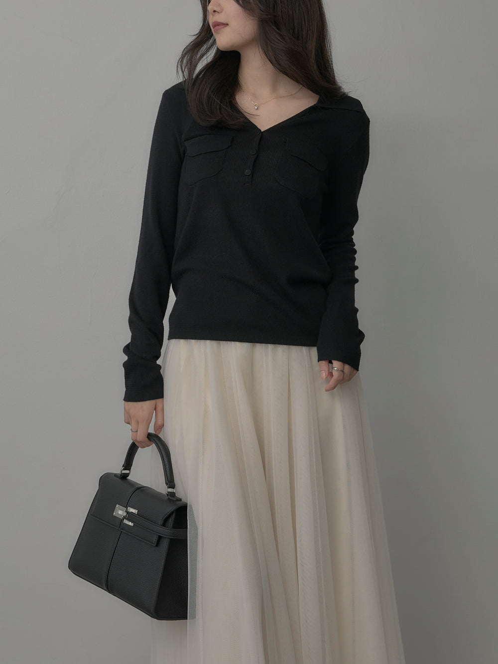 【SET】ハーフスリーブPOLOニットトップス+ドットパターンソフトバルーンスカート(2set)
