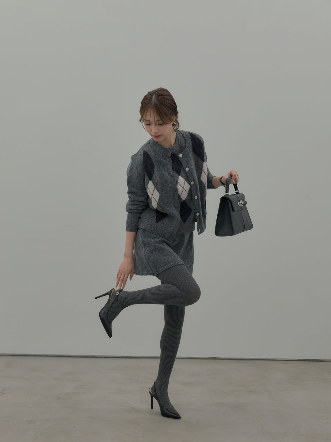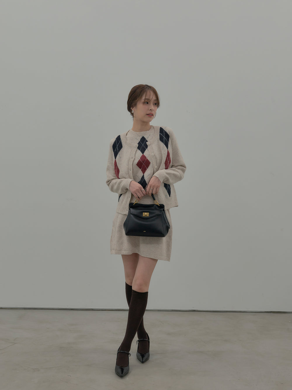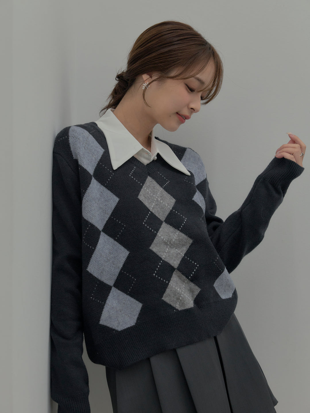 【SET】アーガイル柄Vネックニットプルオーバー+パールボタンサテンシャツ(2set)