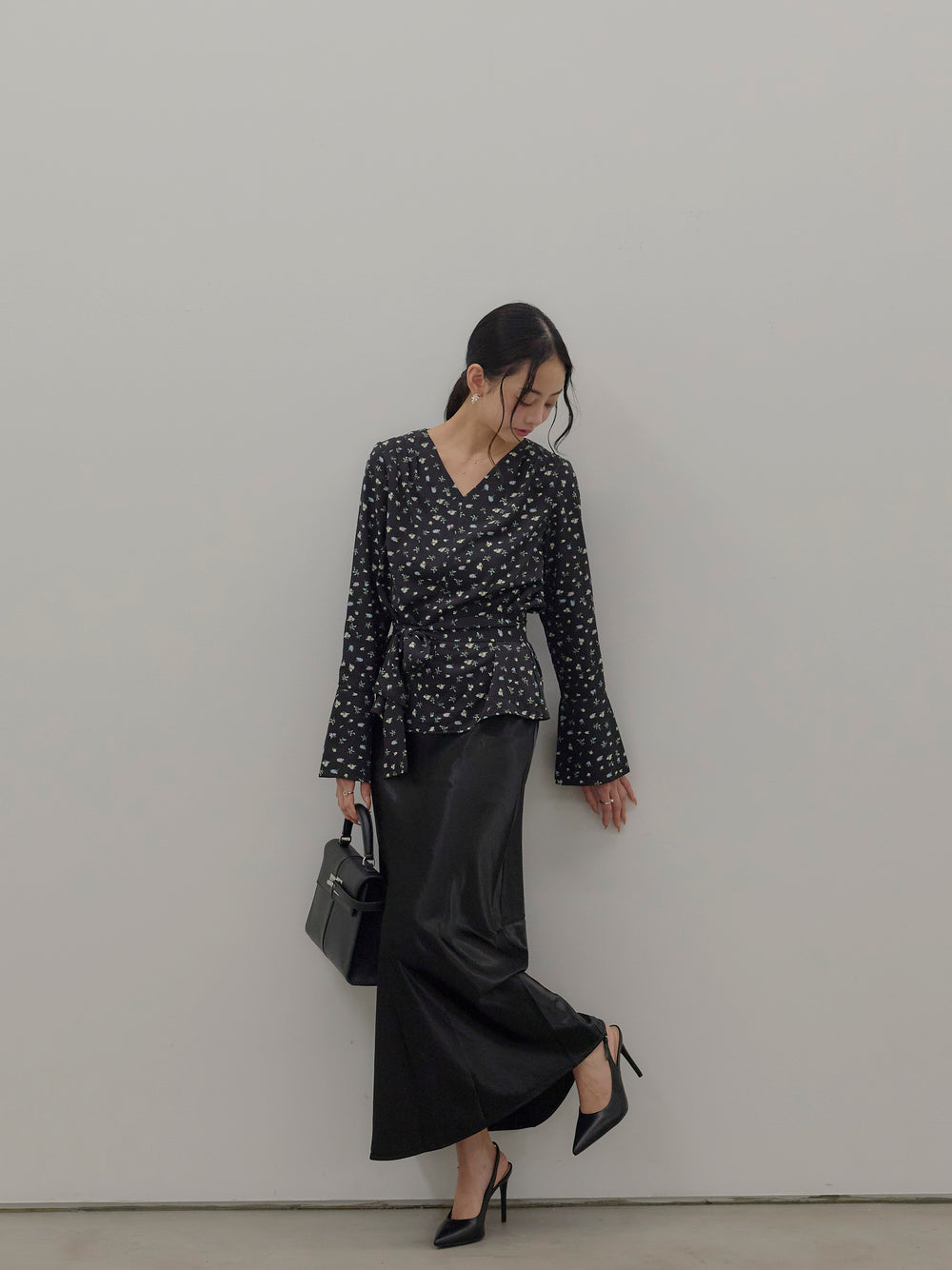 【SET】ウエストベルトサテンVネックシャツ+ナローAラインサテンスカート(2set)