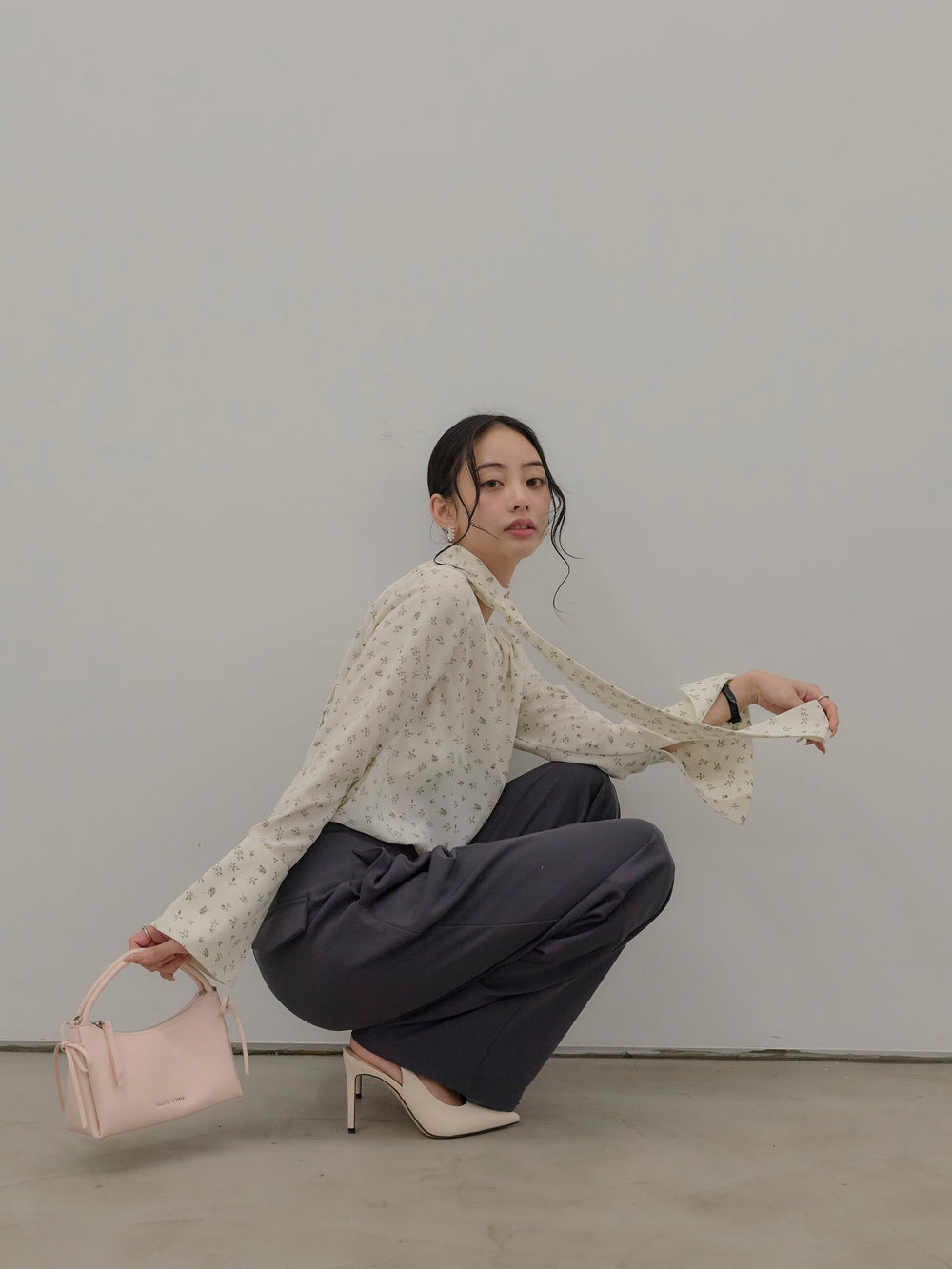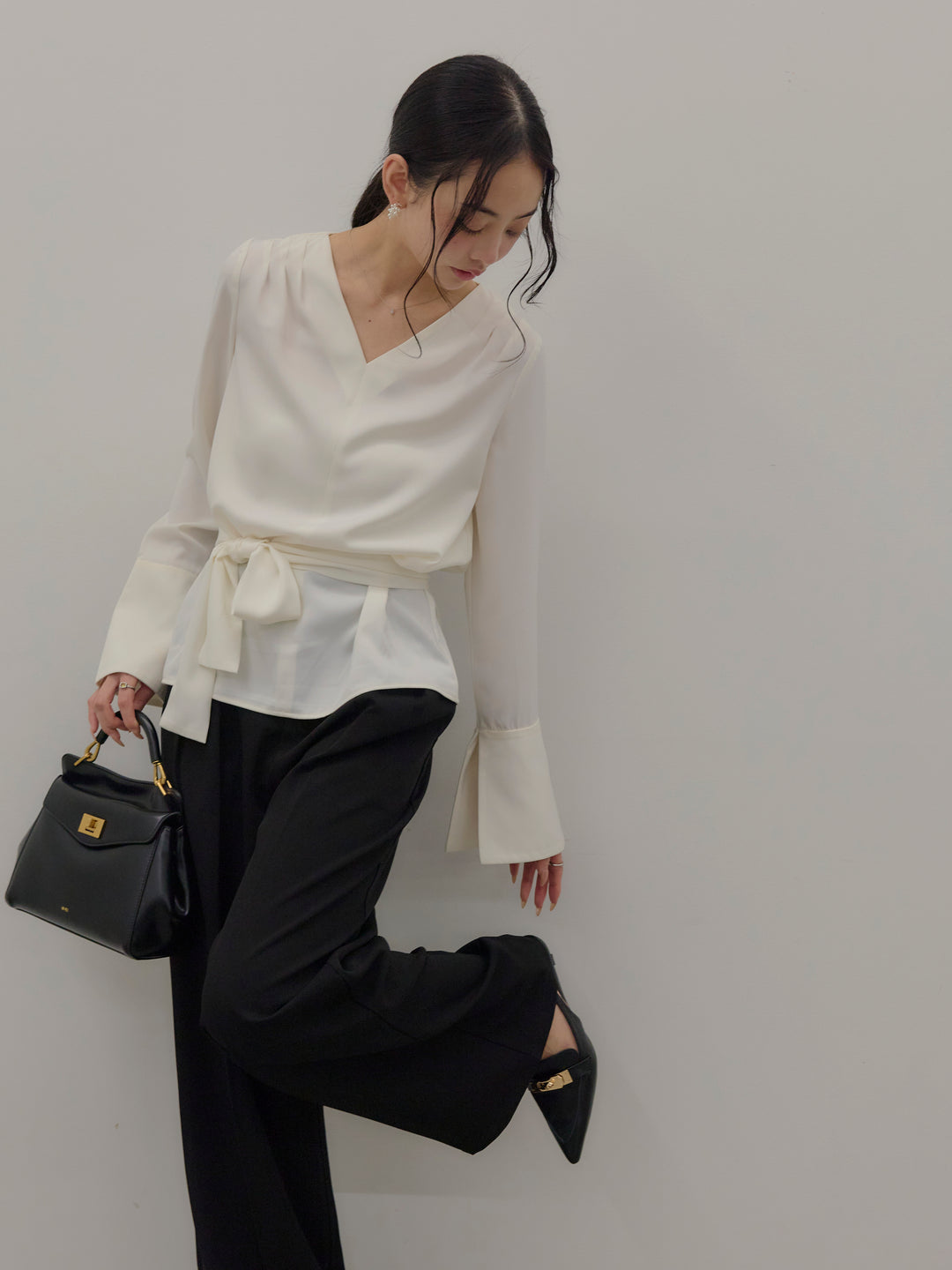 【SET】【Essential】2wayタイ付きベルスリーブサテンブラウス+ハイウエストセンタープレスワイドパンツ(2set)