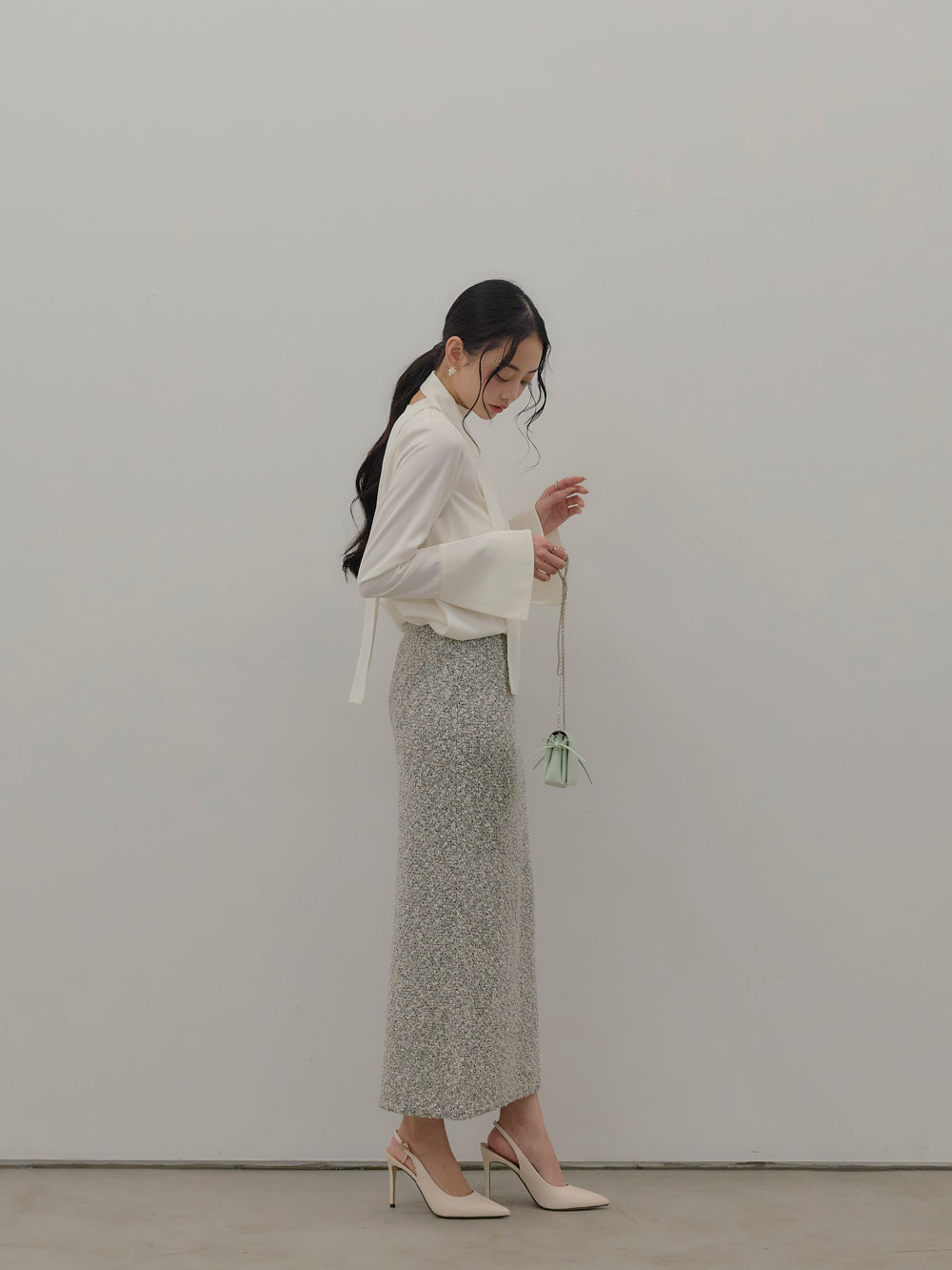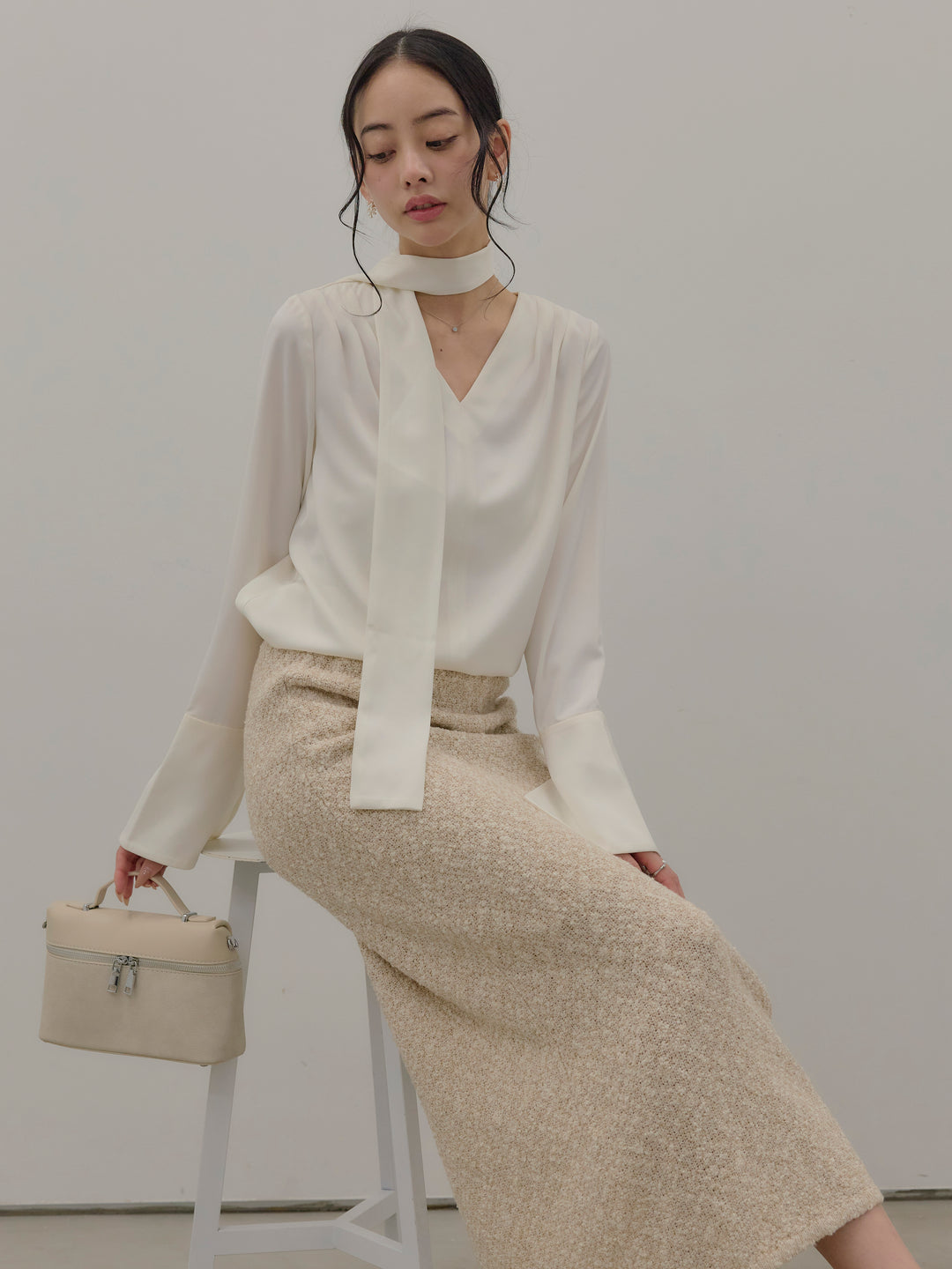 【SET】【Essential】2wayタイ付きベルスリーブサテンブラウス+ツイード風MIXスラブスカート(2set)