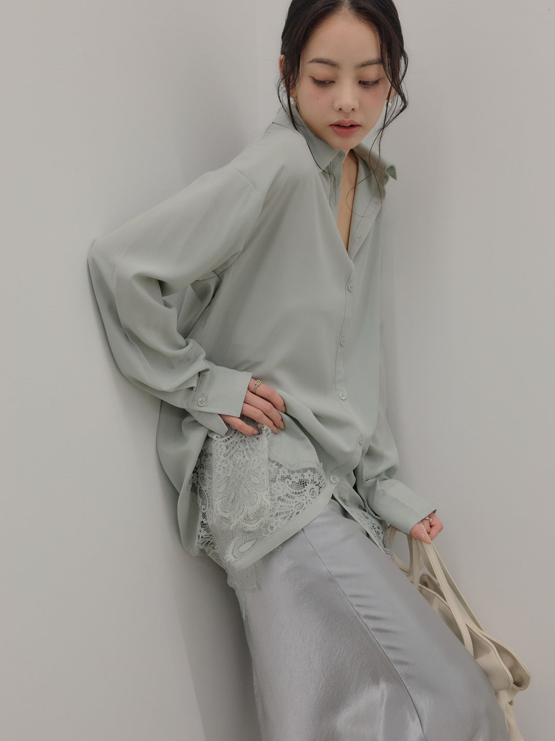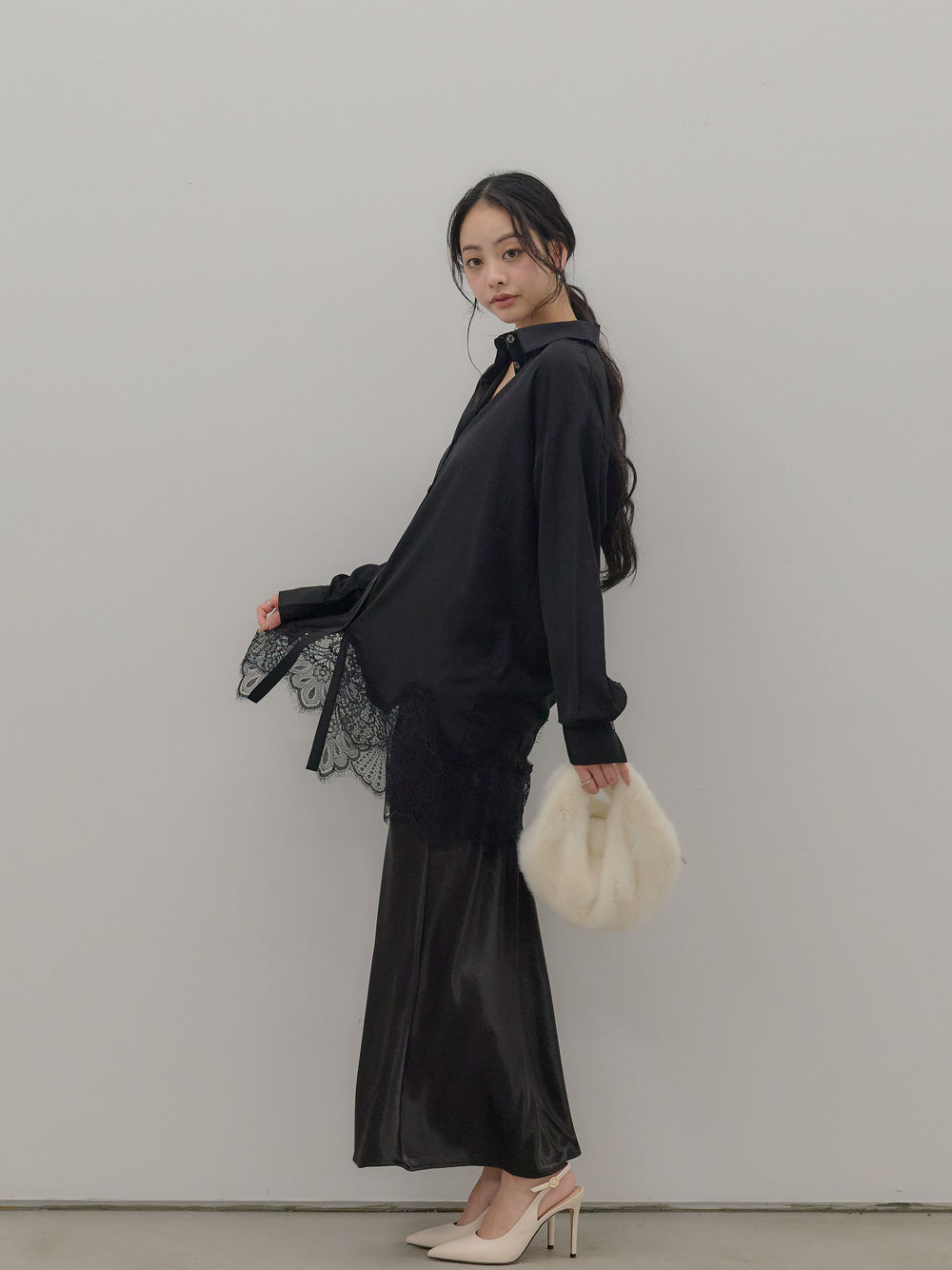 【SET】裾レースグロッシーシャツチュニック+リュクスAラインサテンスカート(2set)