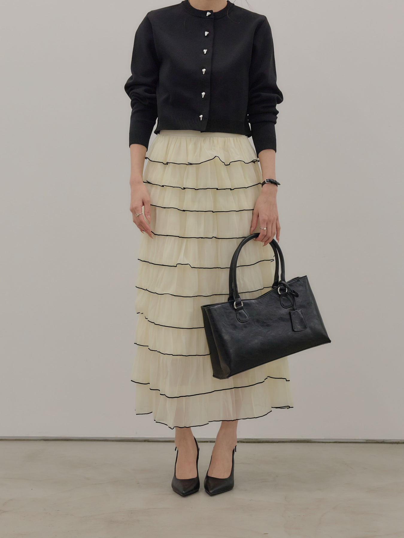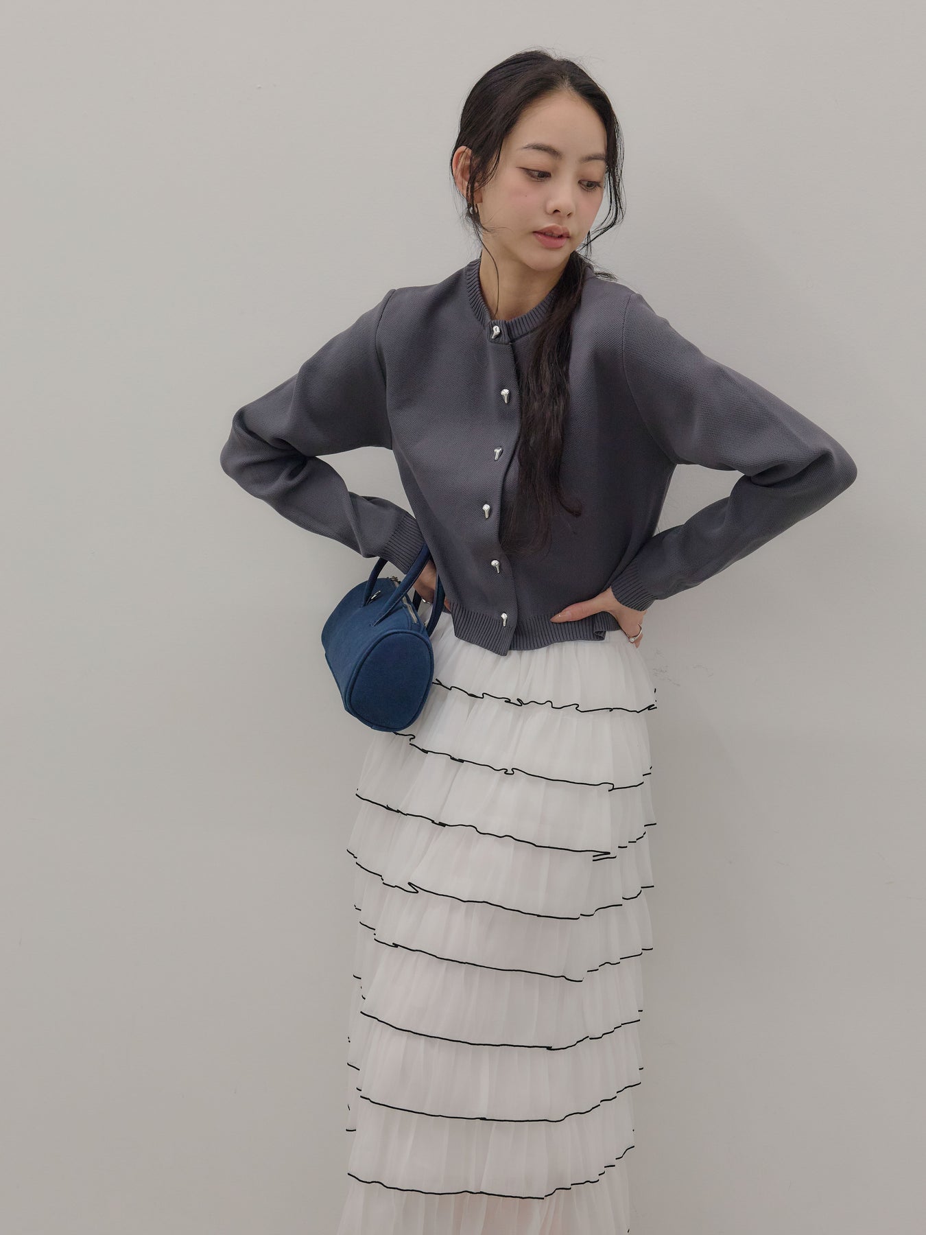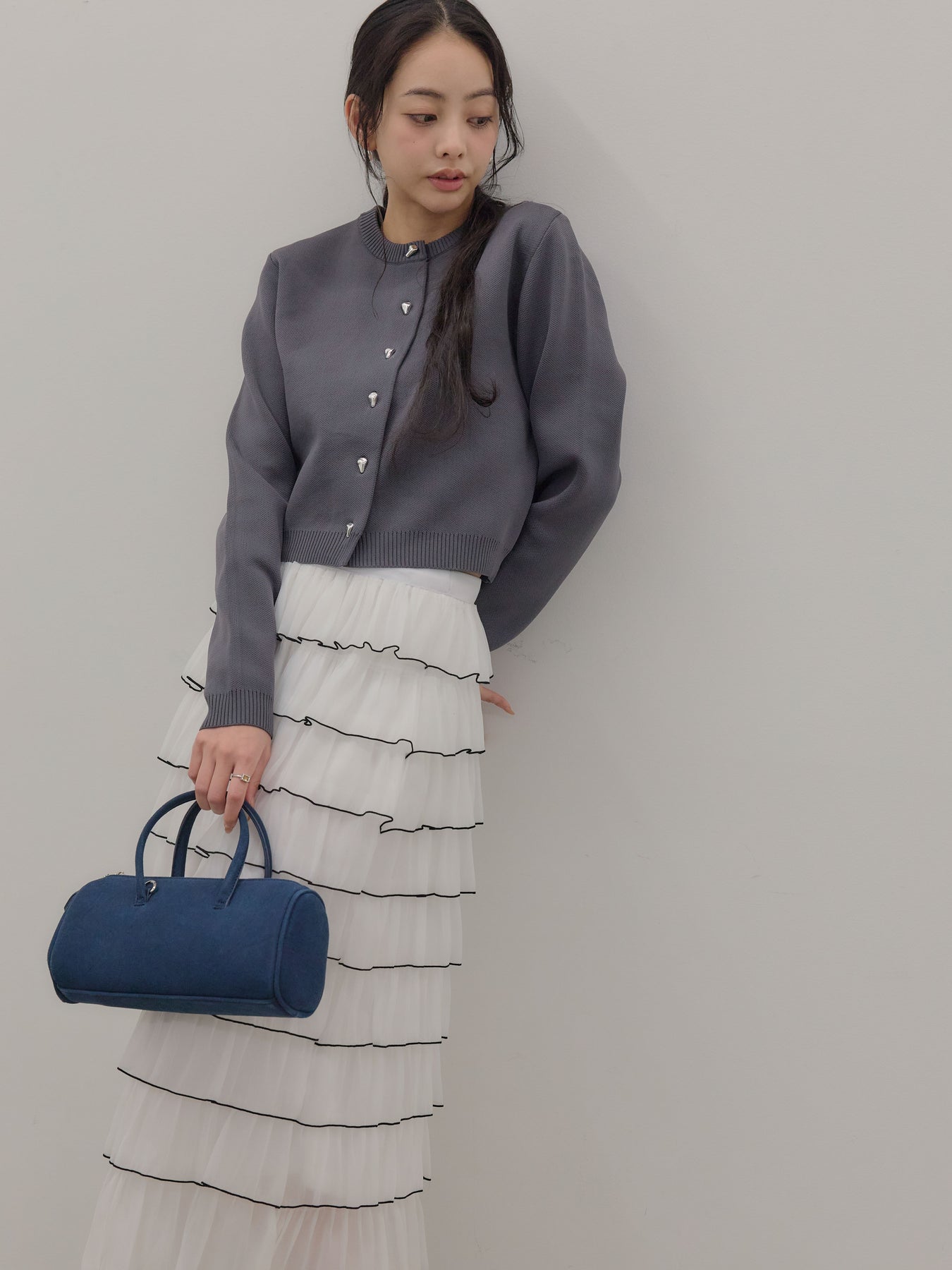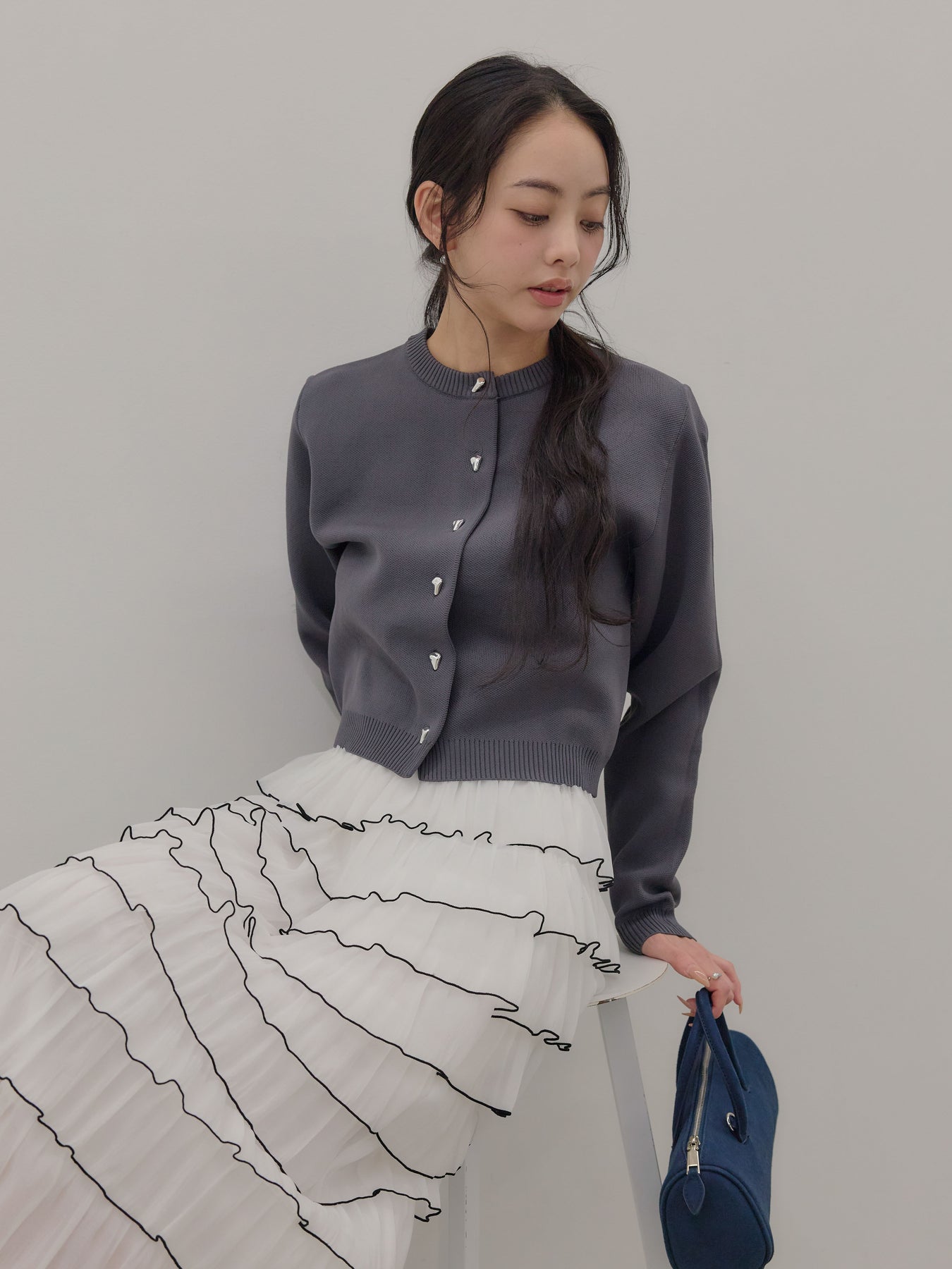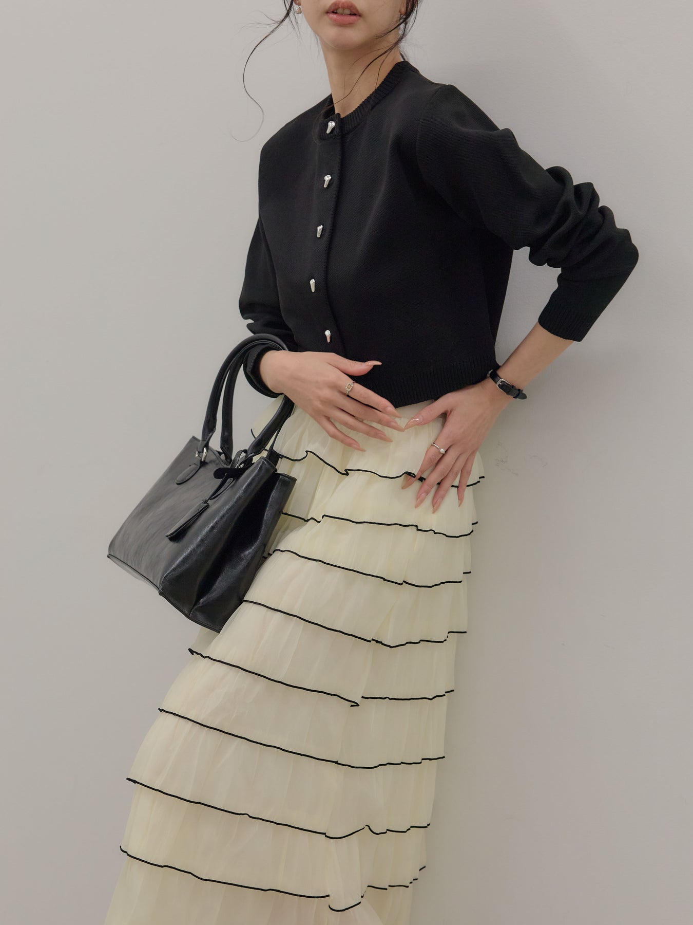 【SET】シルバーボタンコンパクトニットカーディガン+バイカラーフリルチュールスカート(2set)