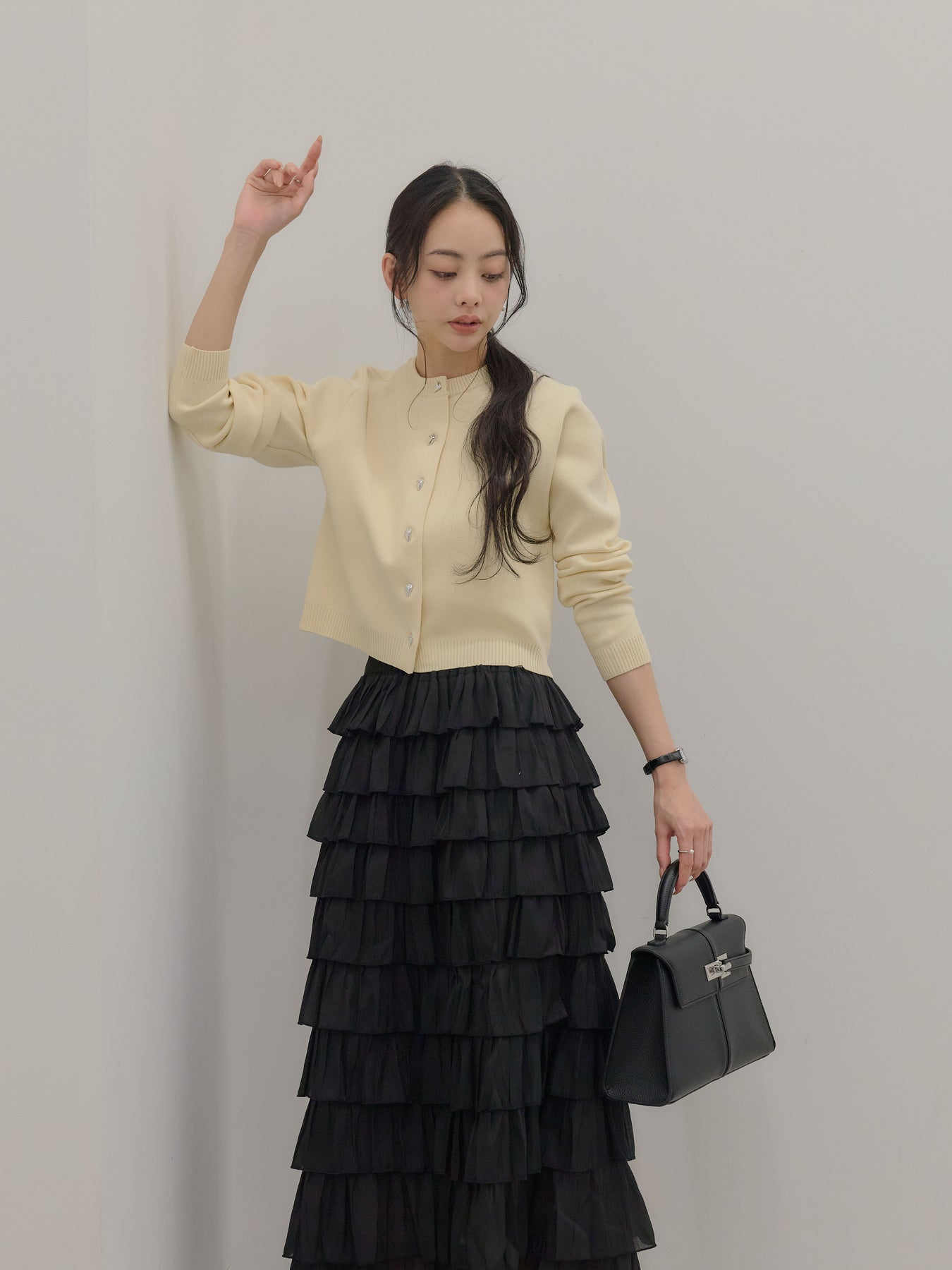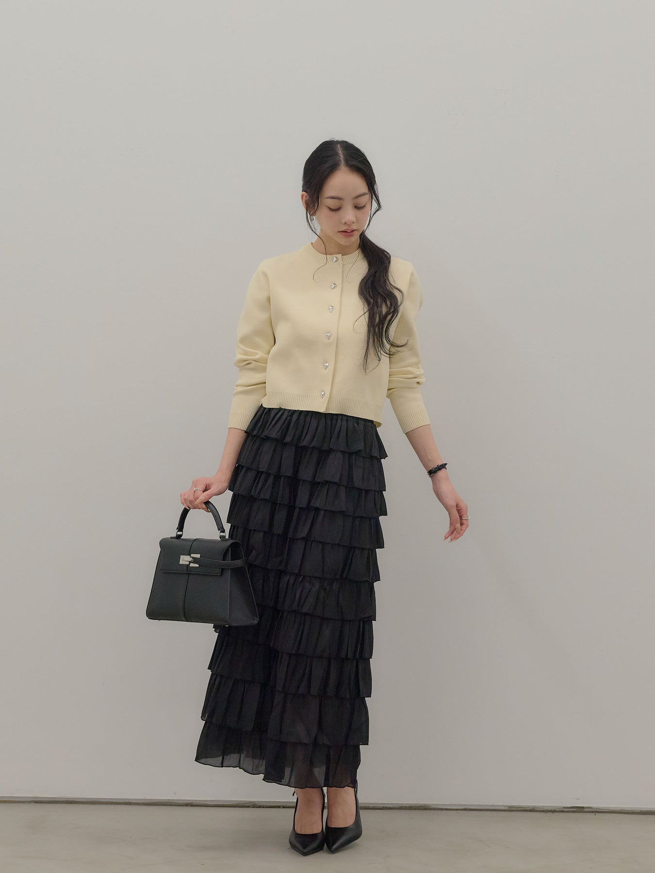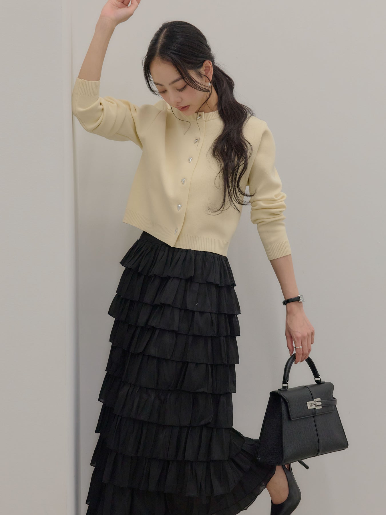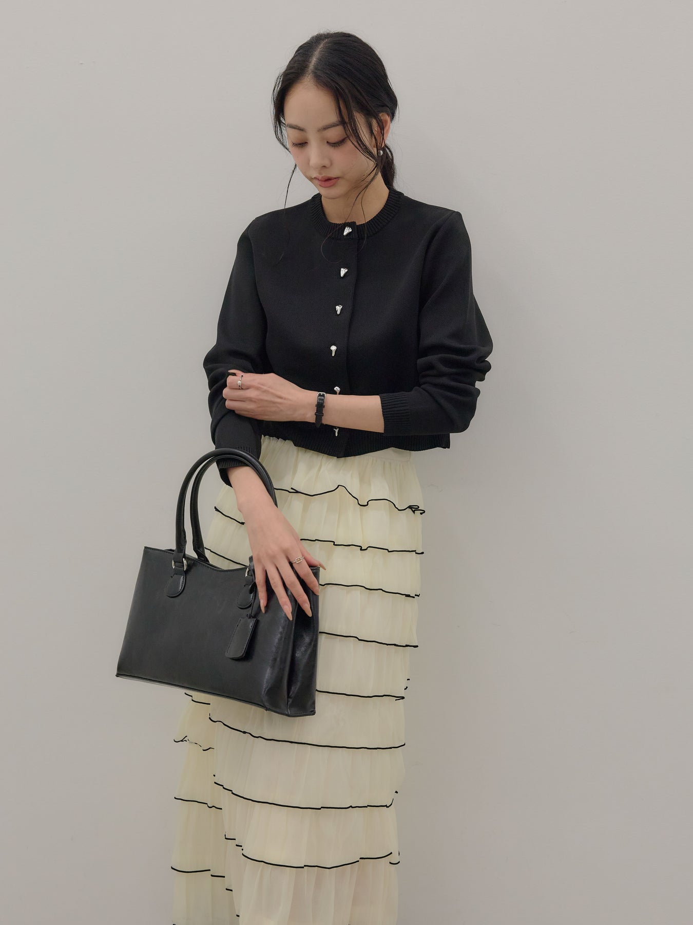 【SET】シルバーボタンコンパクトニットカーディガン+バイカラーフリルチュールスカート(2set)