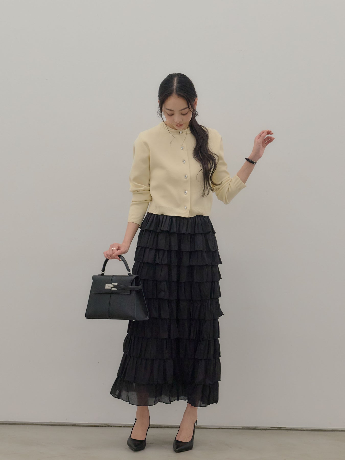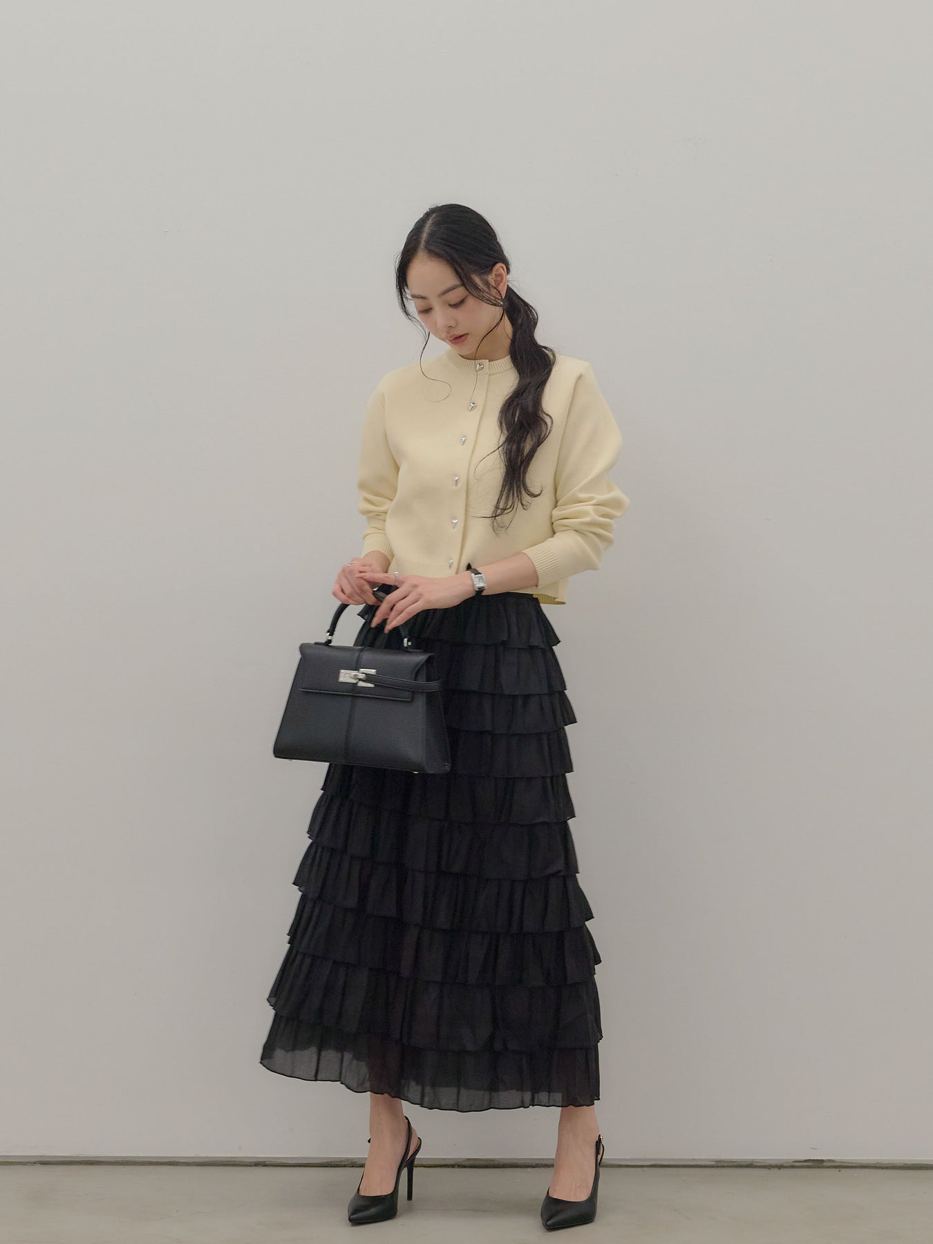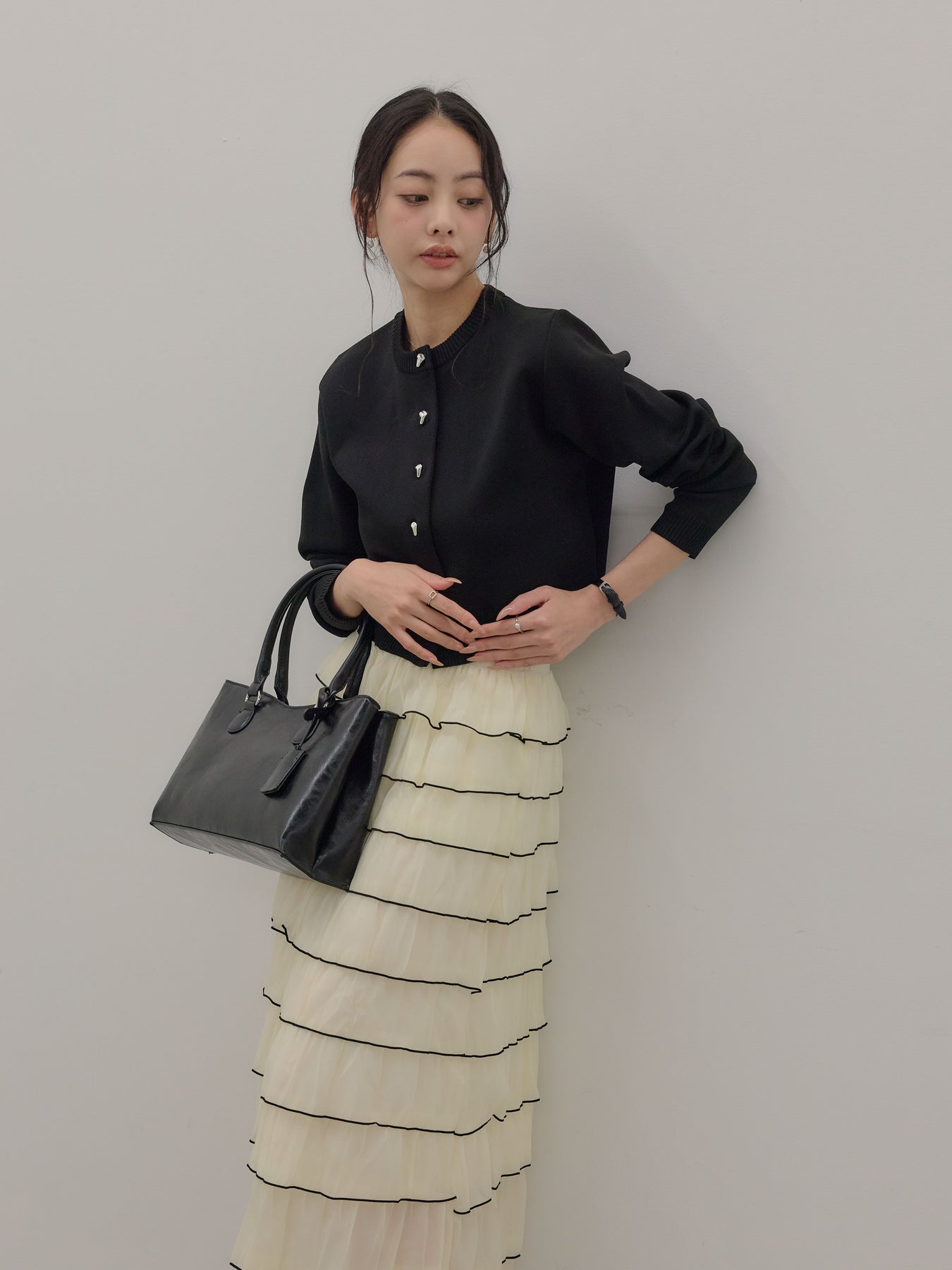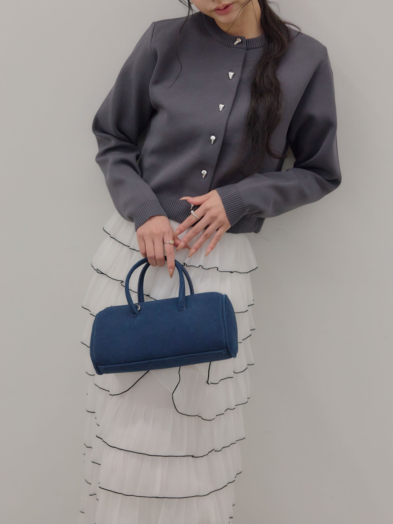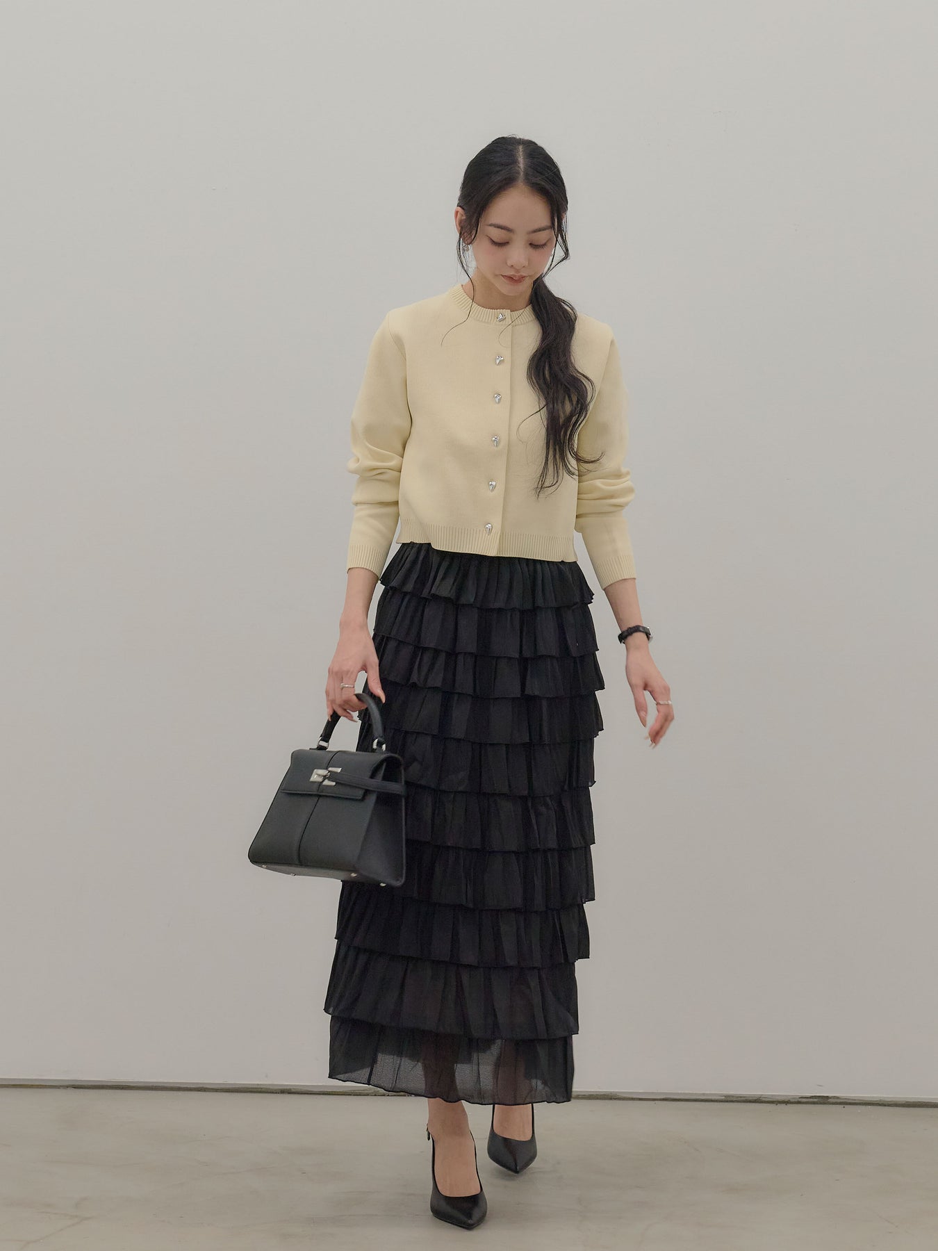 【SET】シルバーボタンコンパクトニットカーディガン+バイカラーフリルチュールスカート(2set)