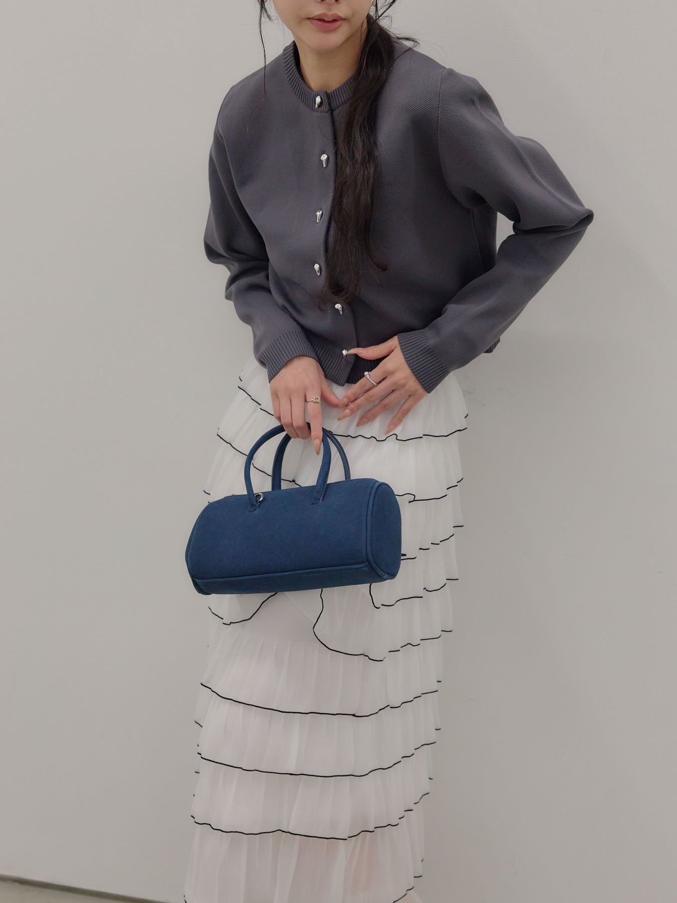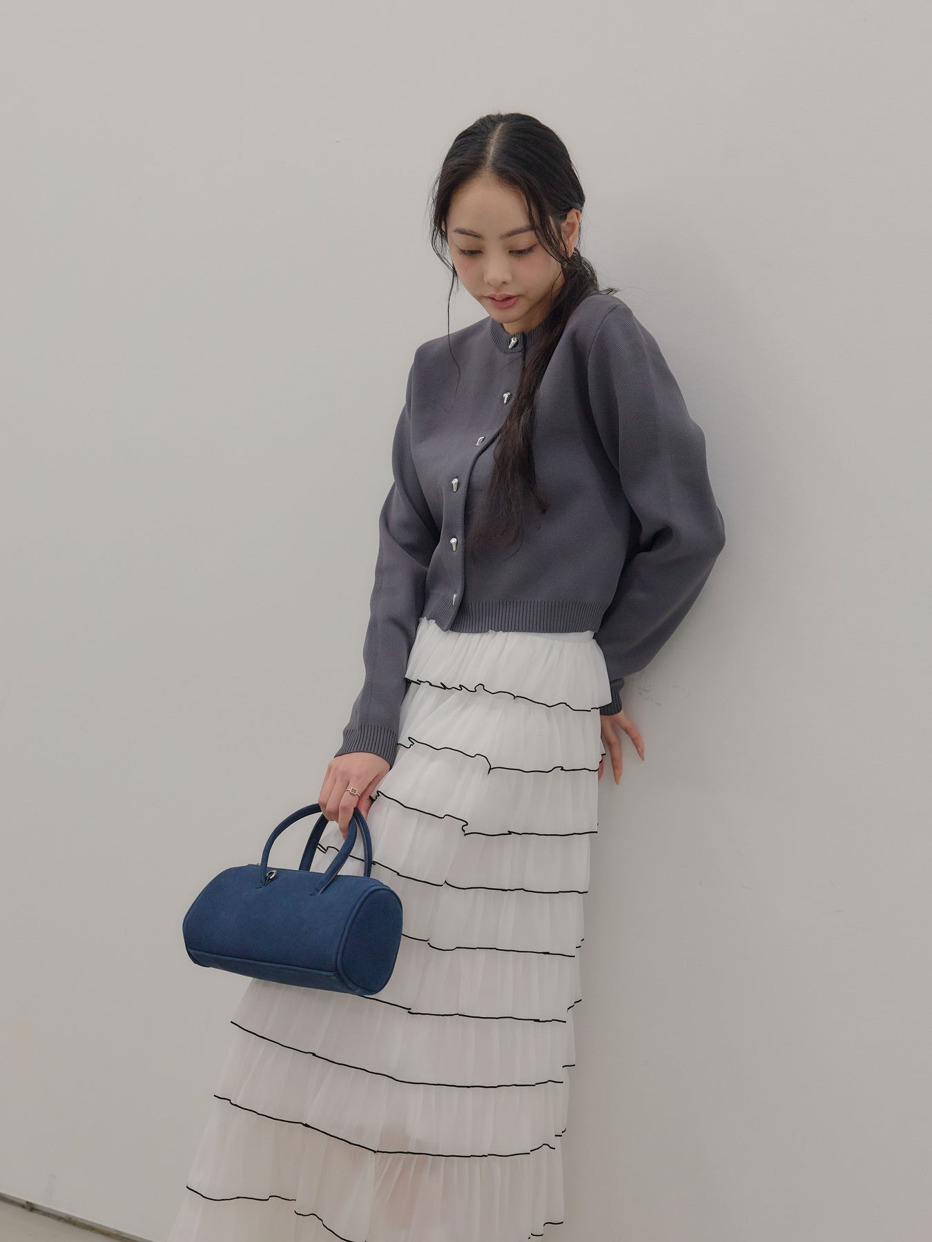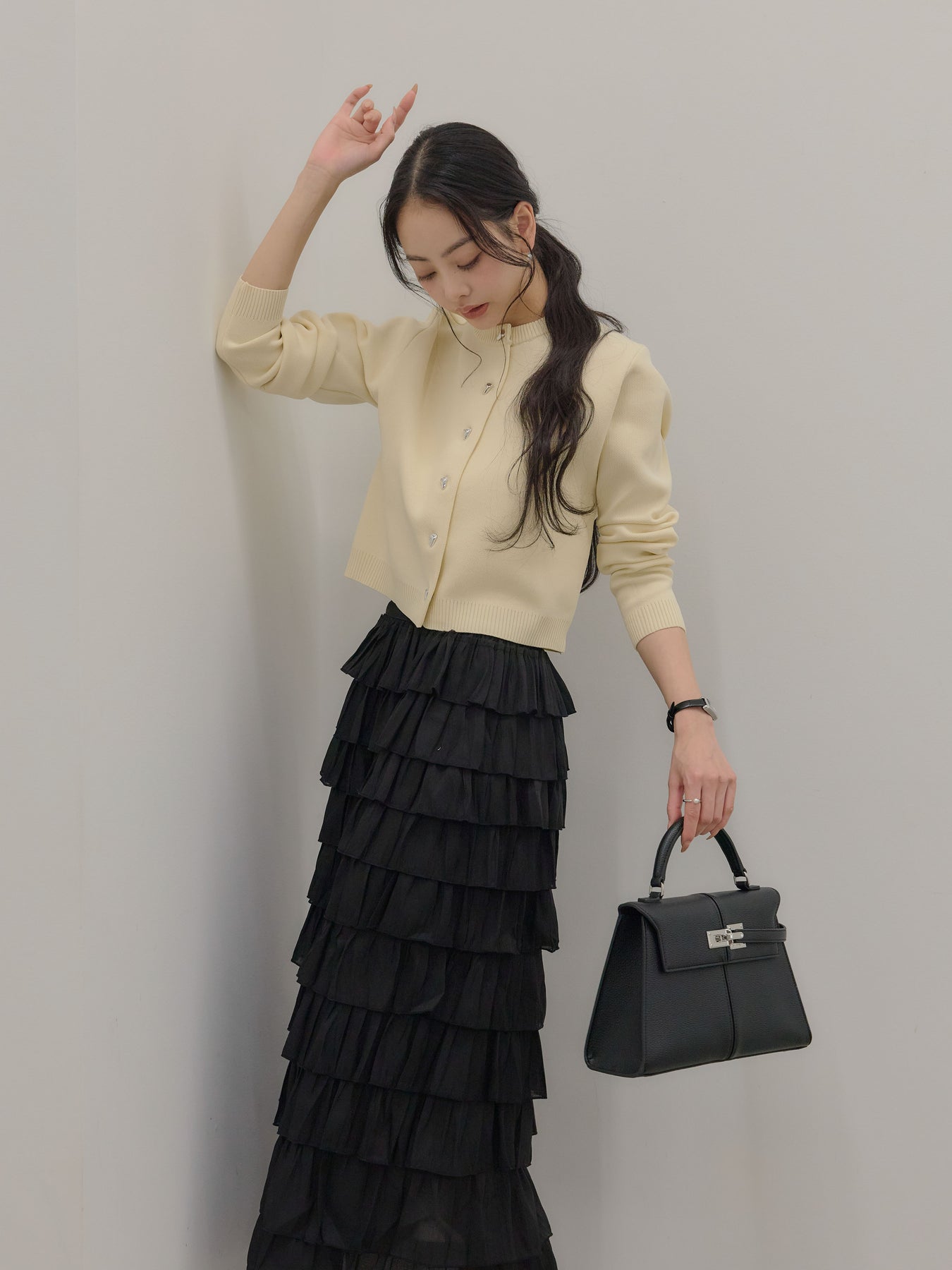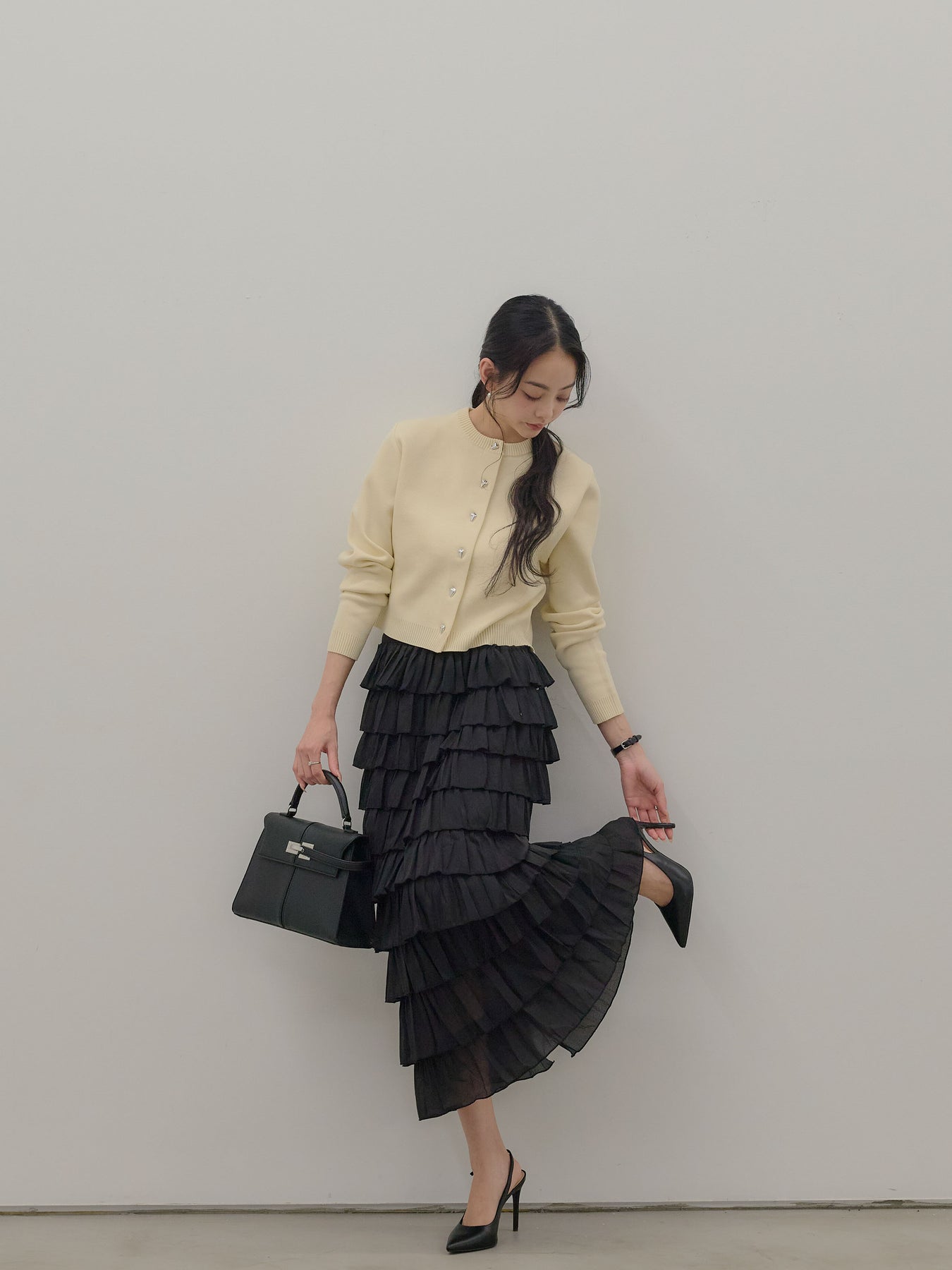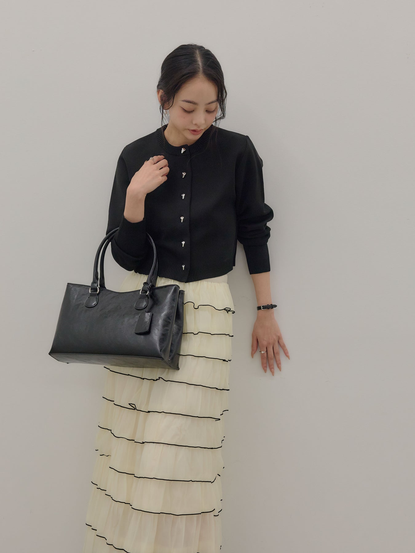 【SET】シルバーボタンコンパクトニットカーディガン+バイカラーフリルチュールスカート(2set)