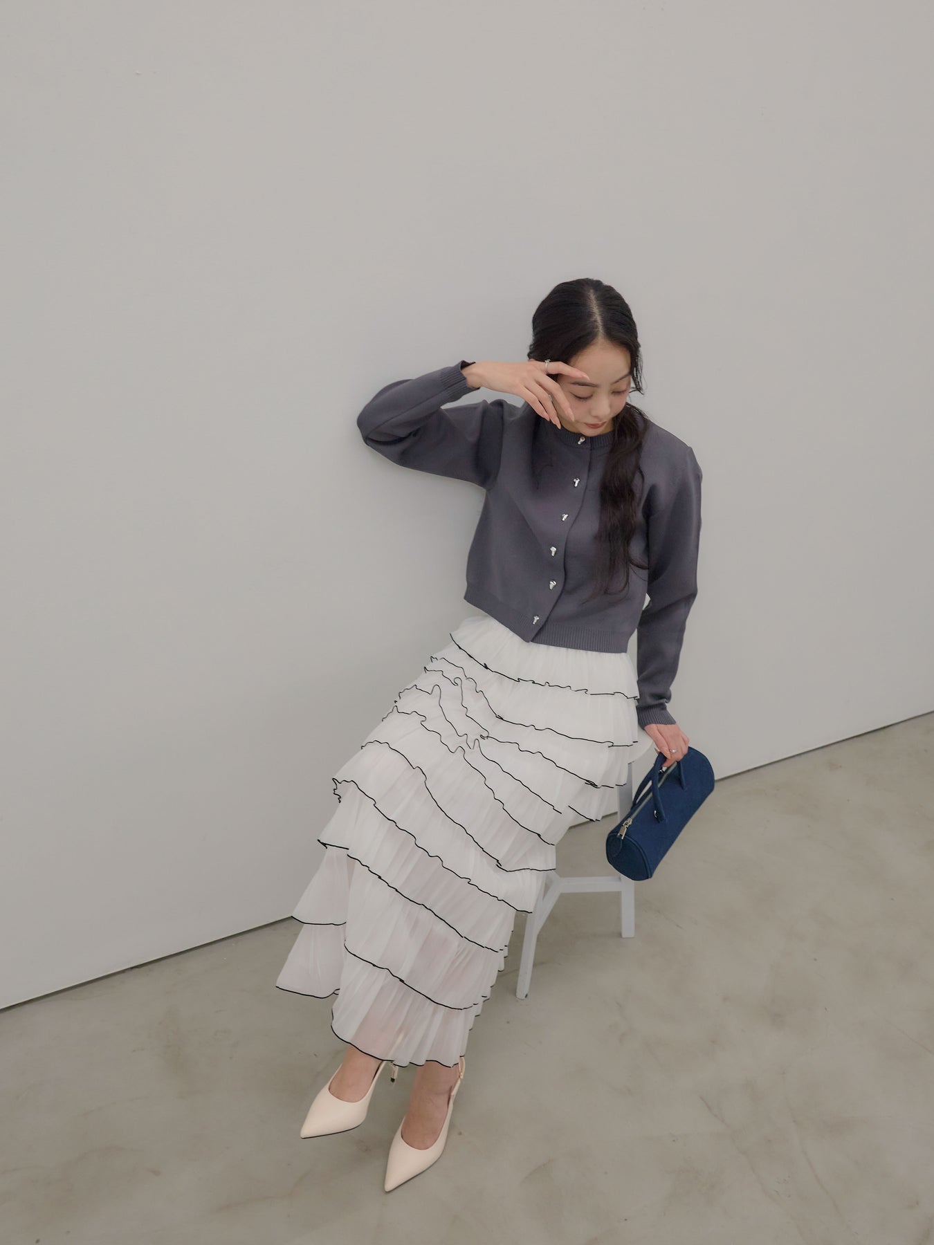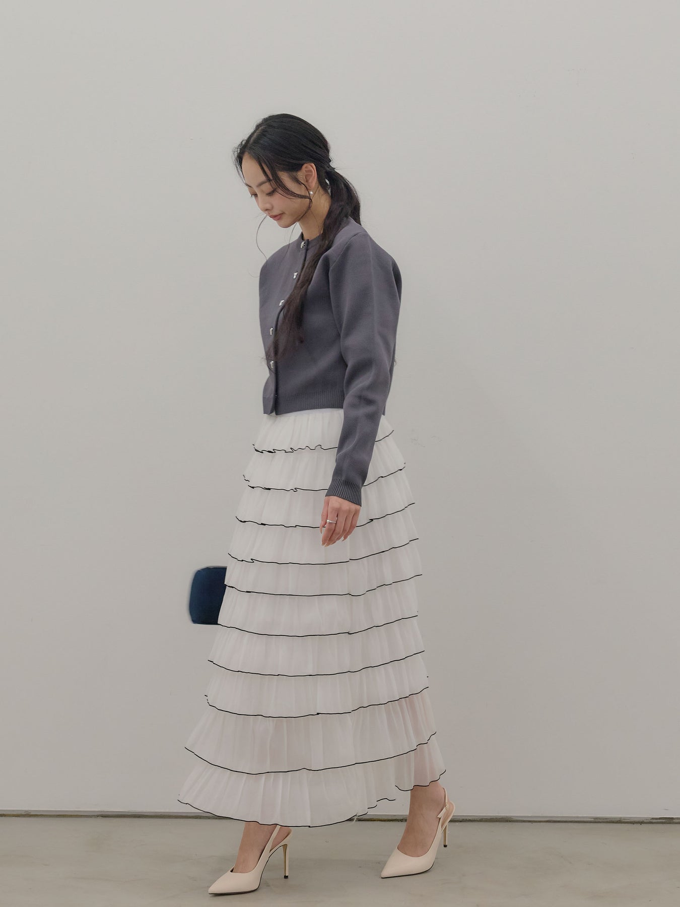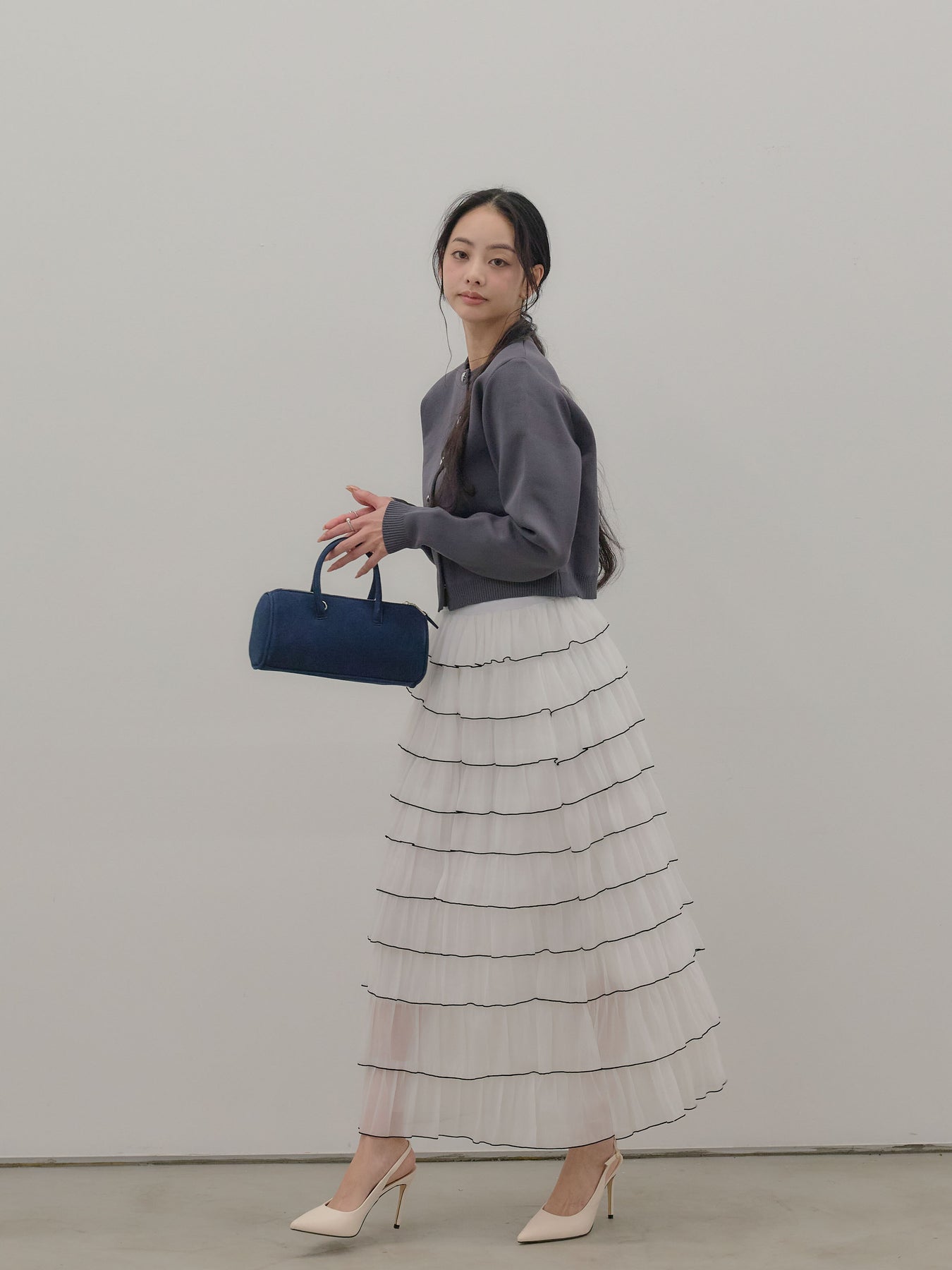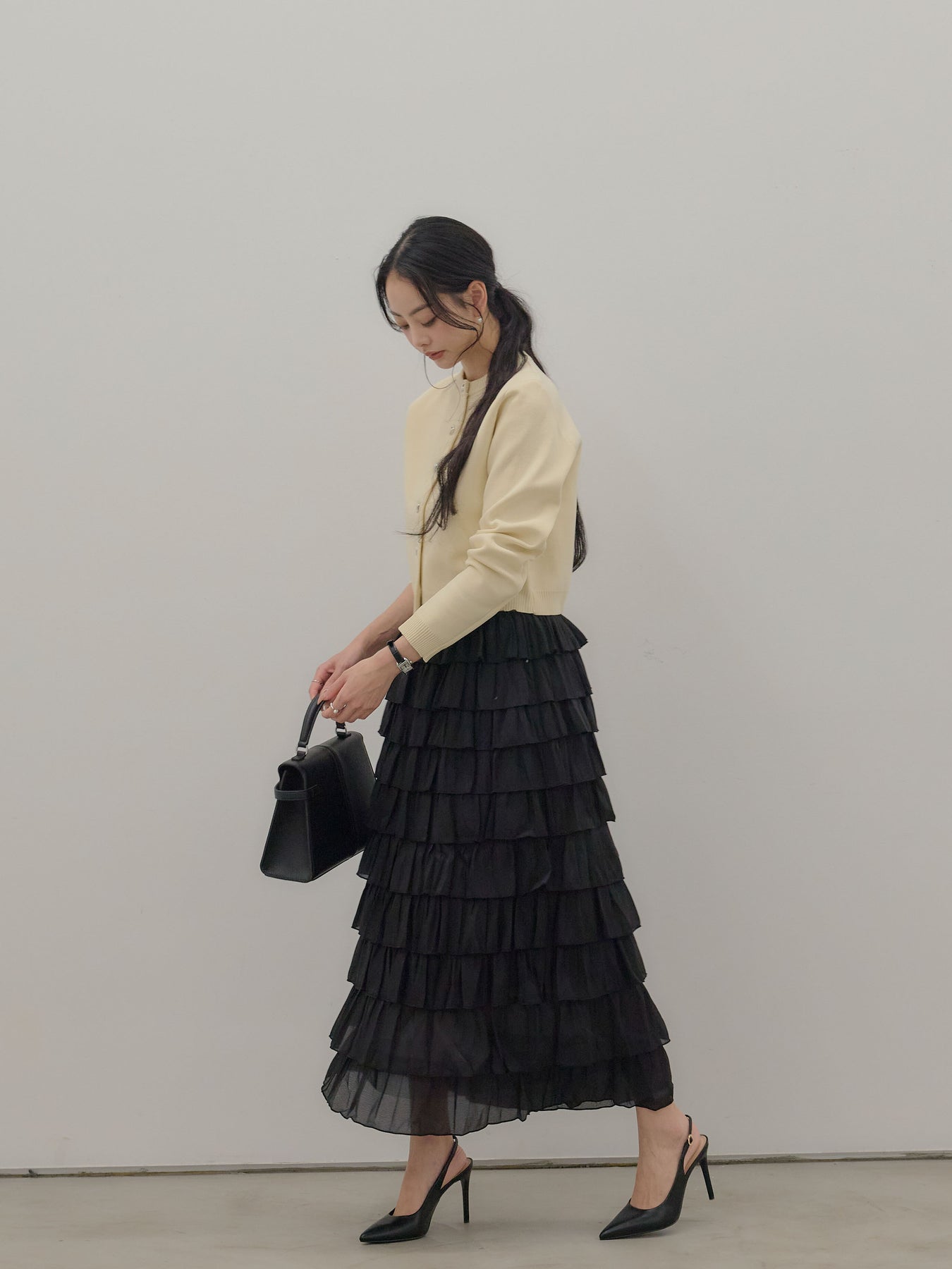 バイカラー配色が目を惹く、軽やかなフリルチュールスカート。 重なり合うチュールとフリルが動くたびに揺れ、女性らしい華やかさを演出します。 シンプルなトップス合わせでも着映えする、主役級スカートです。