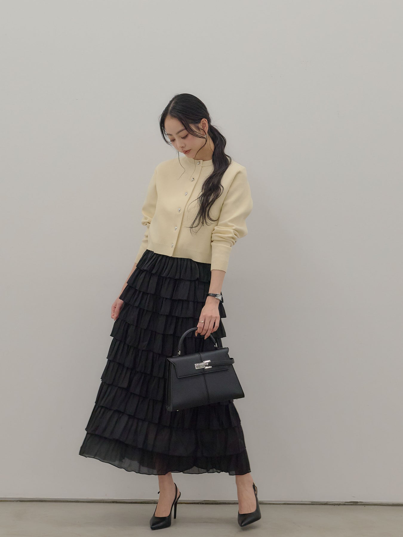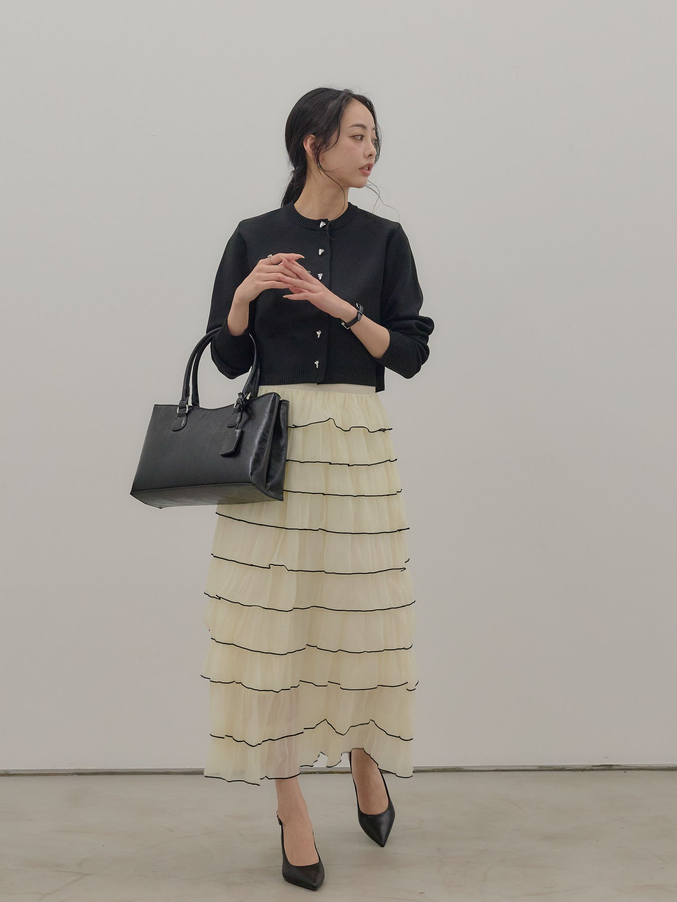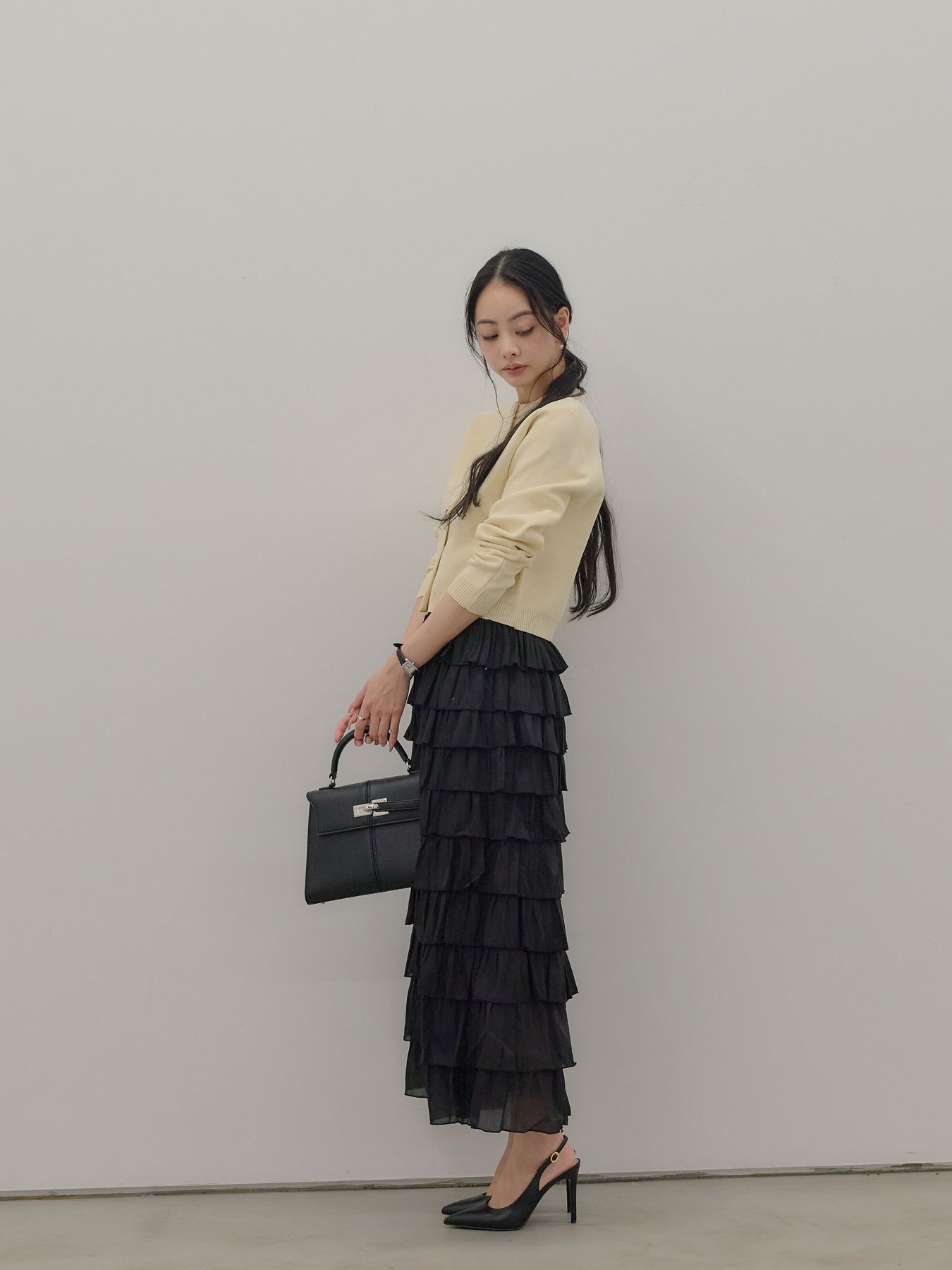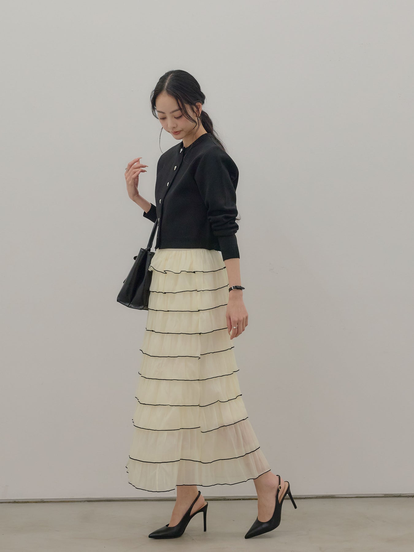 バイカラー配色が目を惹く、軽やかなフリルチュールスカート。 重なり合うチュールとフリルが動くたびに揺れ、女性らしい華やかさを演出します。 シンプルなトップス合わせでも着映えする、主役級スカートです。