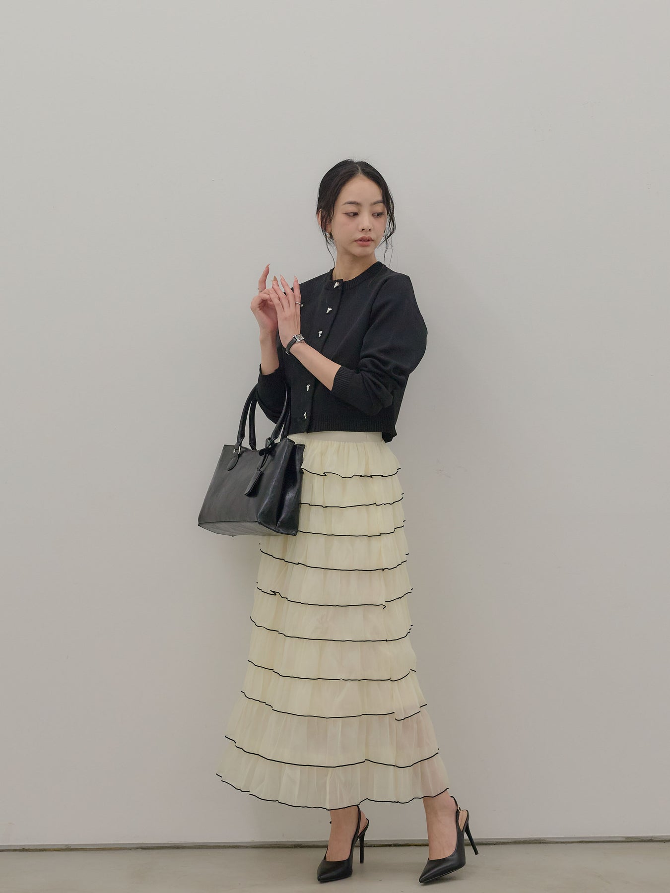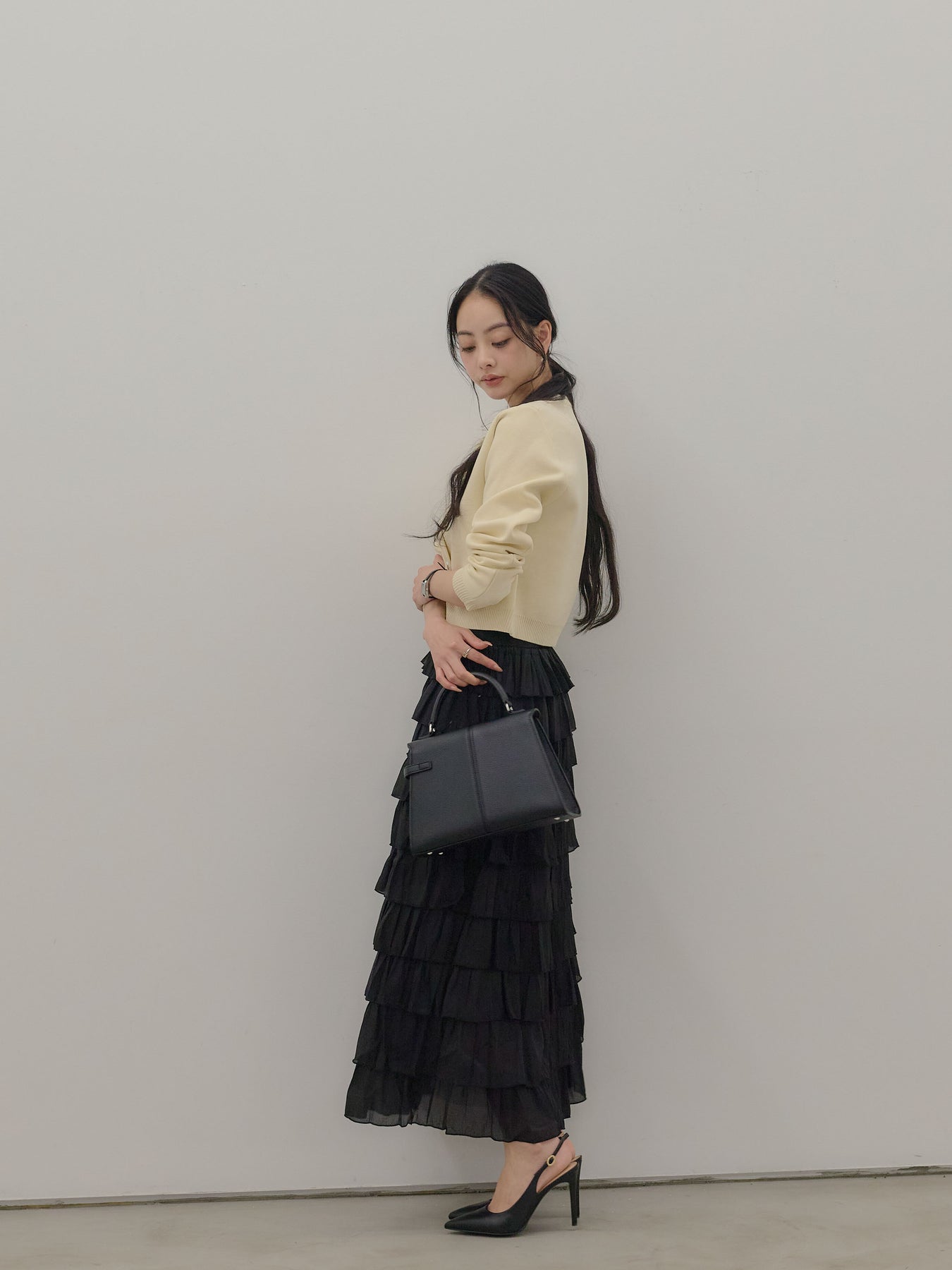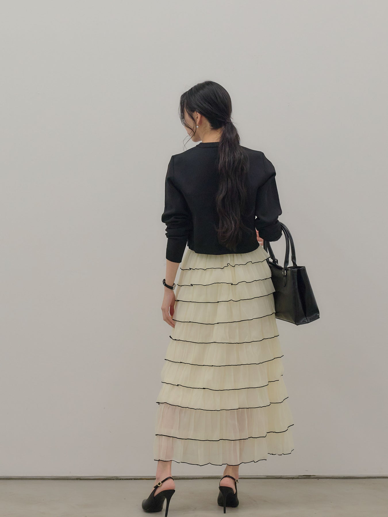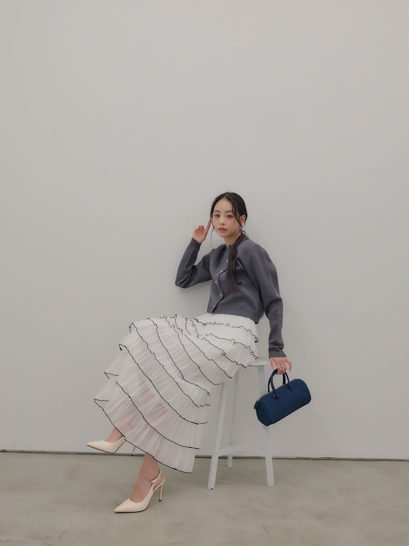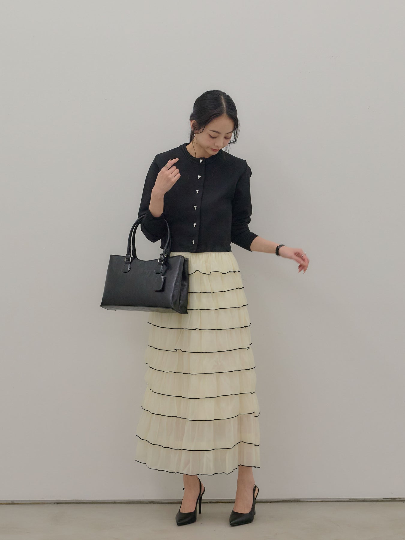 バイカラー配色が目を惹く、軽やかなフリルチュールスカート。 重なり合うチュールとフリルが動くたびに揺れ、女性らしい華やかさを演出します。 シンプルなトップス合わせでも着映えする、主役級スカートです。