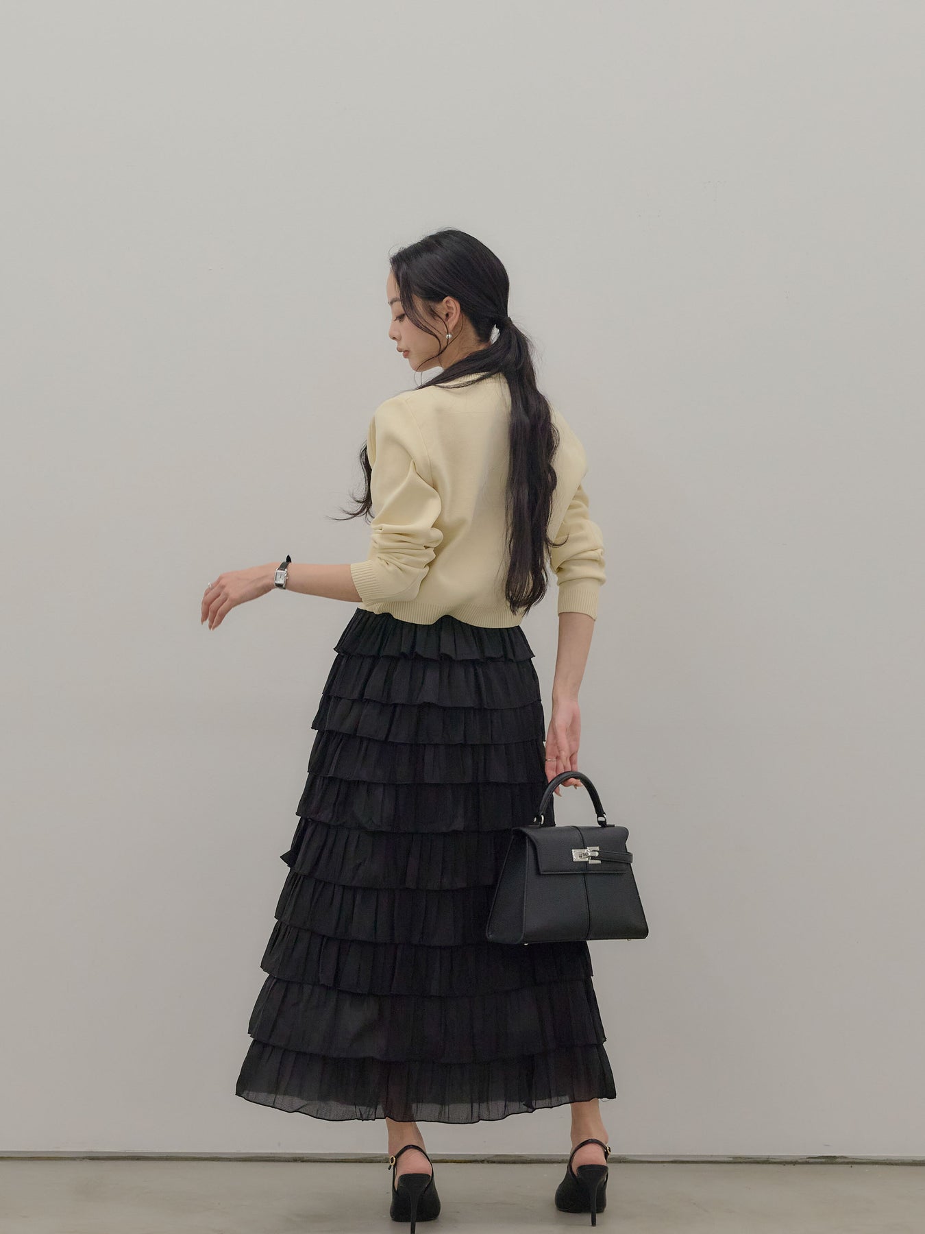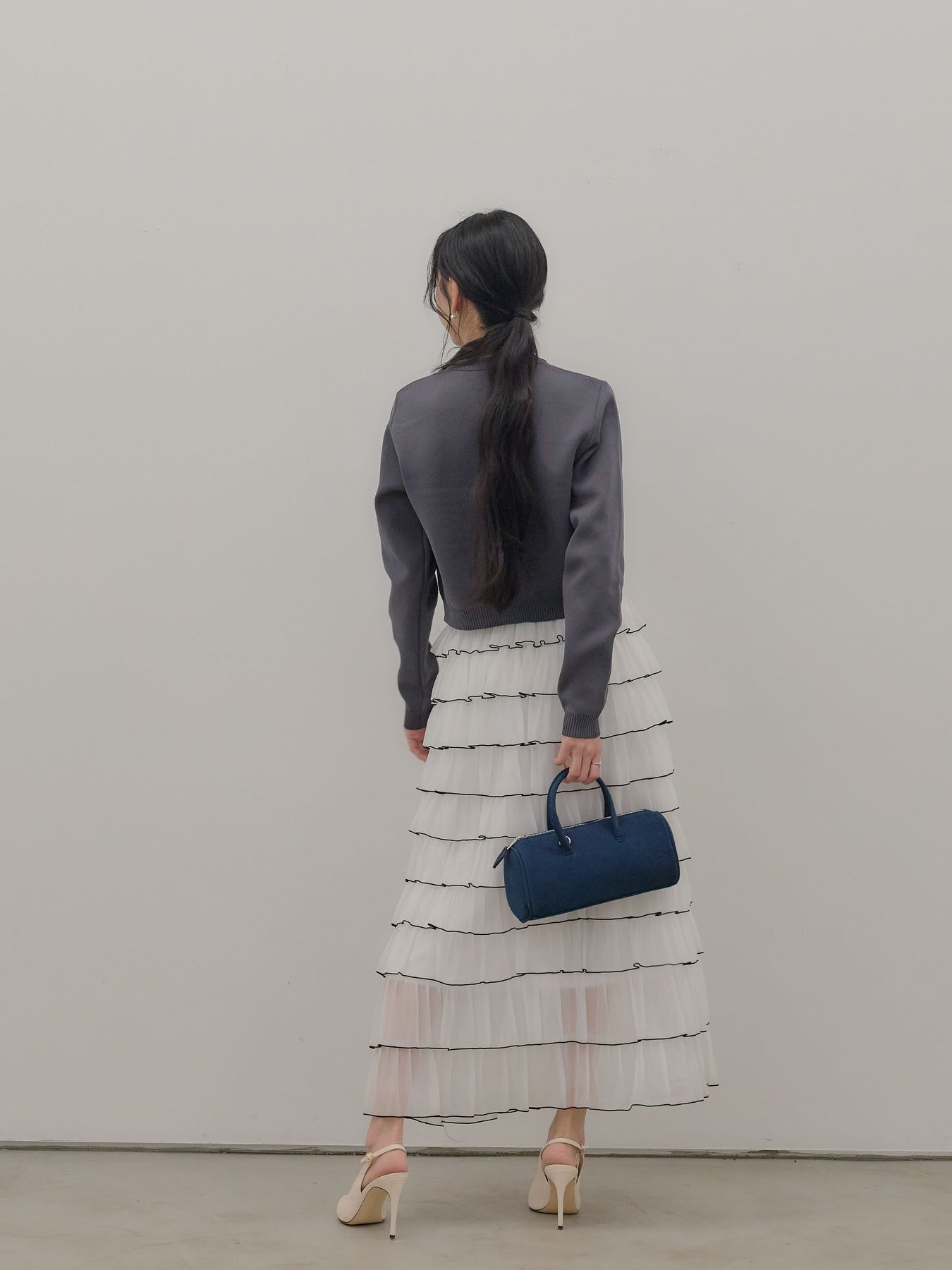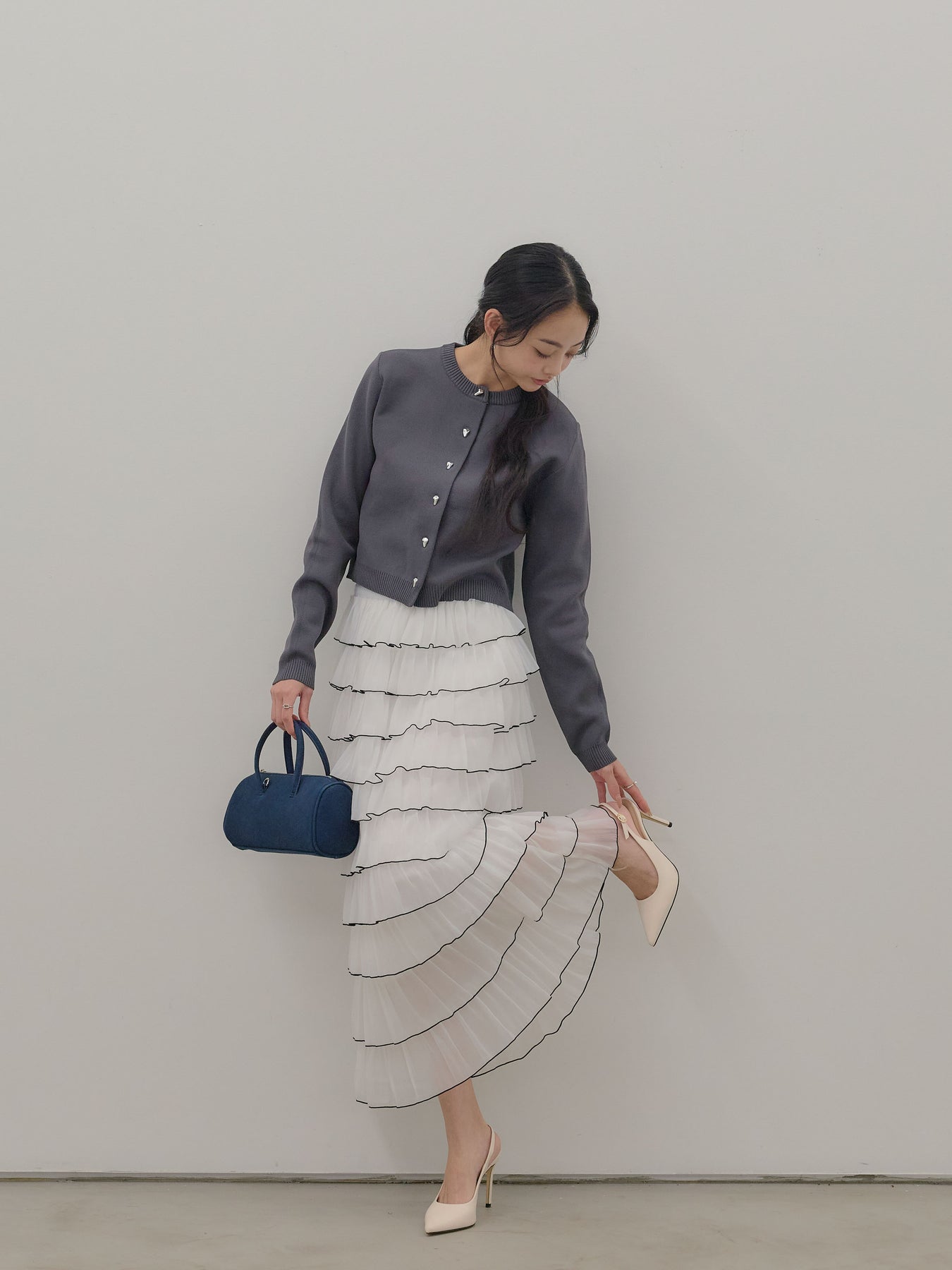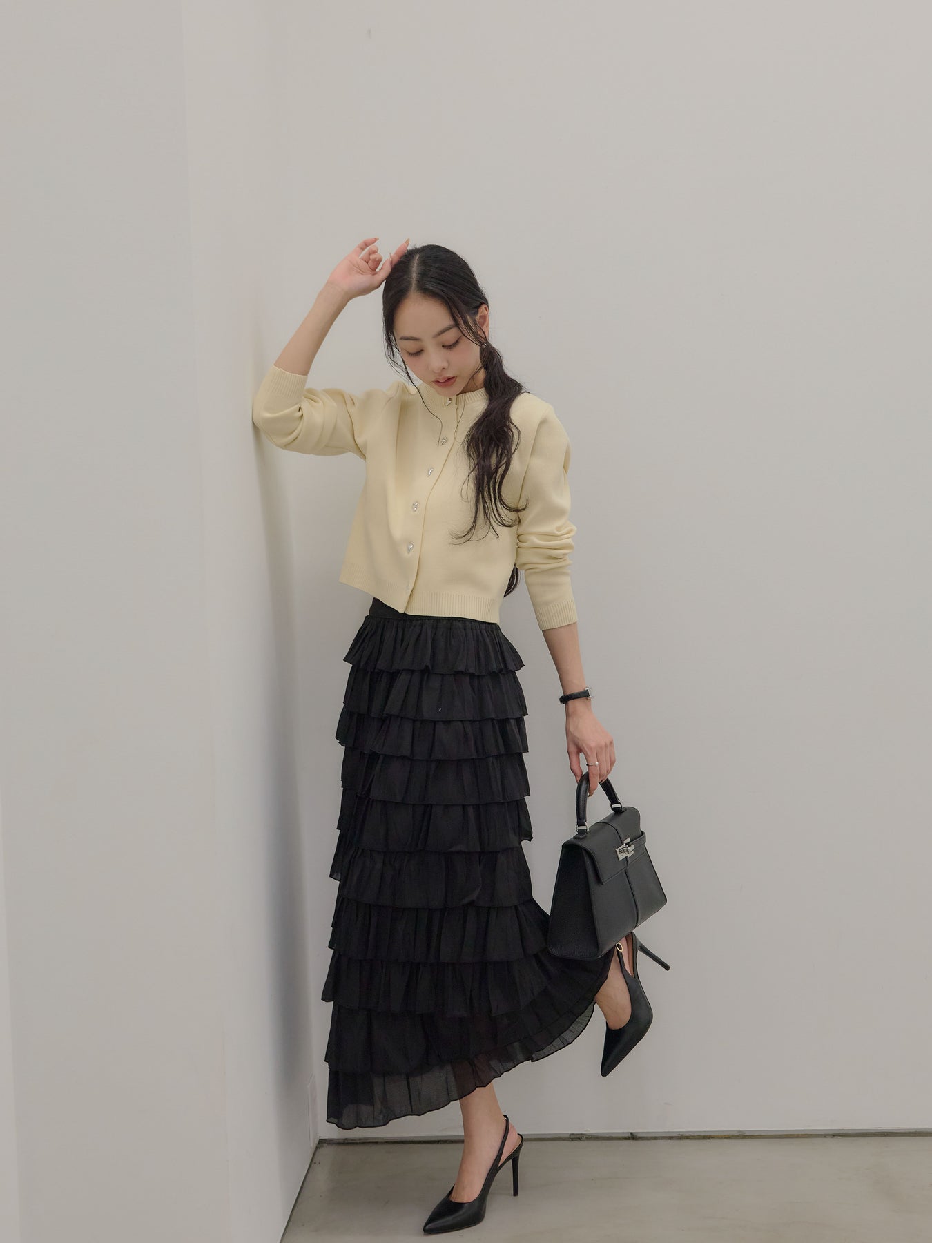 バイカラー配色が目を惹く、軽やかなフリルチュールスカート。 重なり合うチュールとフリルが動くたびに揺れ、女性らしい華やかさを演出します。 シンプルなトップス合わせでも着映えする、主役級スカートです。
