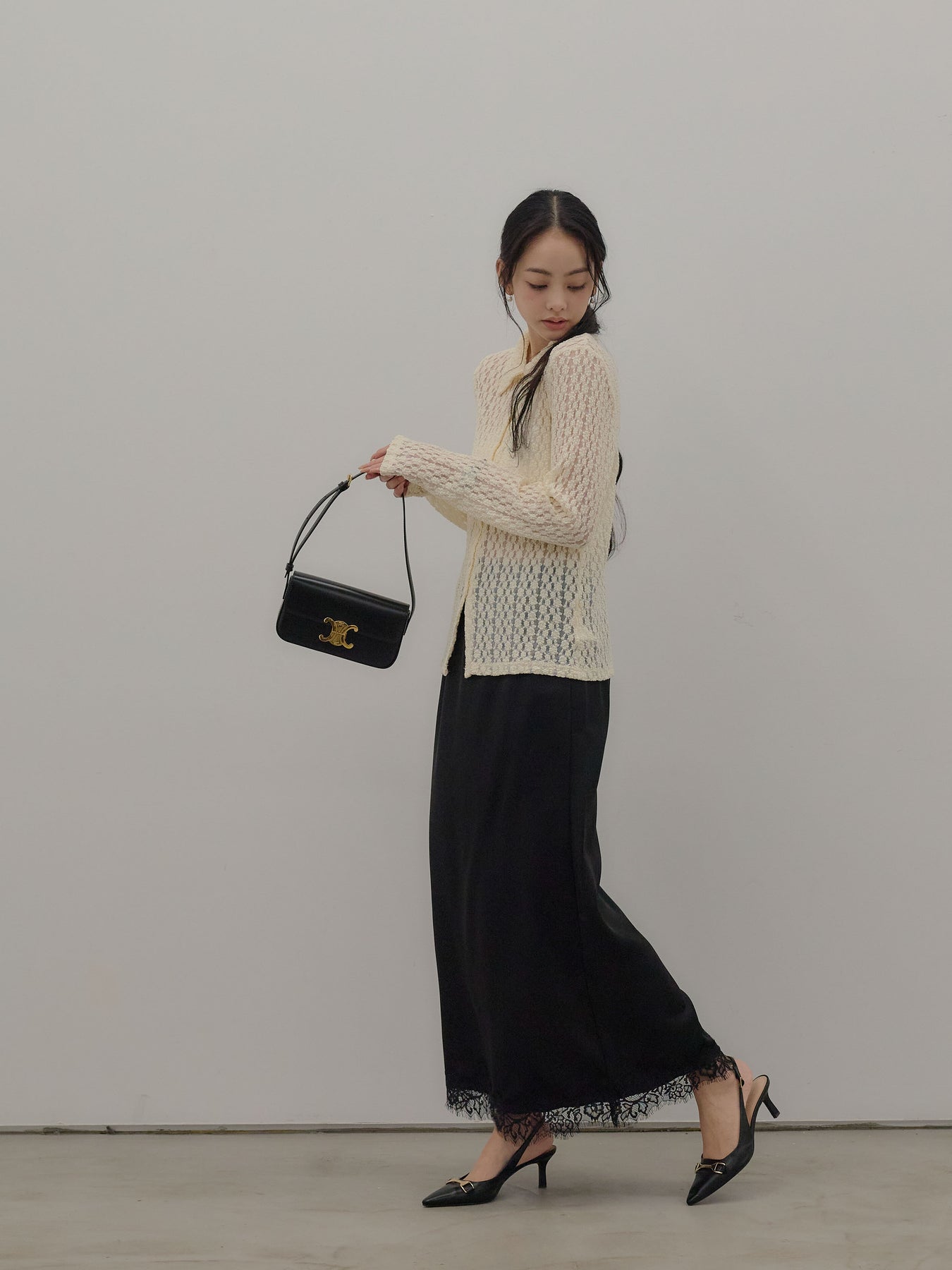 しなやかなサテン素材に、裾のレースディテールが印象的なナロースカート。