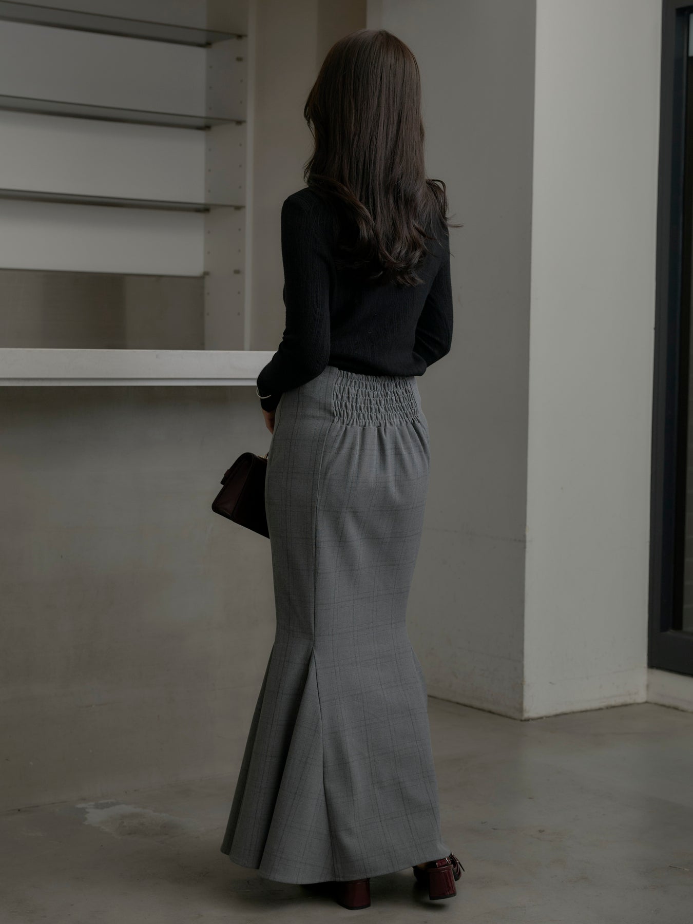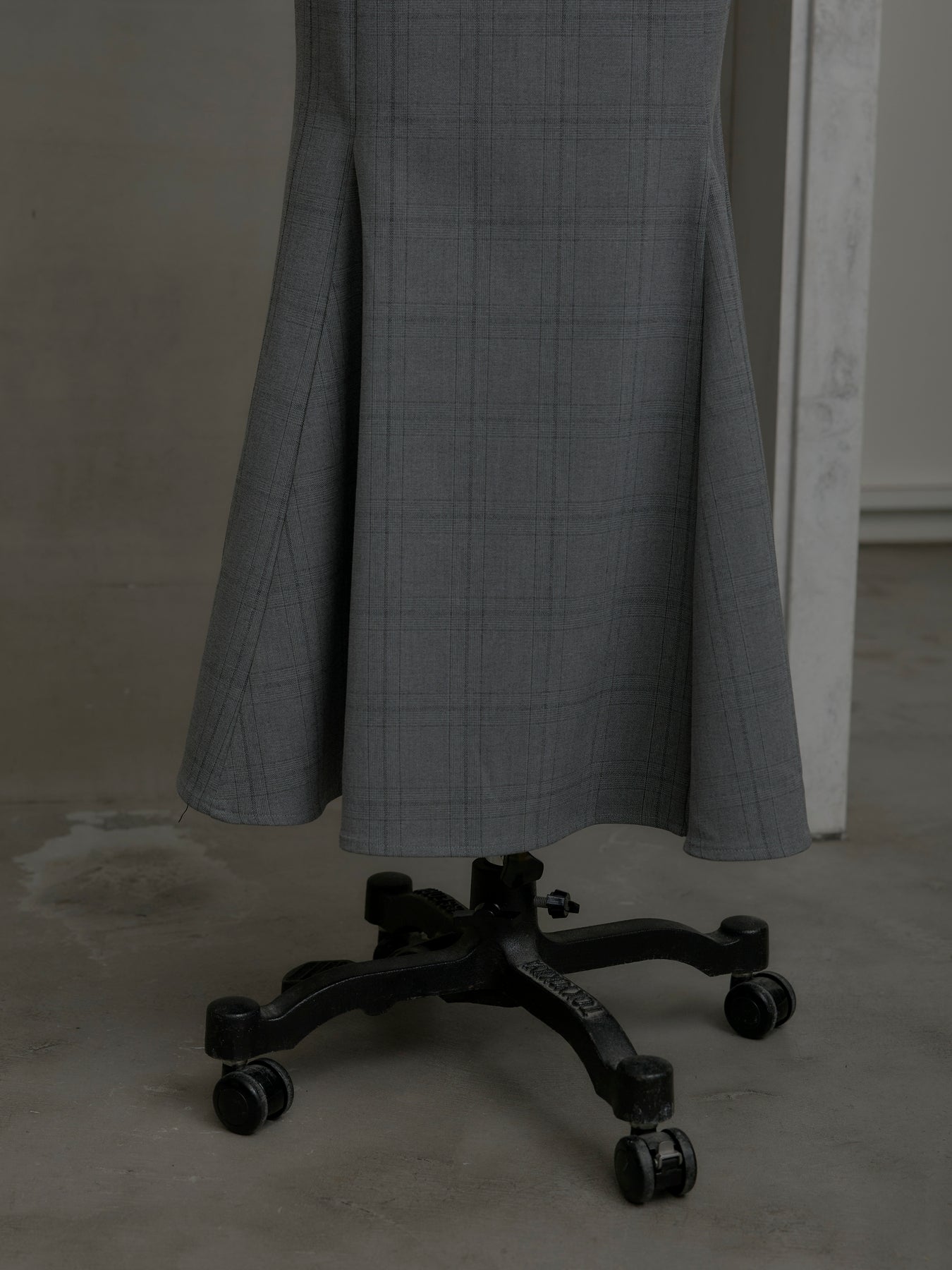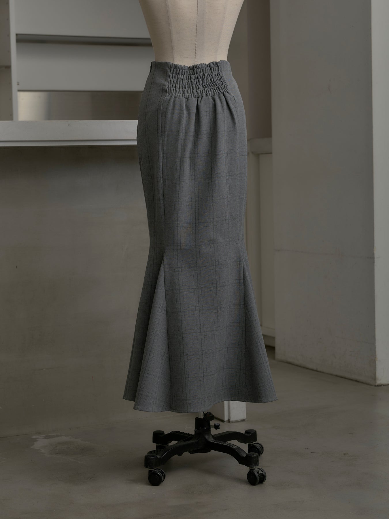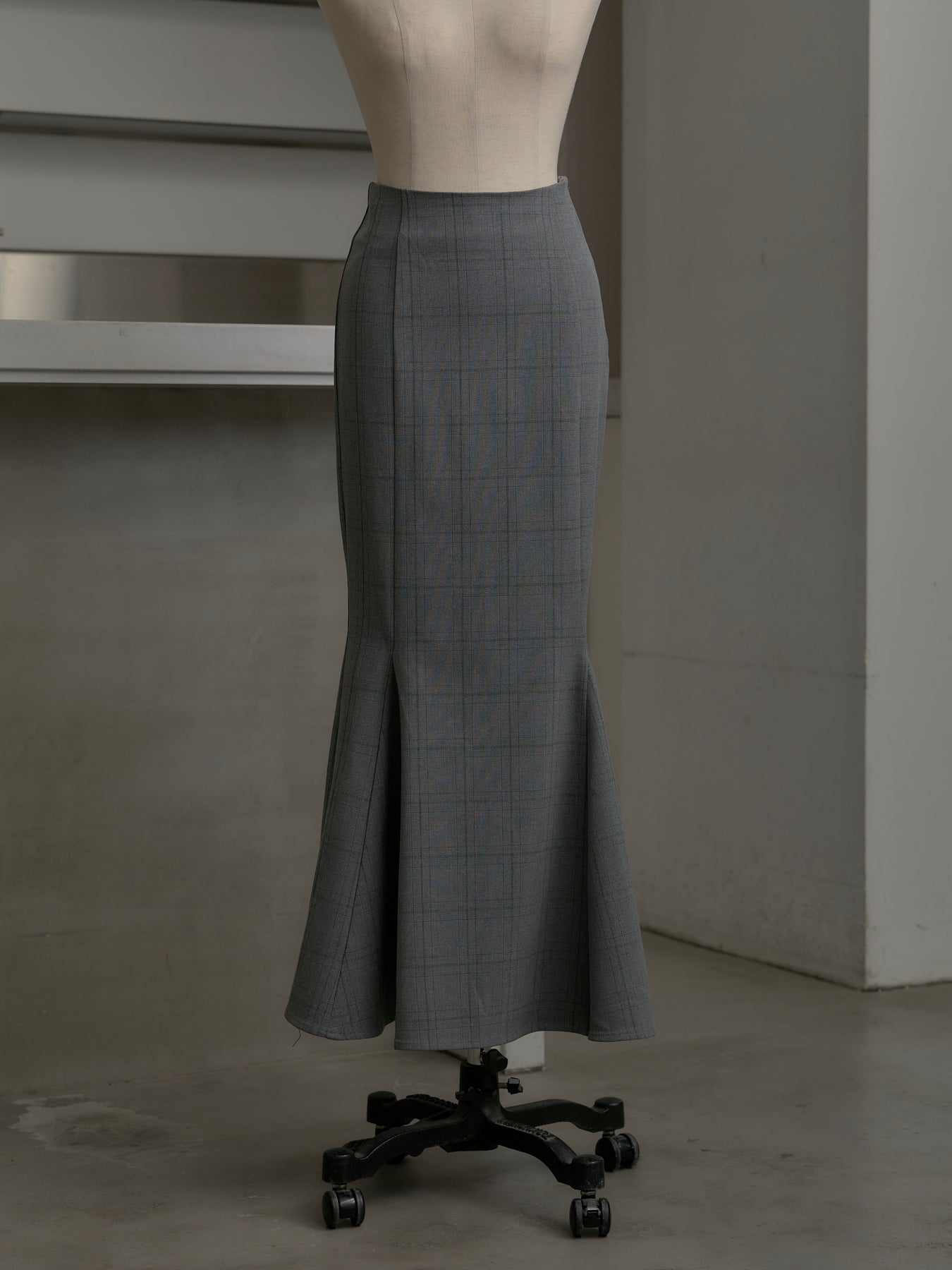 【モデル着用サイズ:M】 上品なチェック柄が印象的なマーメイドスカート。 ヒップラインを美しく見せるフィット感と、裾に向かって広がるシルエットが魅力。 落ち着いた雰囲気の中に華やかさを添え、シーズンコーデを品よくまとめる一枚。