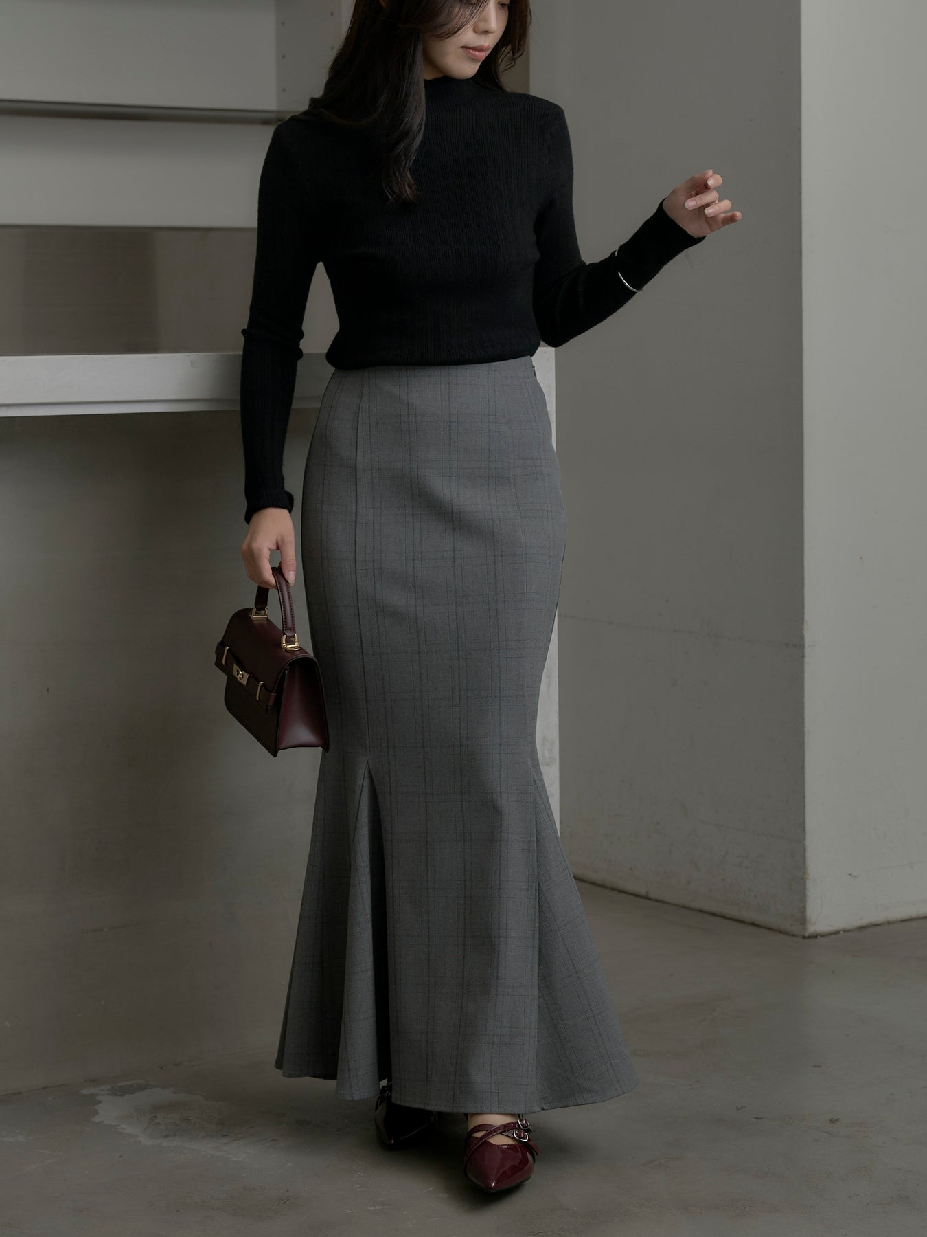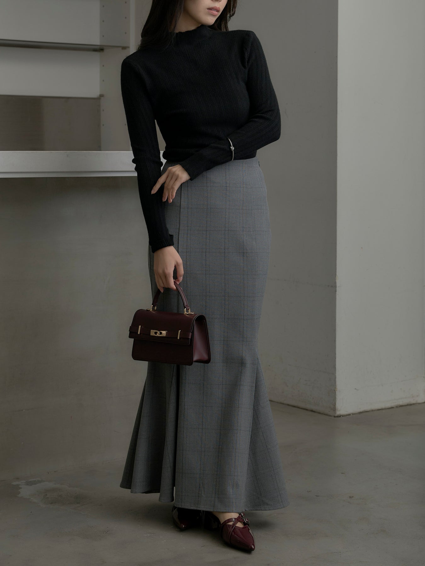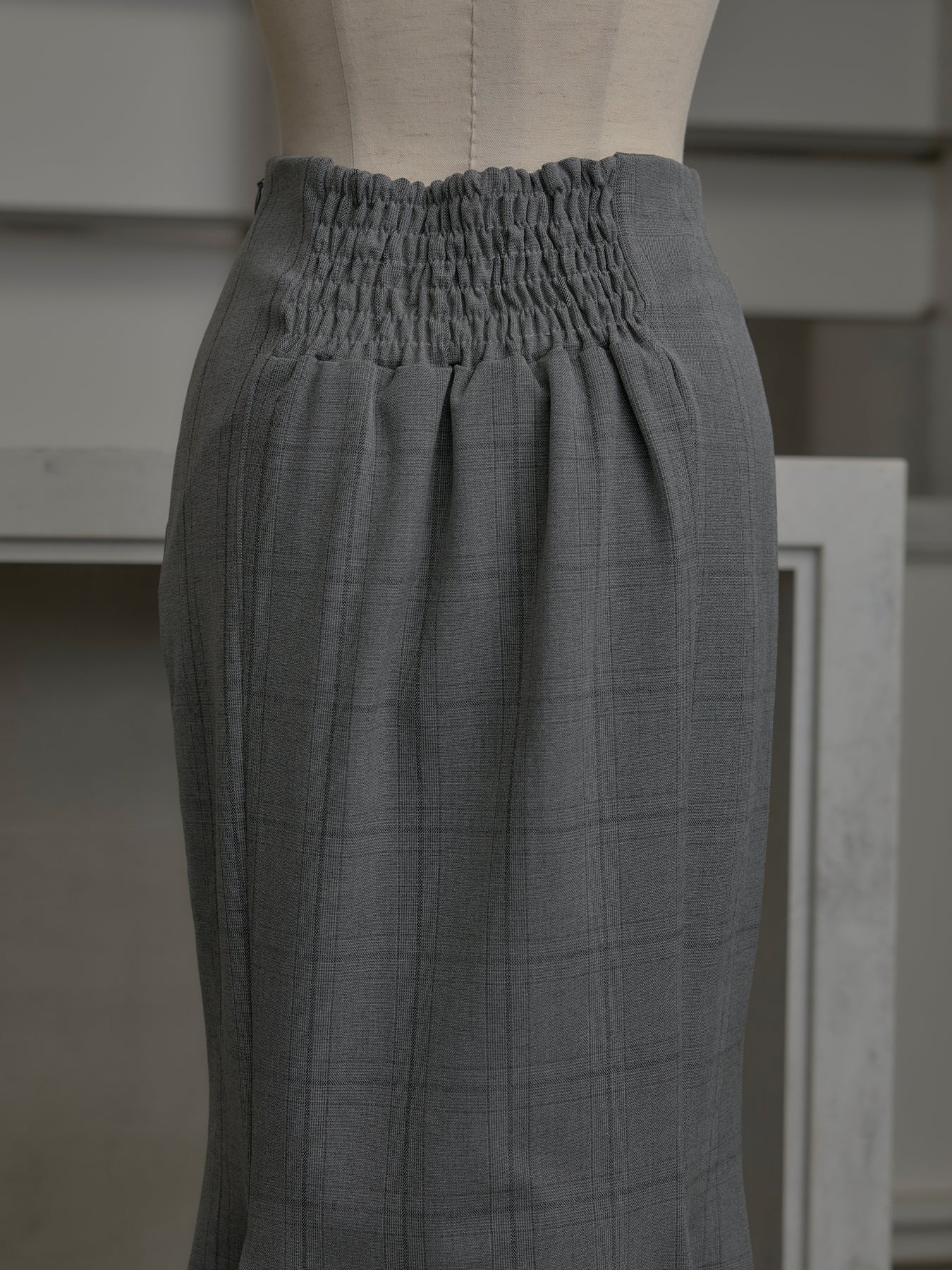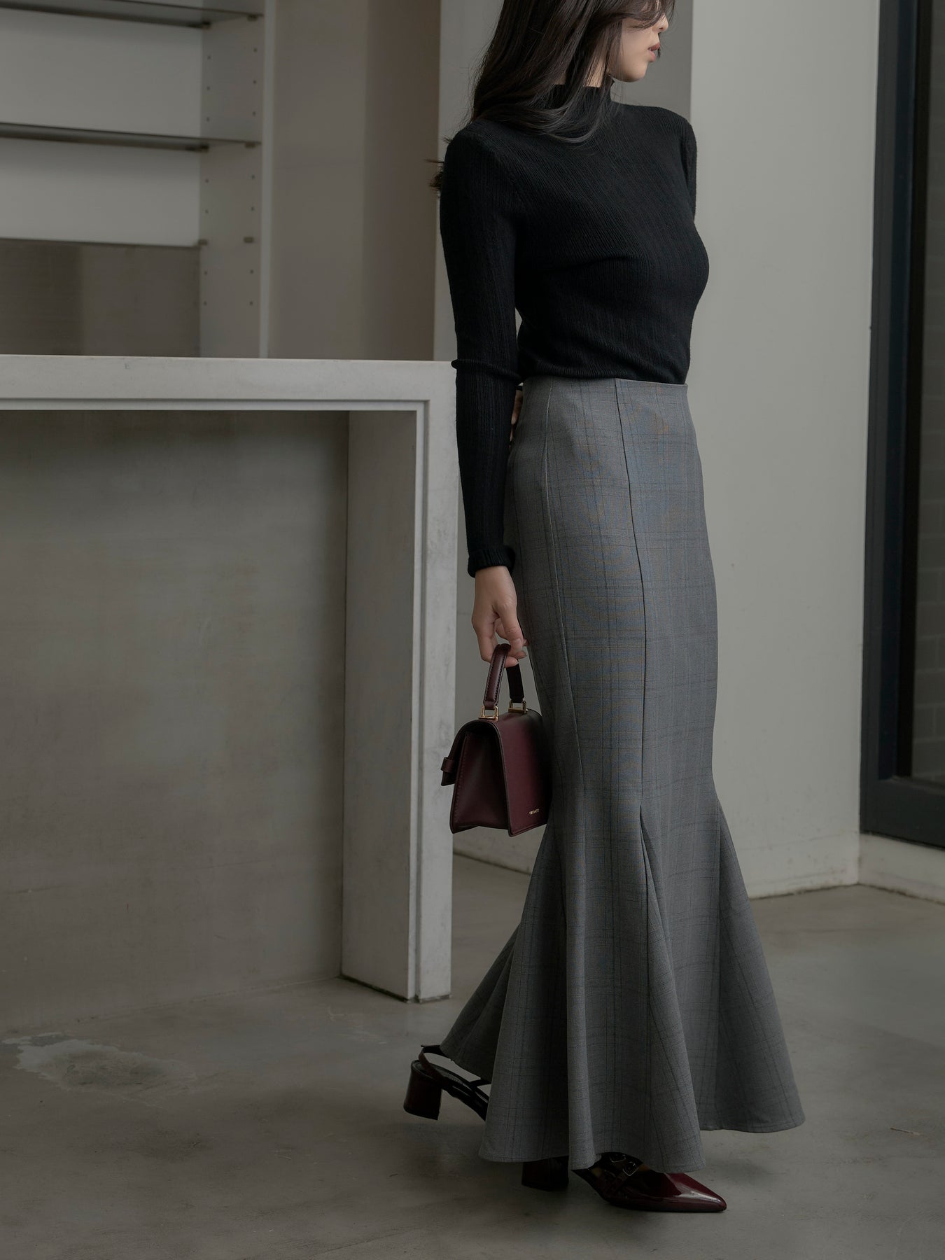 【モデル着用サイズ:M】 上品なチェック柄が印象的なマーメイドスカート。 ヒップラインを美しく見せるフィット感と、裾に向かって広がるシルエットが魅力。 落ち着いた雰囲気の中に華やかさを添え、シーズンコーデを品よくまとめる一枚。