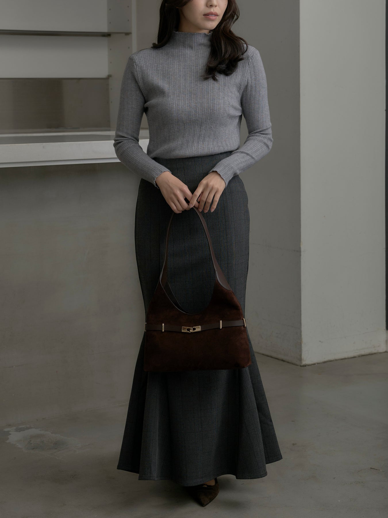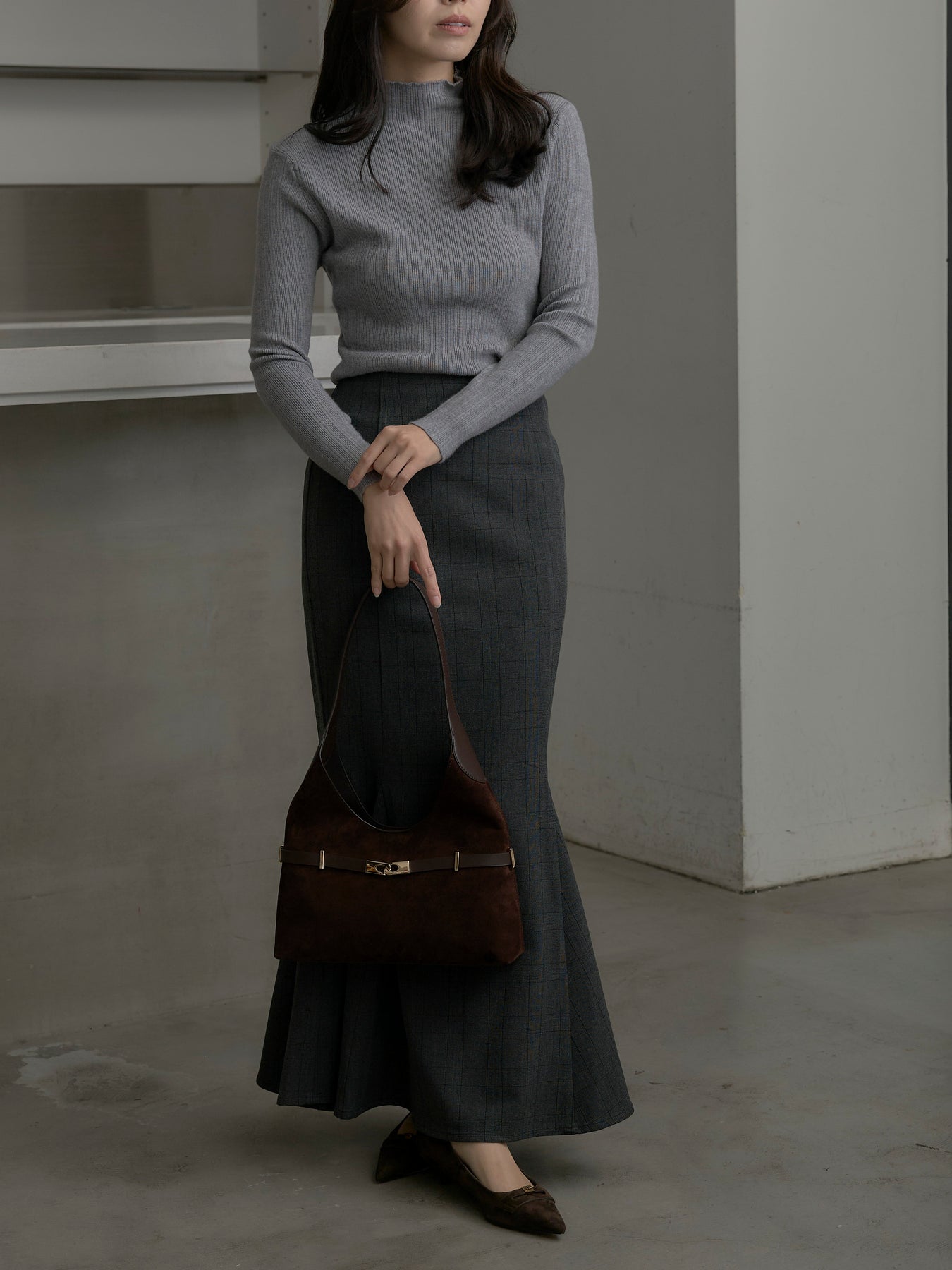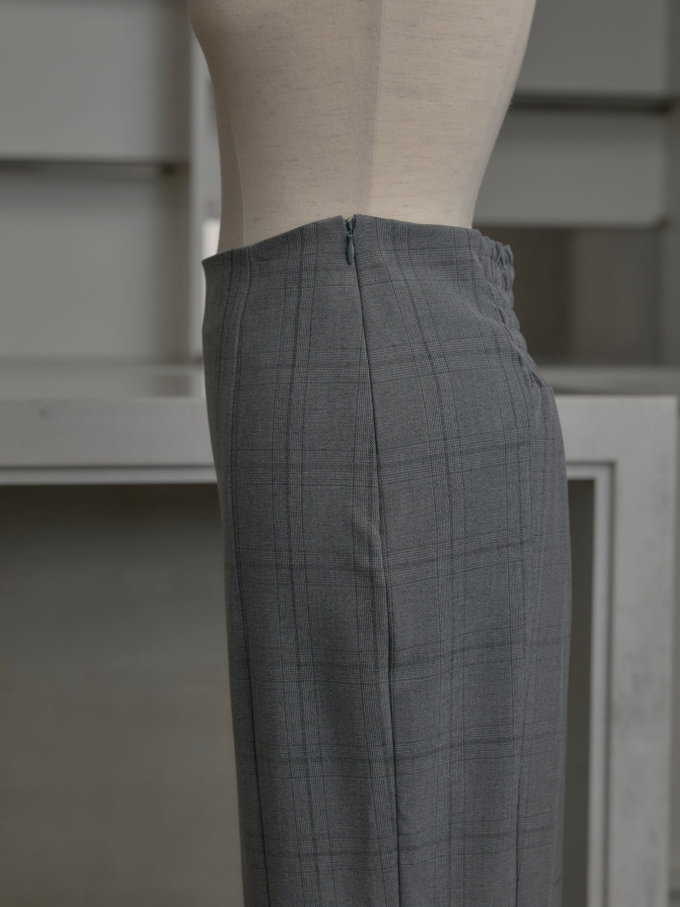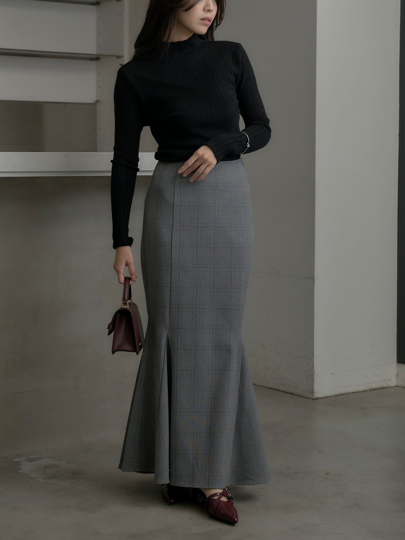 【モデル着用サイズ:M】 上品なチェック柄が印象的なマーメイドスカート。 ヒップラインを美しく見せるフィット感と、裾に向かって広がるシルエットが魅力。 落ち着いた雰囲気の中に華やかさを添え、シーズンコーデを品よくまとめる一枚。