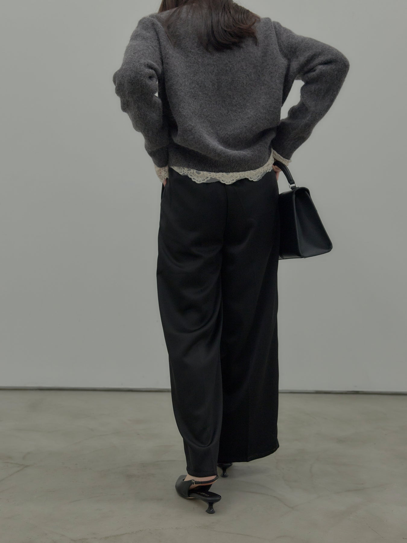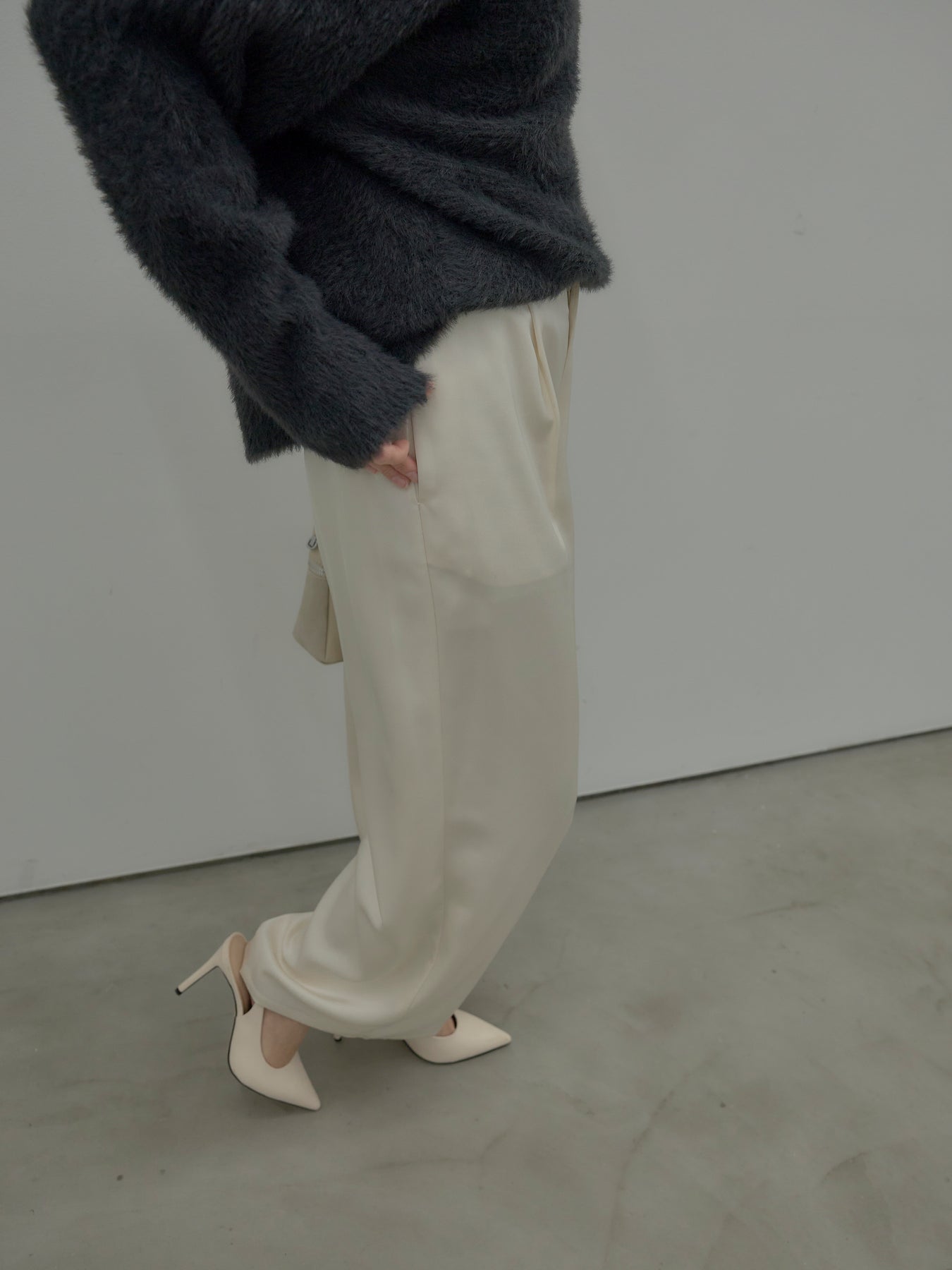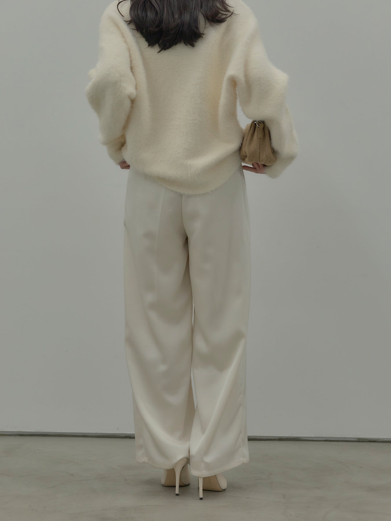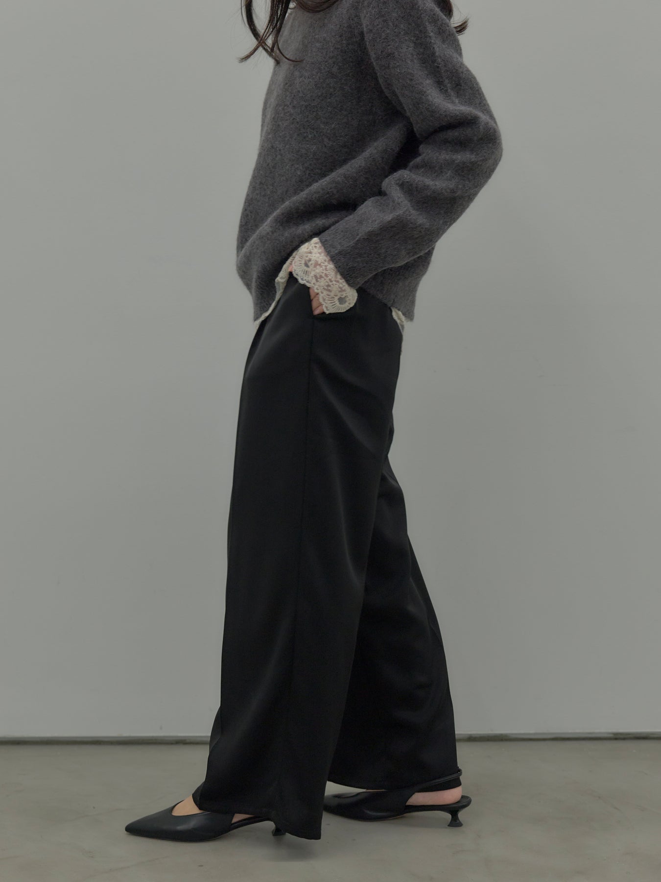 艶感控えめのサテン素材でデイリー使いしやすいので様々なコーディネートに合わせていただけます。オフィススタイルから特別な日のスタイルにもマッチ。センタープレスデザインで足をすらっとまっすぐ見せてくれるのも嬉しいポイント。程よくゆとりを持たせたストレートシルエット。後ろはゴムになっているので着心地も快適です。あえてベルトループなしのデザインにしているため、ウエスト周りがすっきり見え、トップスをインしたスタイルも美しく仕上がります。秋冬はニットに合わせて、オールシーズン活躍するボトムスです。