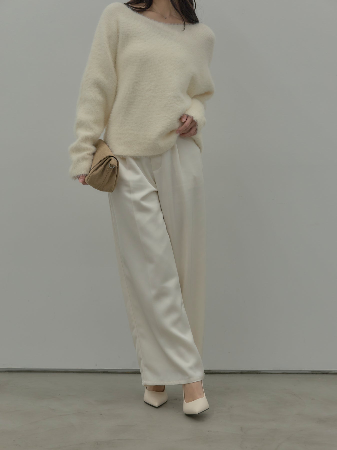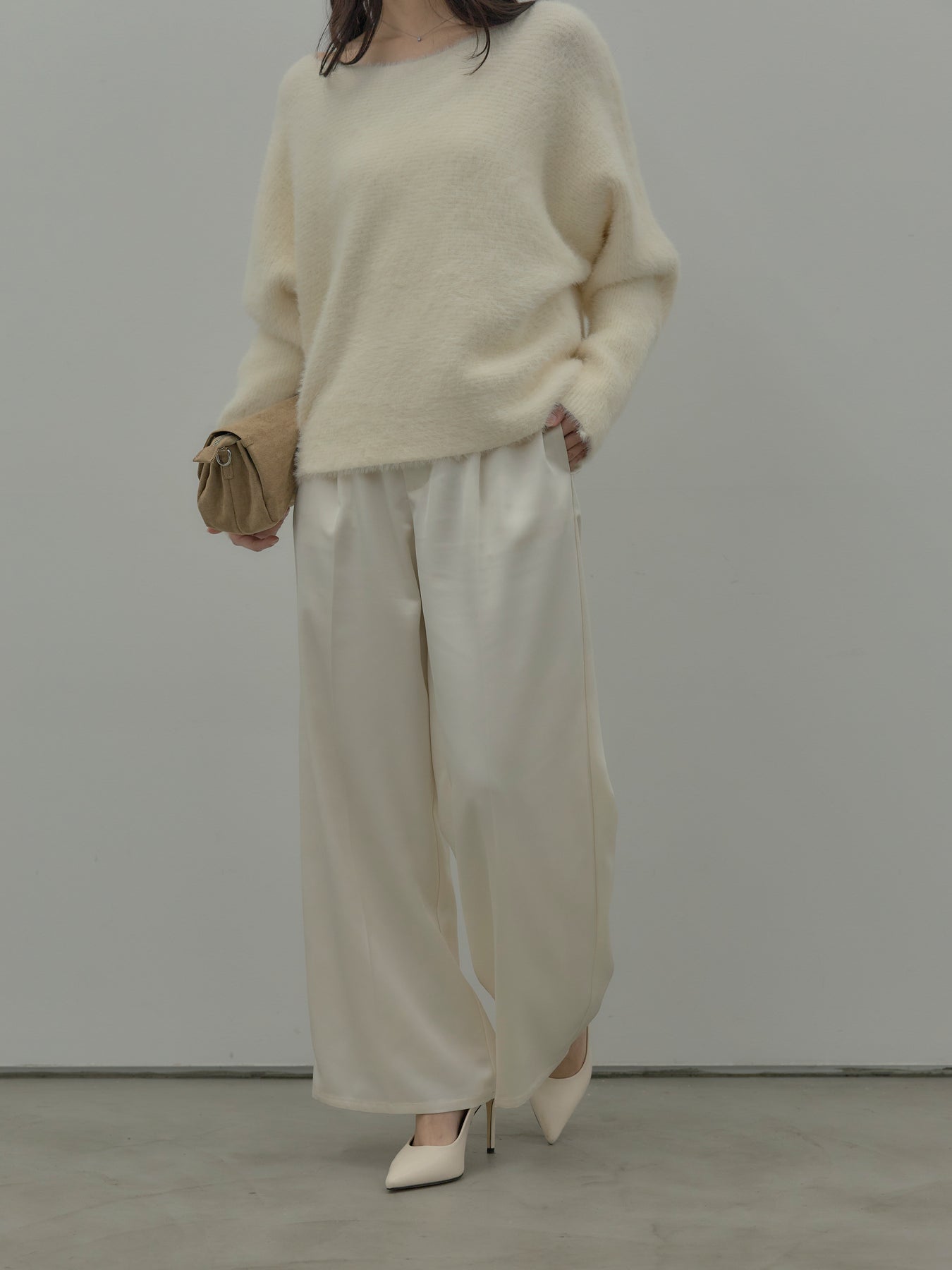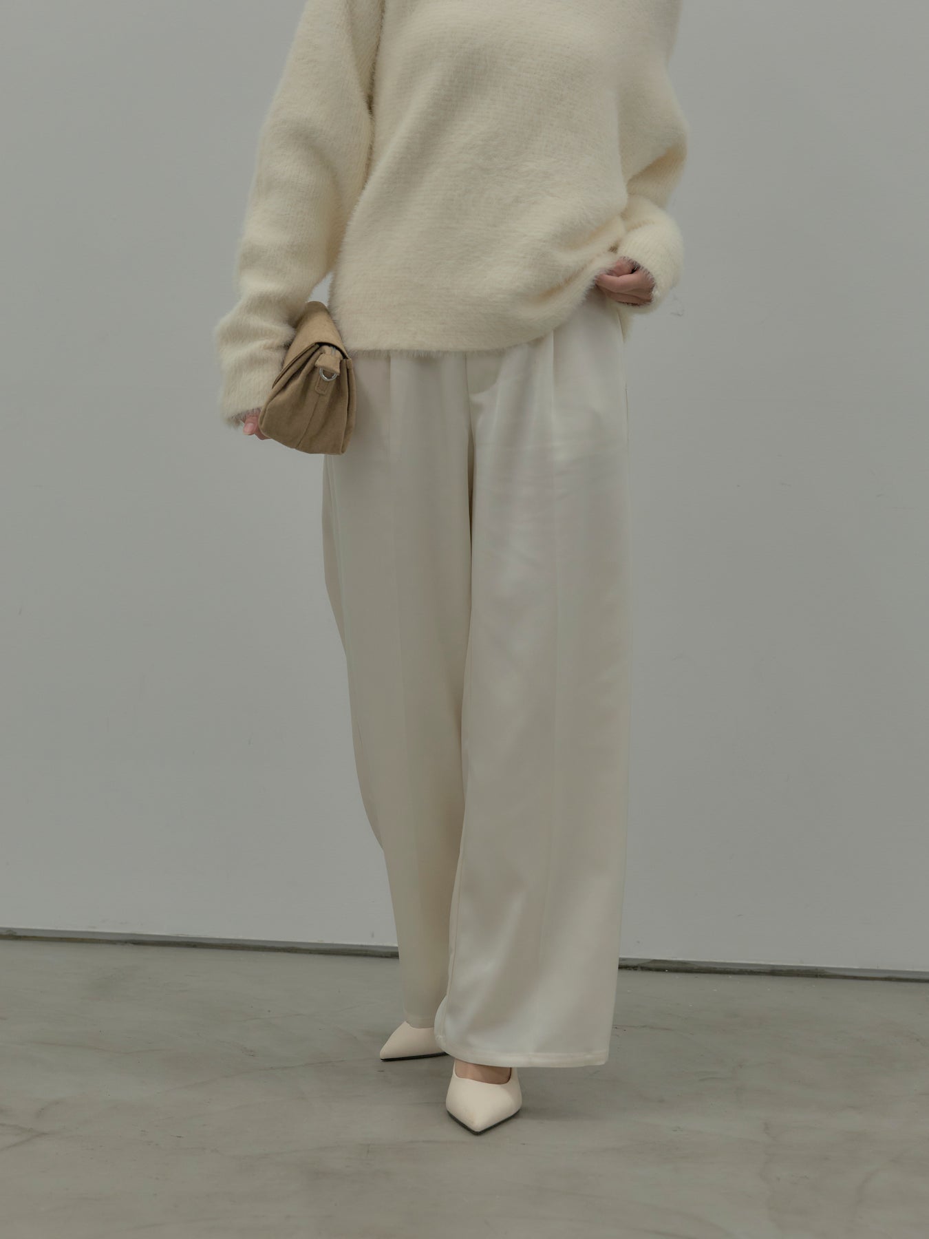 艶感控えめのサテン素材でデイリー使いしやすいので様々なコーディネートに合わせていただけます。オフィススタイルから特別な日のスタイルにもマッチ。センタープレスデザインで足をすらっとまっすぐ見せてくれるのも嬉しいポイント。程よくゆとりを持たせたストレートシルエット。後ろはゴムになっているので着心地も快適です。あえてベルトループなしのデザインにしているため、ウエスト周りがすっきり見え、トップスをインしたスタイルも美しく仕上がります。秋冬はニットに合わせて、オールシーズン活躍するボトムスです。