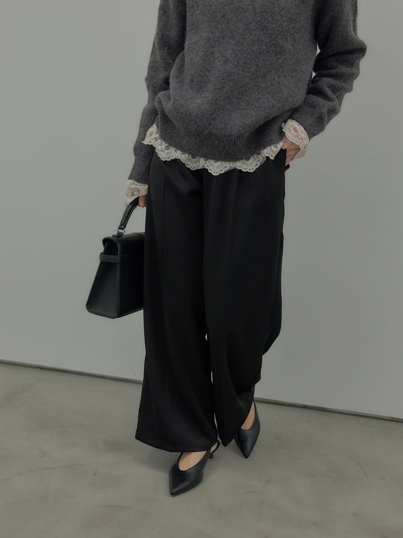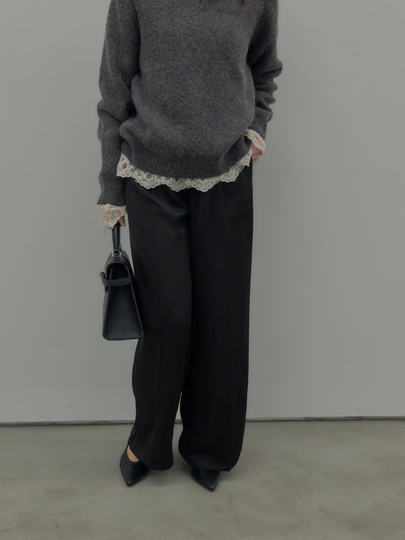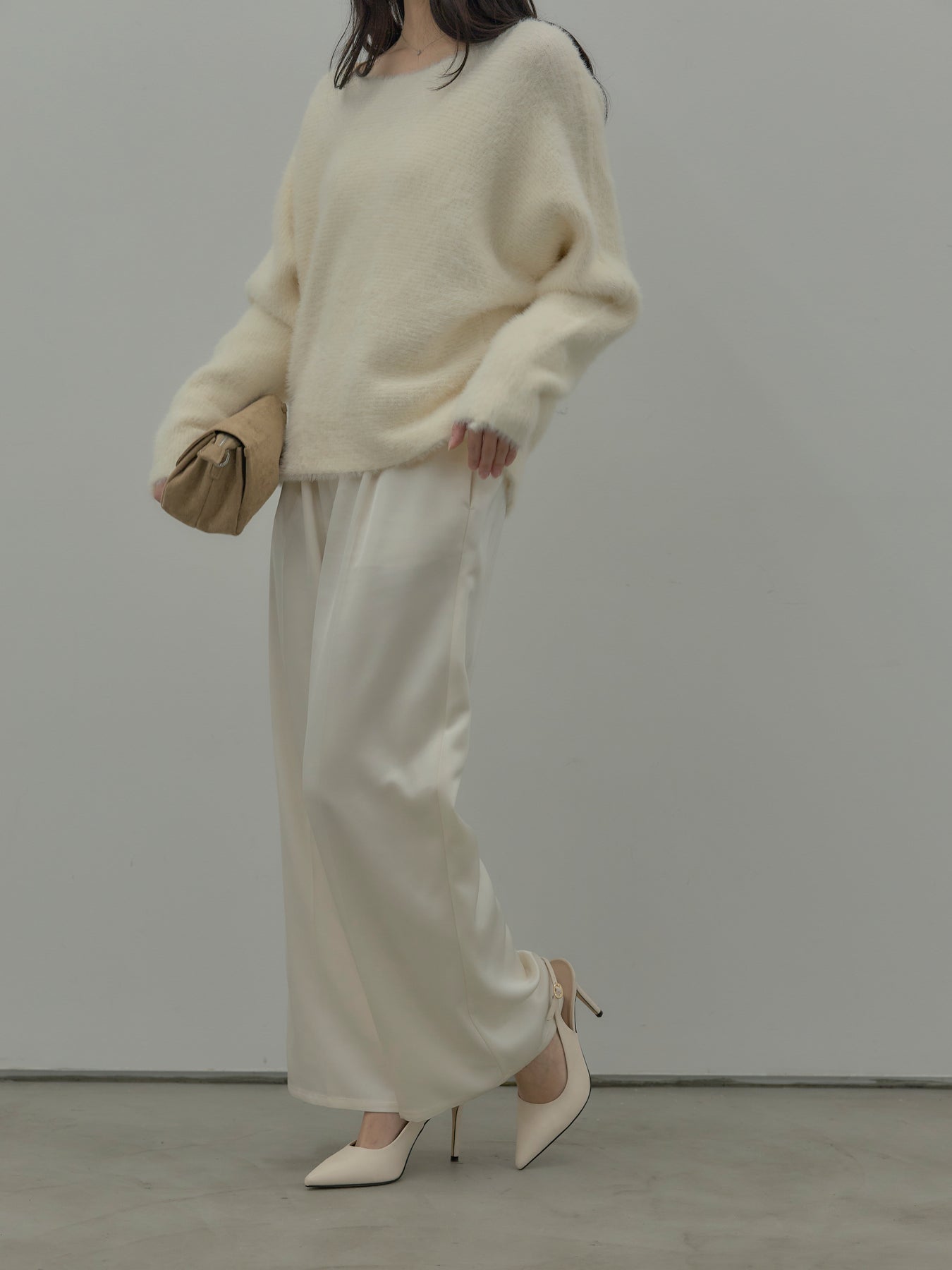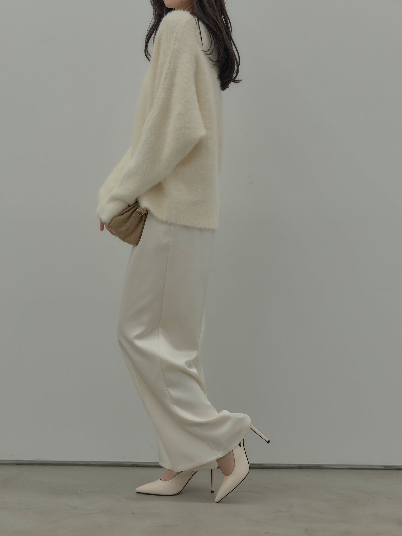 艶感控えめのサテン素材でデイリー使いしやすいので様々なコーディネートに合わせていただけます。オフィススタイルから特別な日のスタイルにもマッチ。センタープレスデザインで足をすらっとまっすぐ見せてくれるのも嬉しいポイント。程よくゆとりを持たせたストレートシルエット。後ろはゴムになっているので着心地も快適です。あえてベルトループなしのデザインにしているため、ウエスト周りがすっきり見え、トップスをインしたスタイルも美しく仕上がります。秋冬はニットに合わせて、オールシーズン活躍するボトムスです。