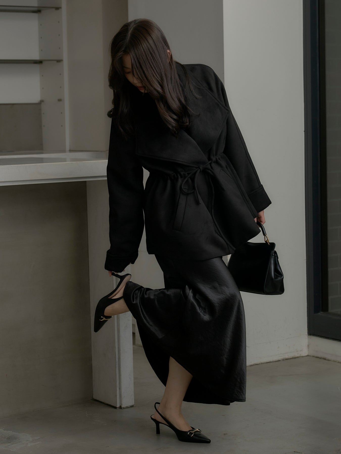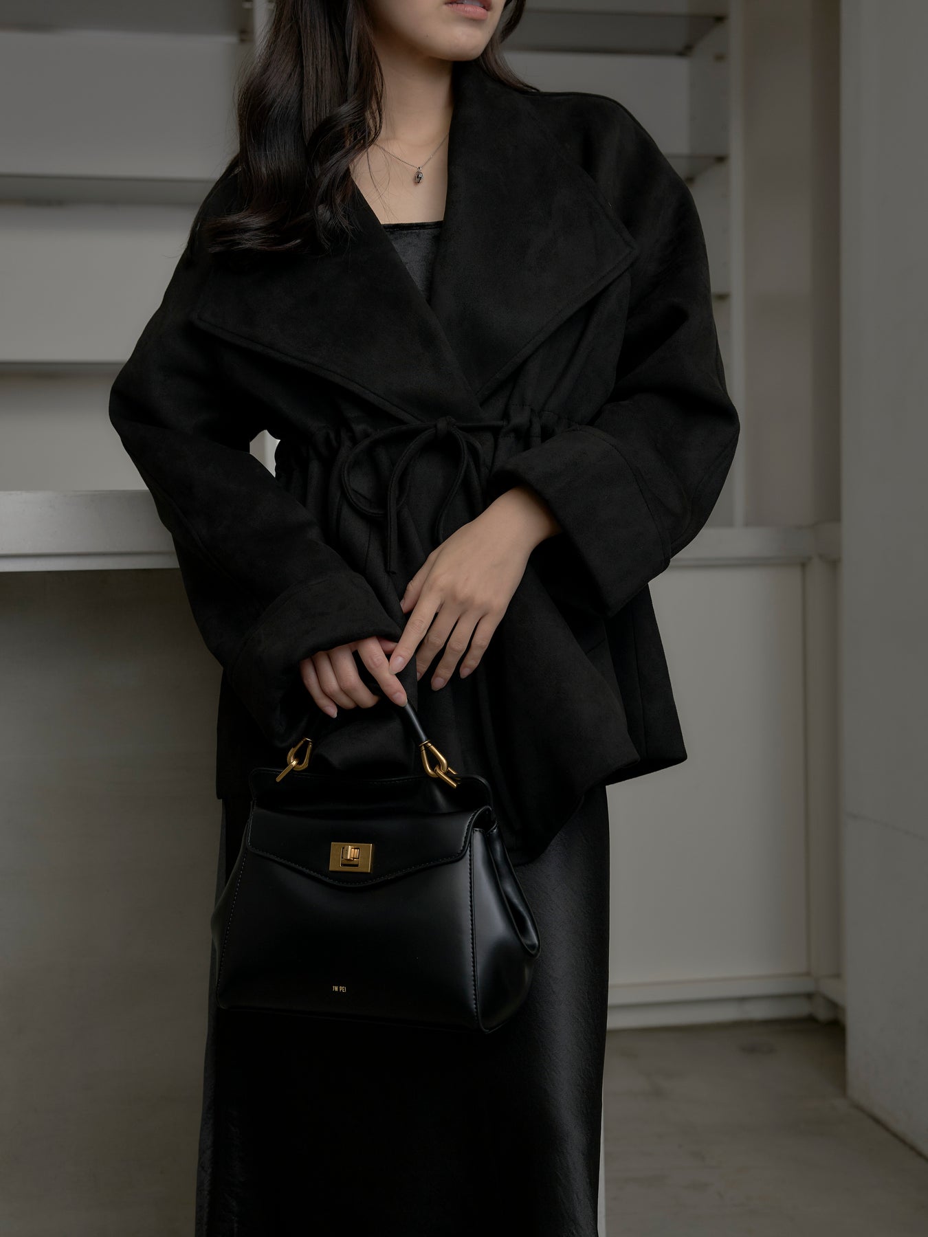 立体的な襟デザインが顔周りをすっきり見せ、羽織るだけで存在感のあるスタイルに。