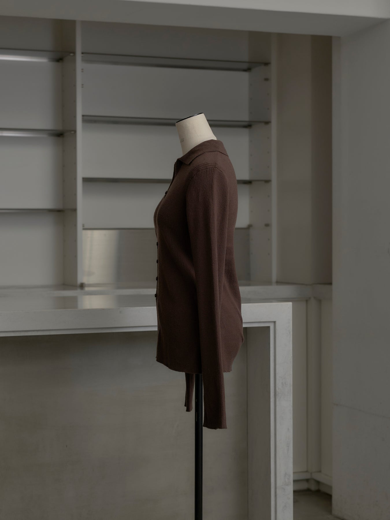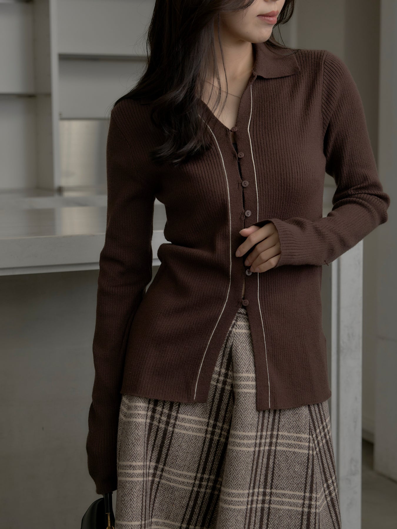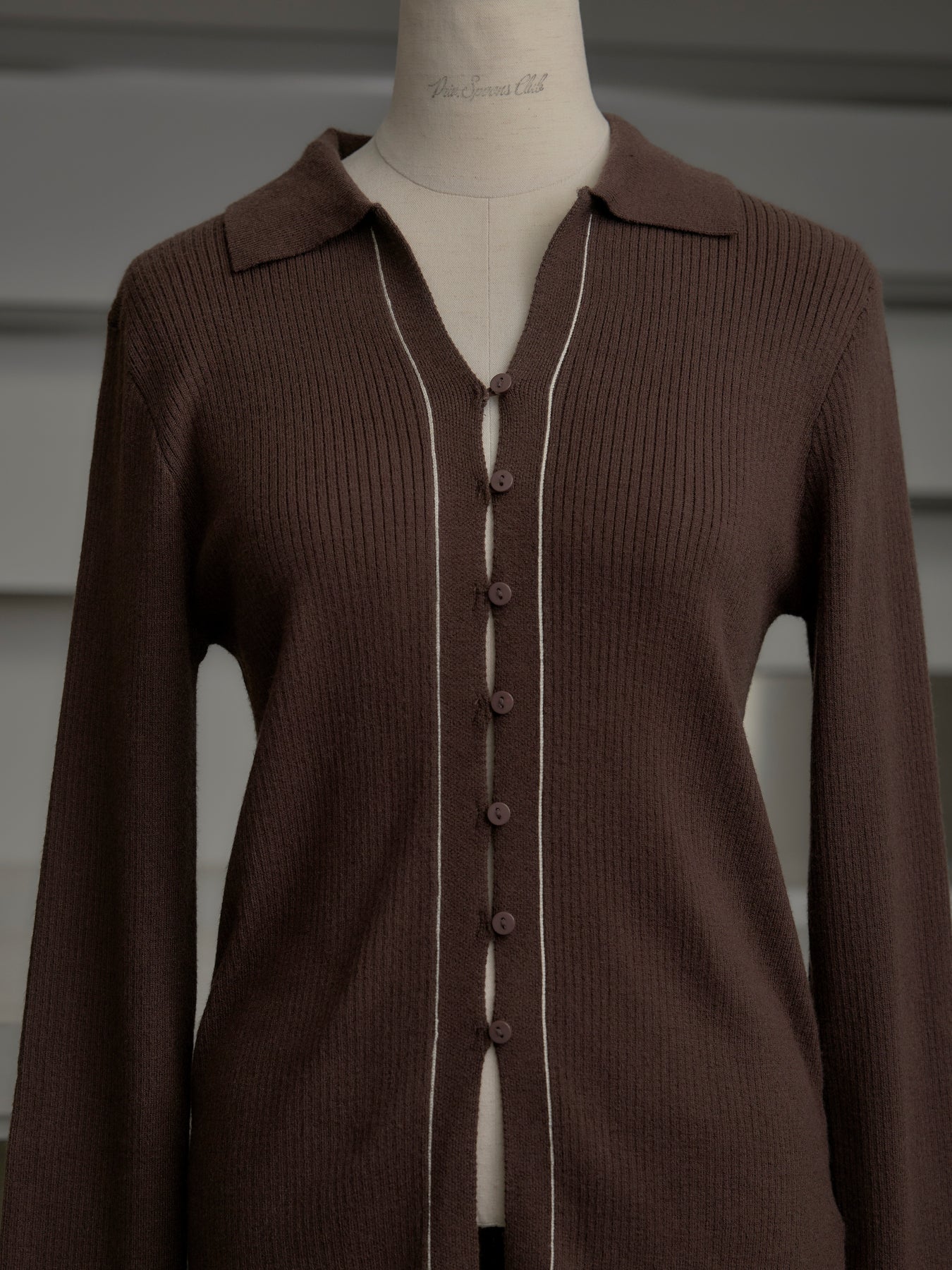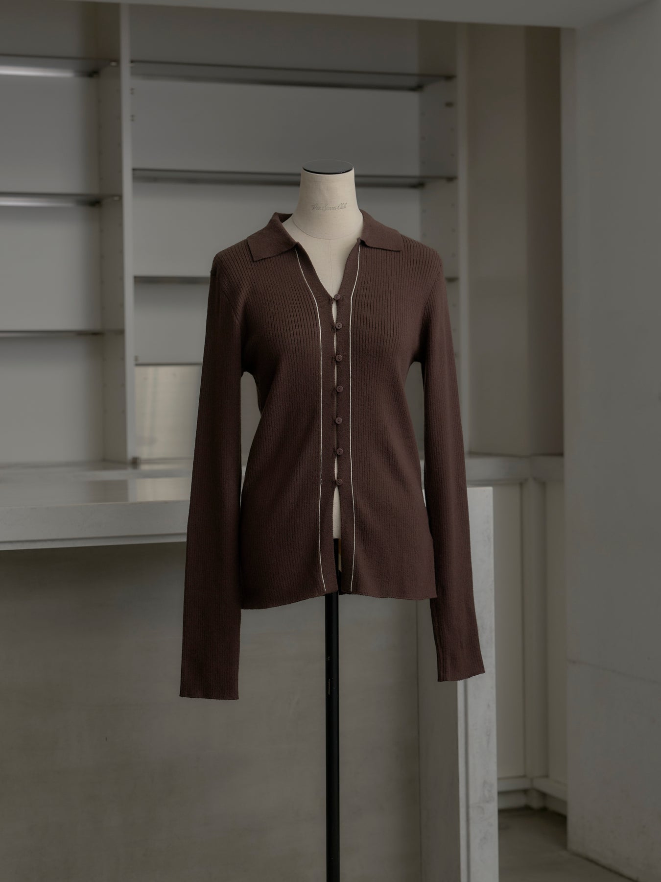 フロントの配色ラインがアクセントになったリブニットカーディガン。 すっきりとしたシルエットとポロ襟デザインが程よくきちんと感をプラス。 ウエストからヒップにかけての落ち感が特に美しく、幅広いスタイリングに馴染むアイテム。