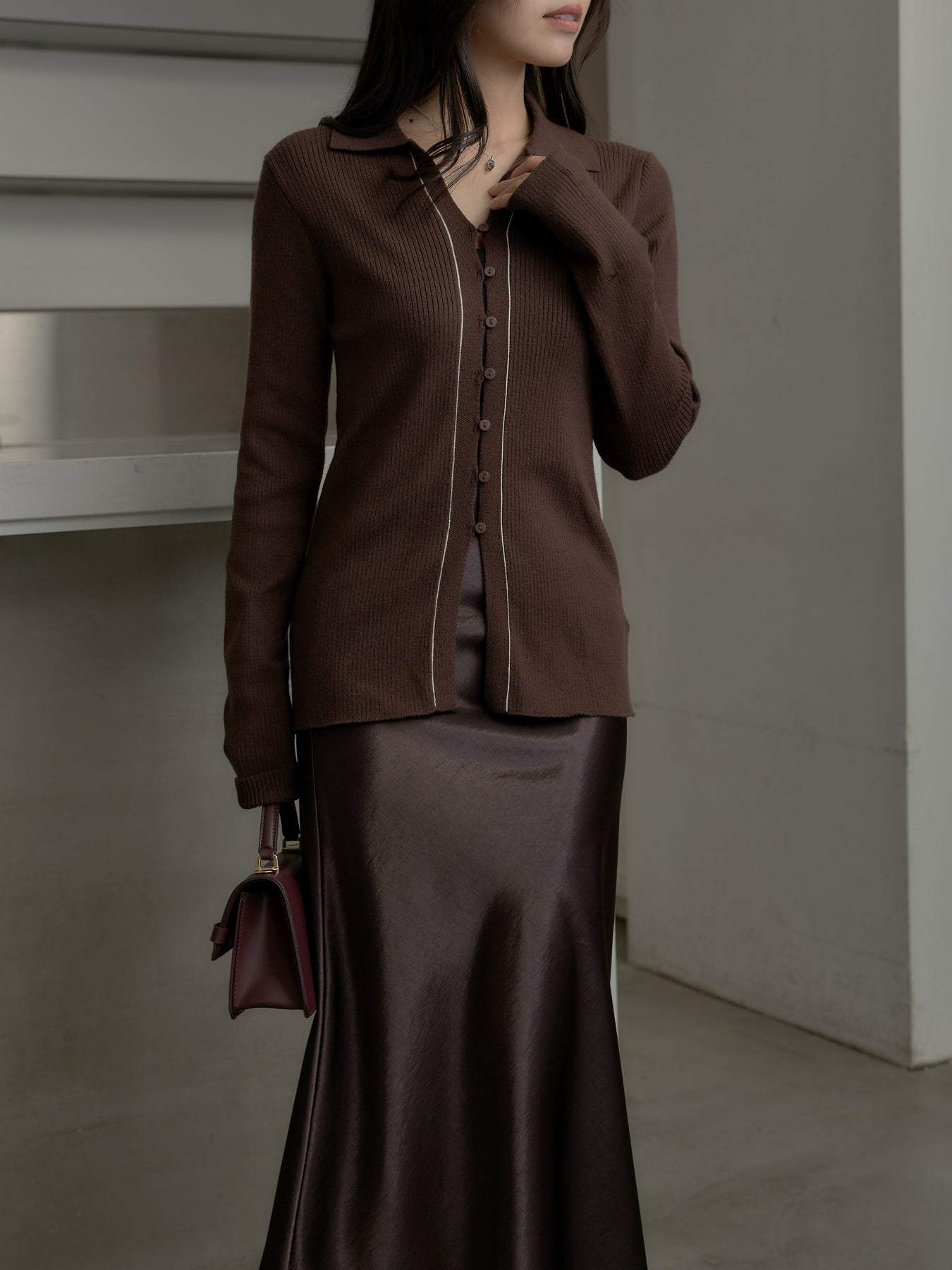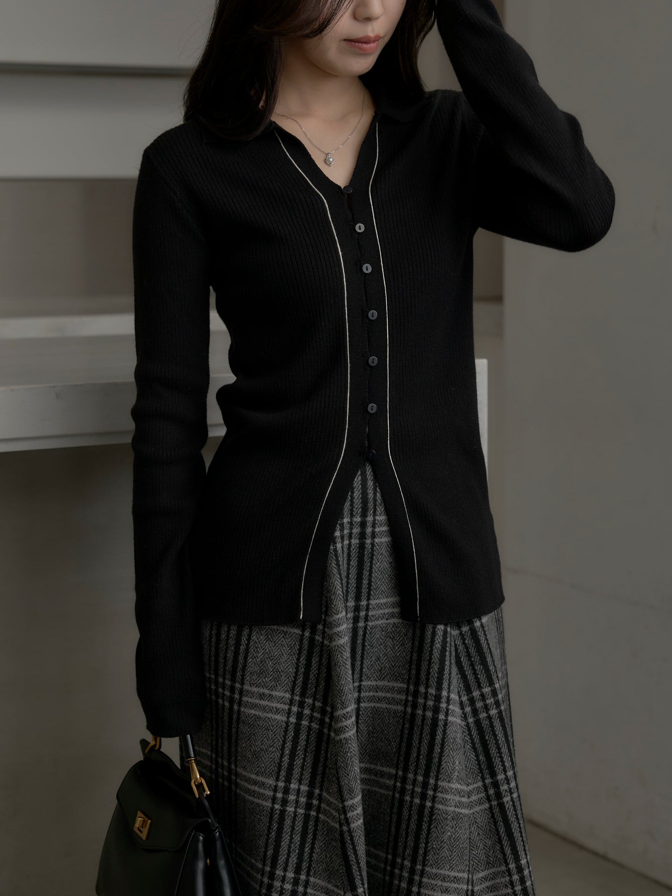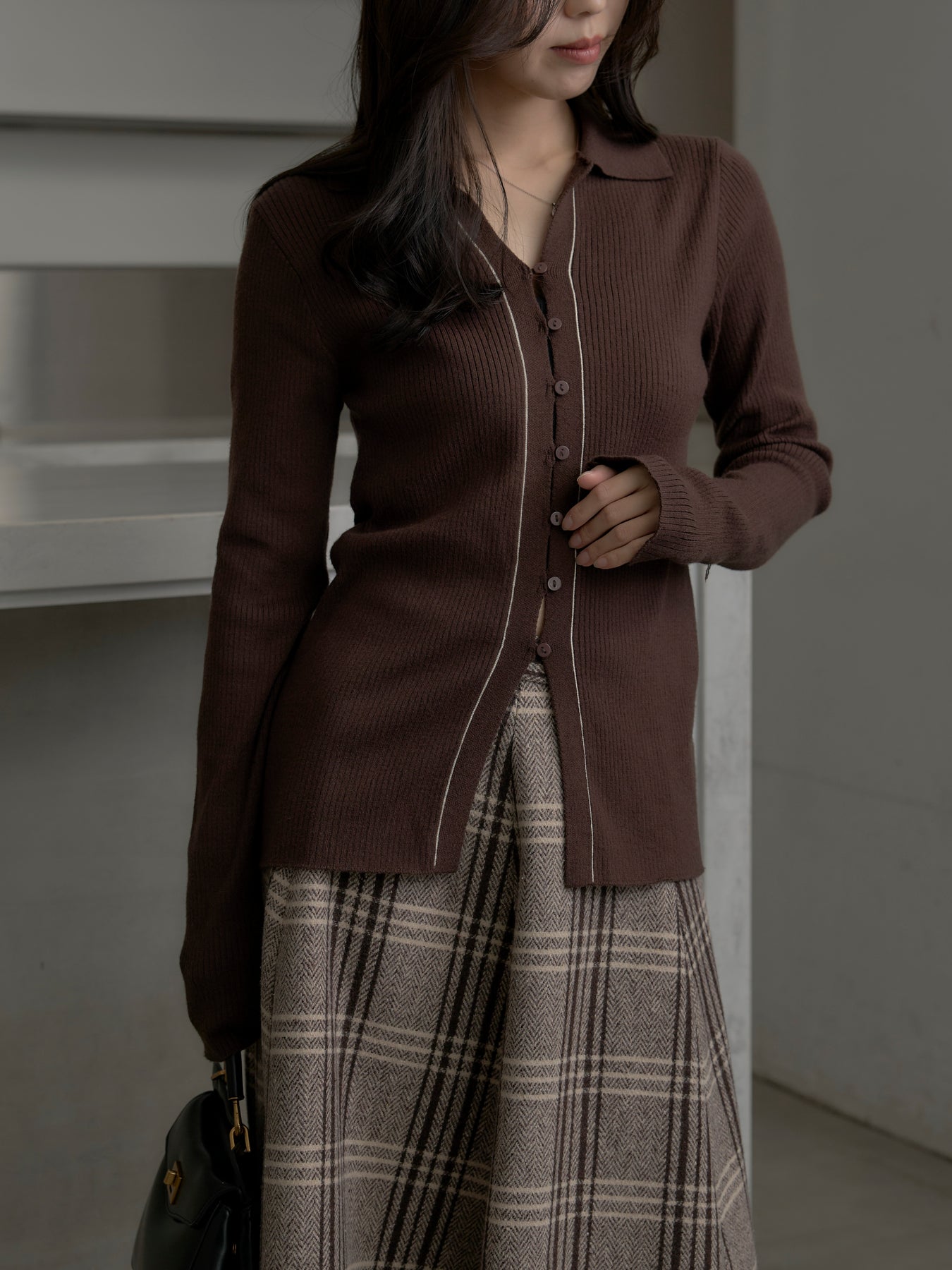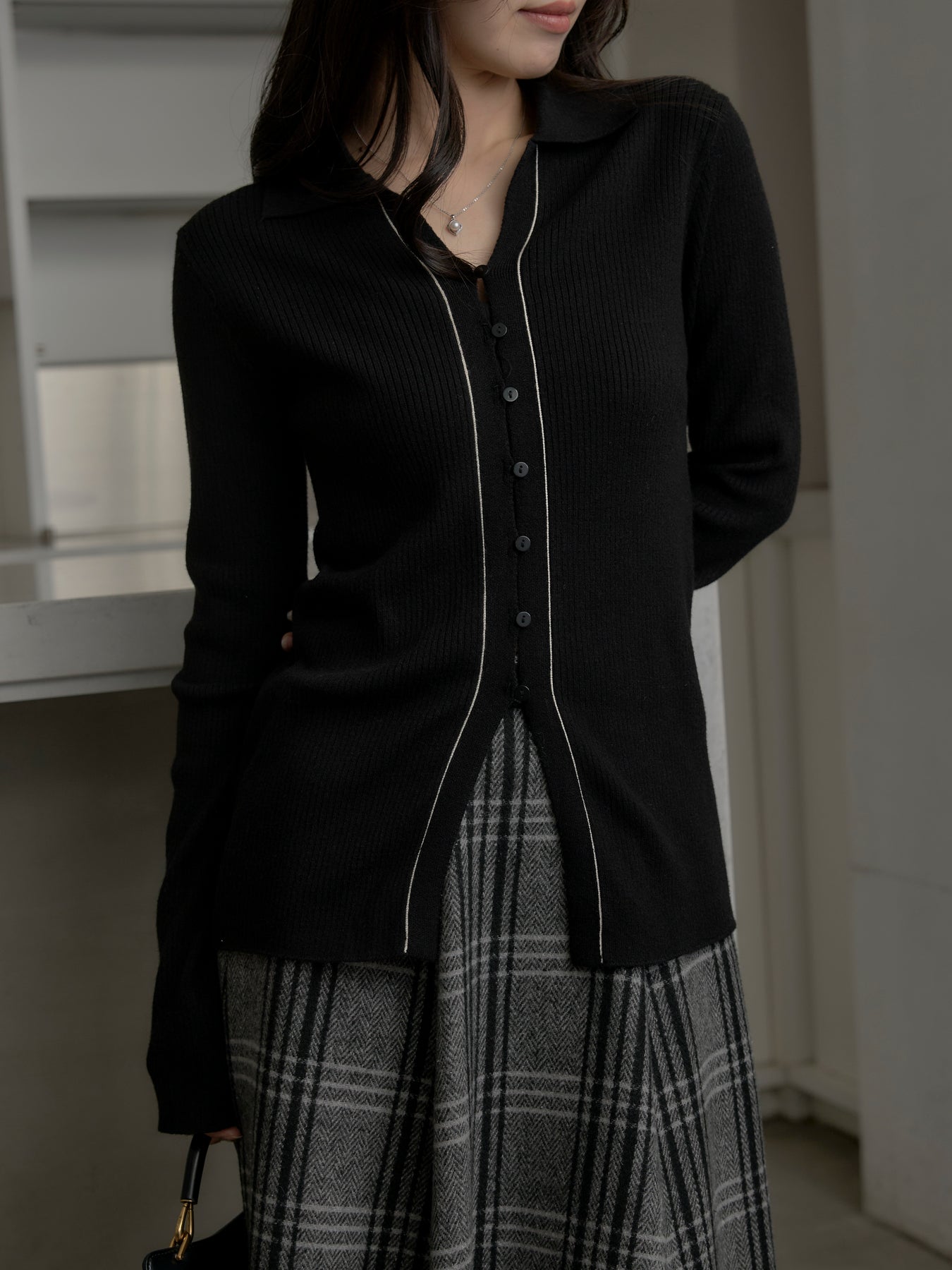 フロントの配色ラインがアクセントになったリブニットカーディガン。 すっきりとしたシルエットとポロ襟デザインが程よくきちんと感をプラス。 ウエストからヒップにかけての落ち感が特に美しく、幅広いスタイリングに馴染むアイテム。