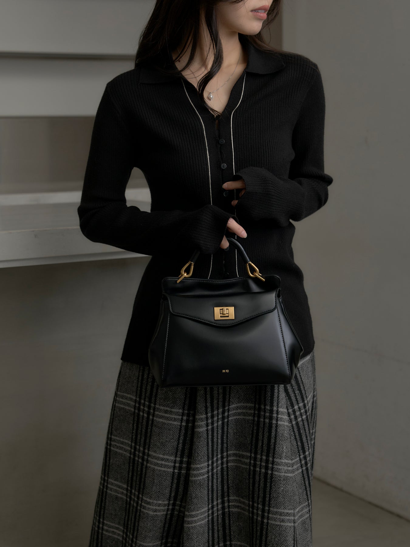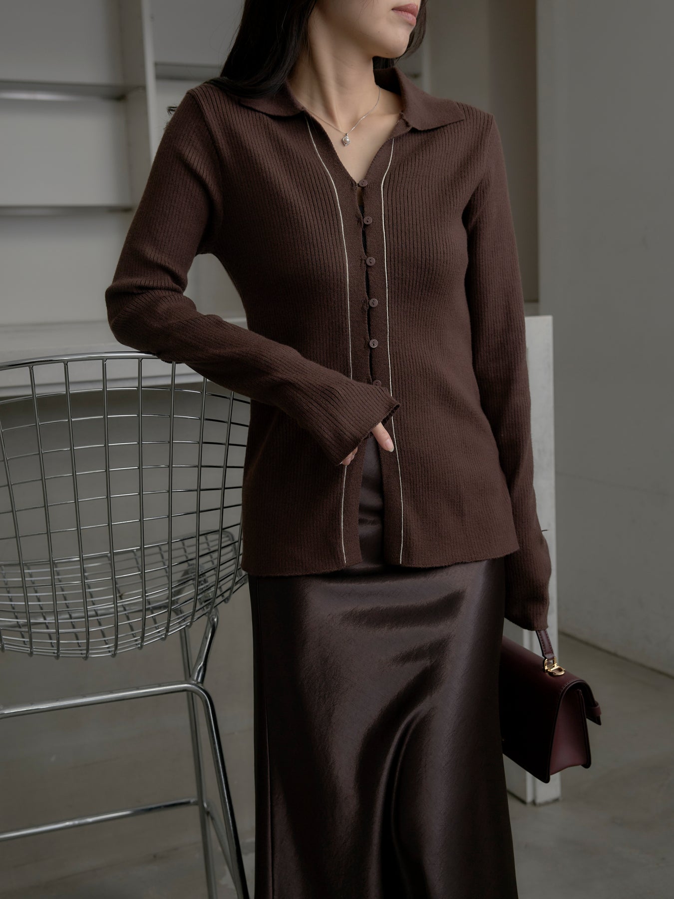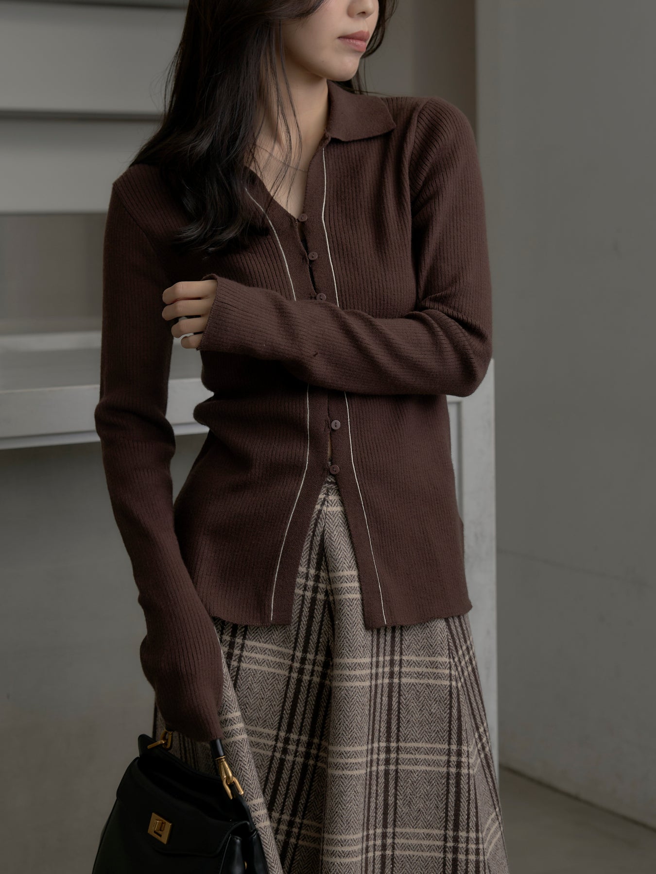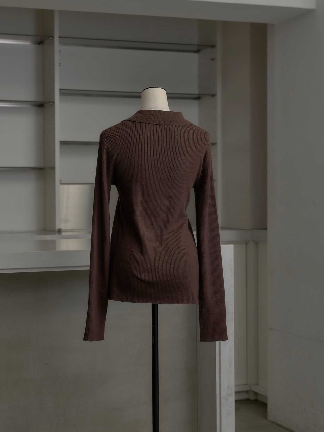 フロントの配色ラインがアクセントになったリブニットカーディガン。 すっきりとしたシルエットとポロ襟デザインが程よくきちんと感をプラス。 ウエストからヒップにかけての落ち感が特に美しく、幅広いスタイリングに馴染むアイテム。