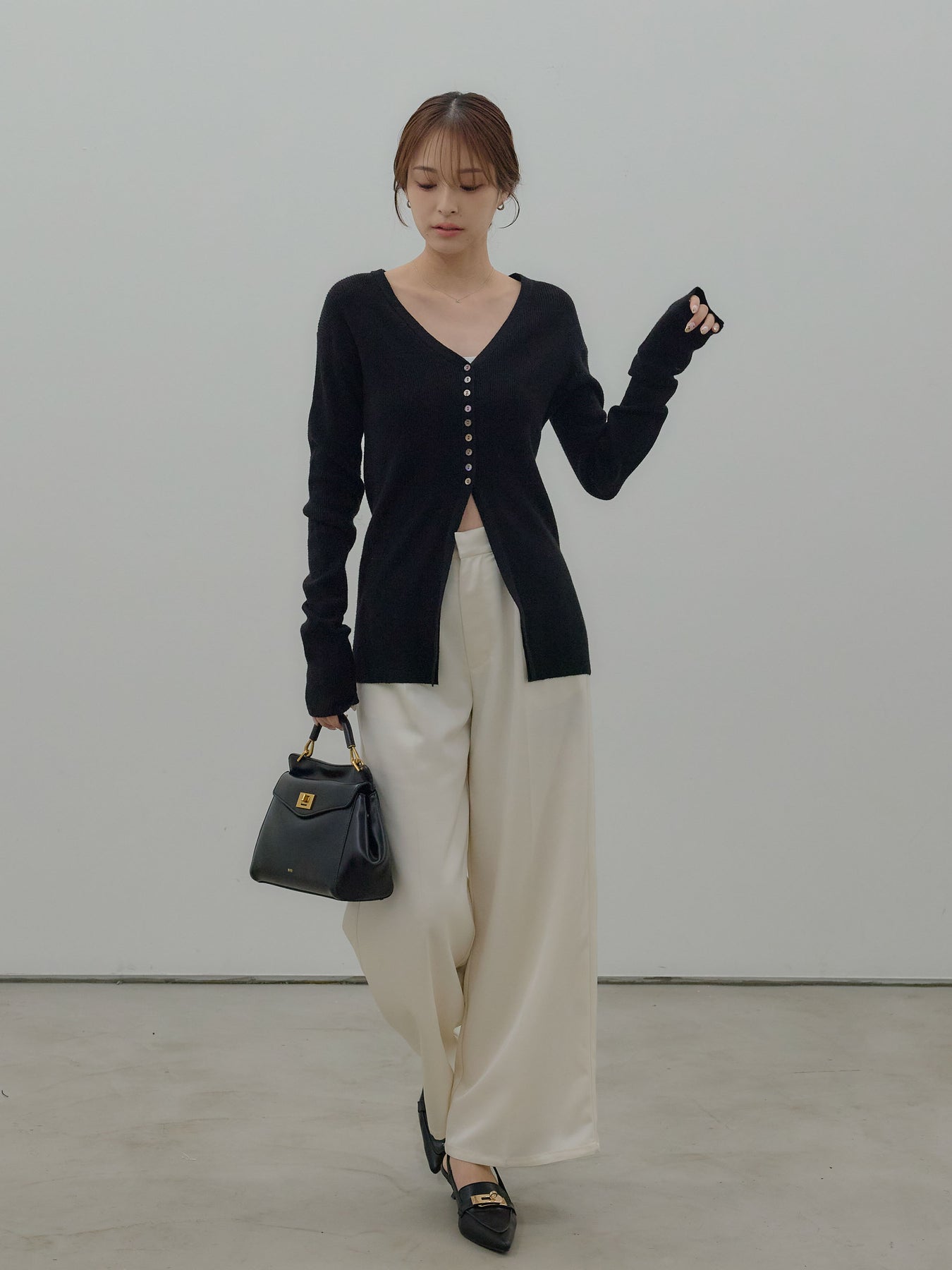 縦ラインを強調するデザインで、すっきりとした印象に。Vネックデザインは顔まわりをすっきり見せ、