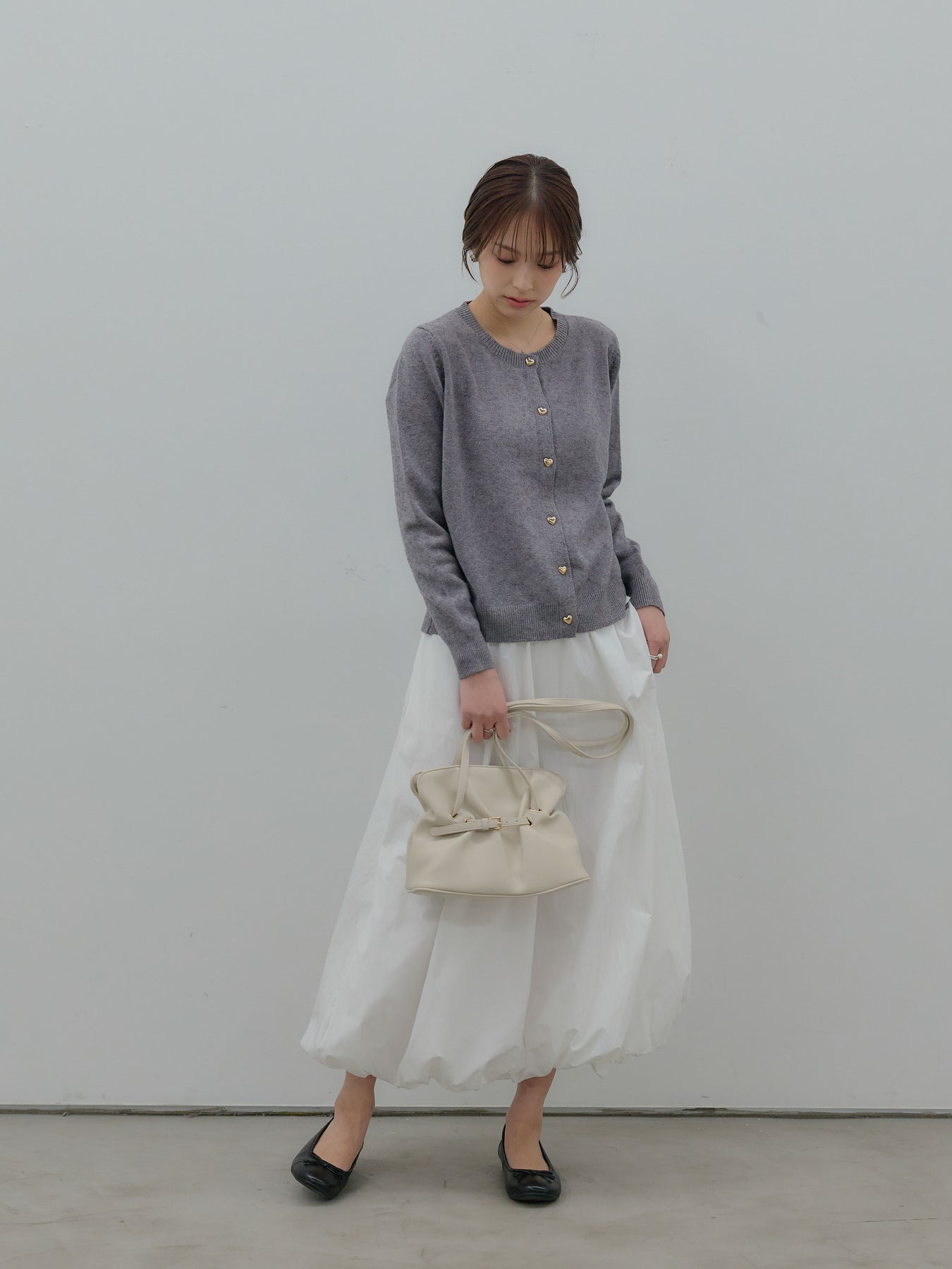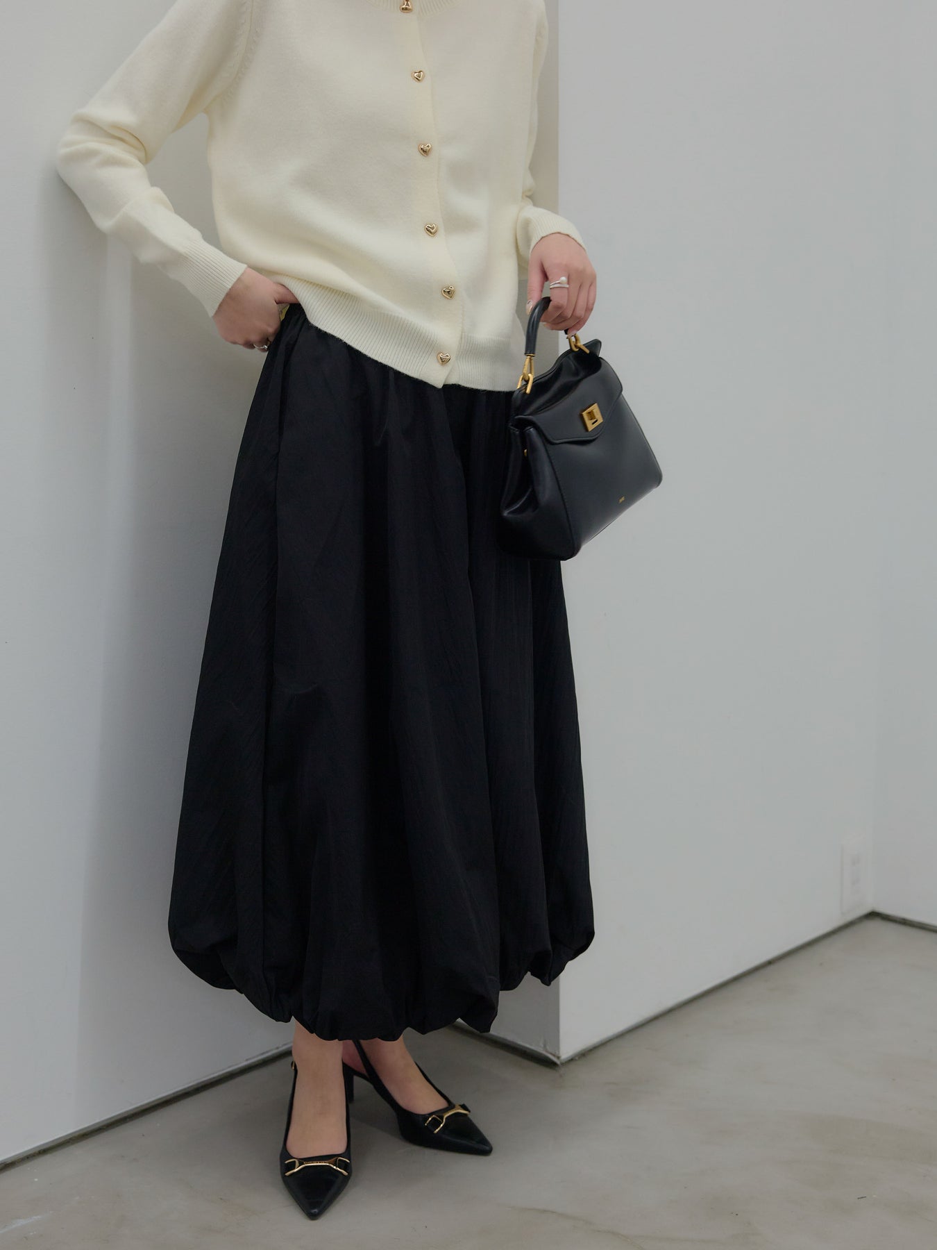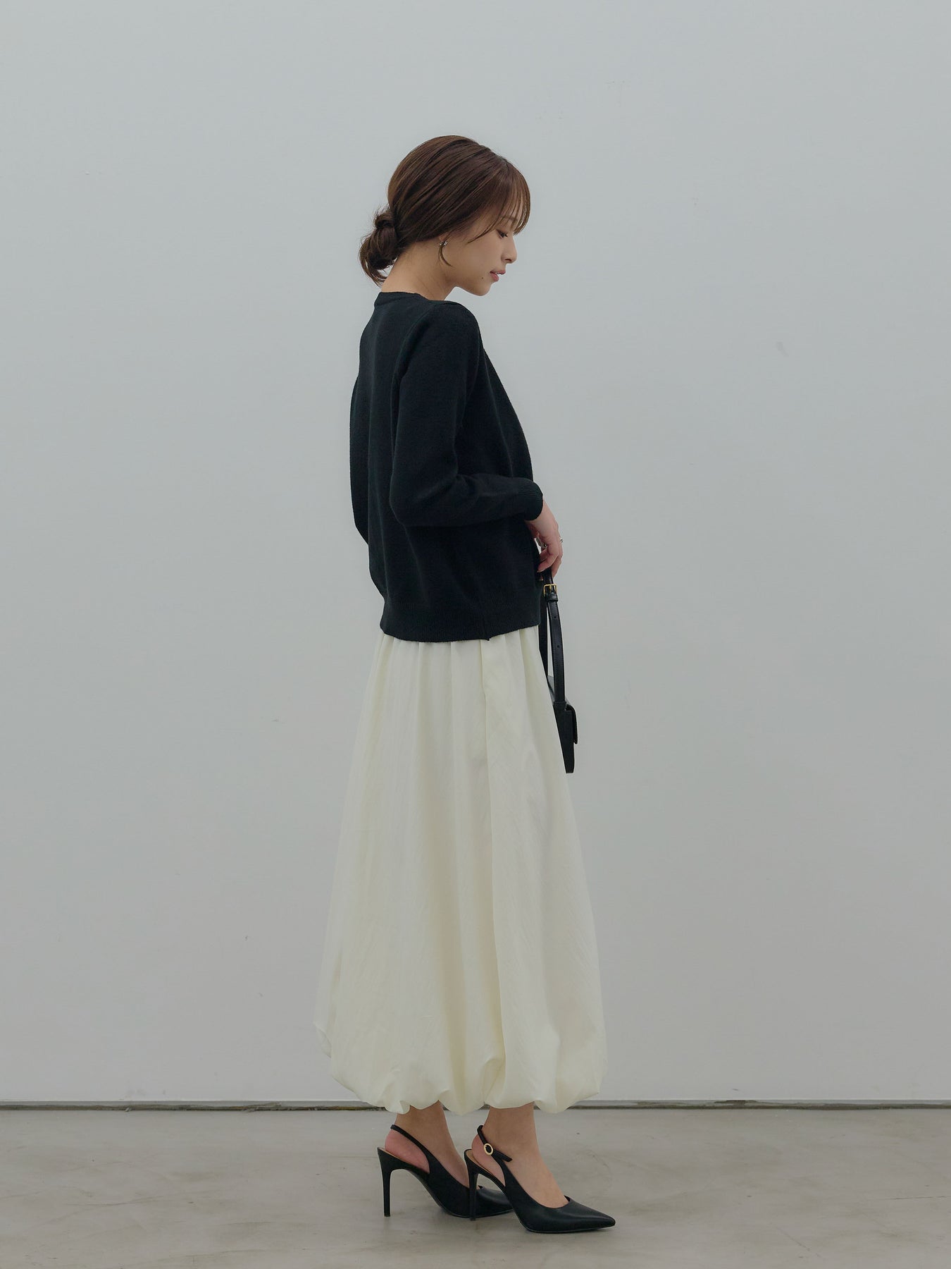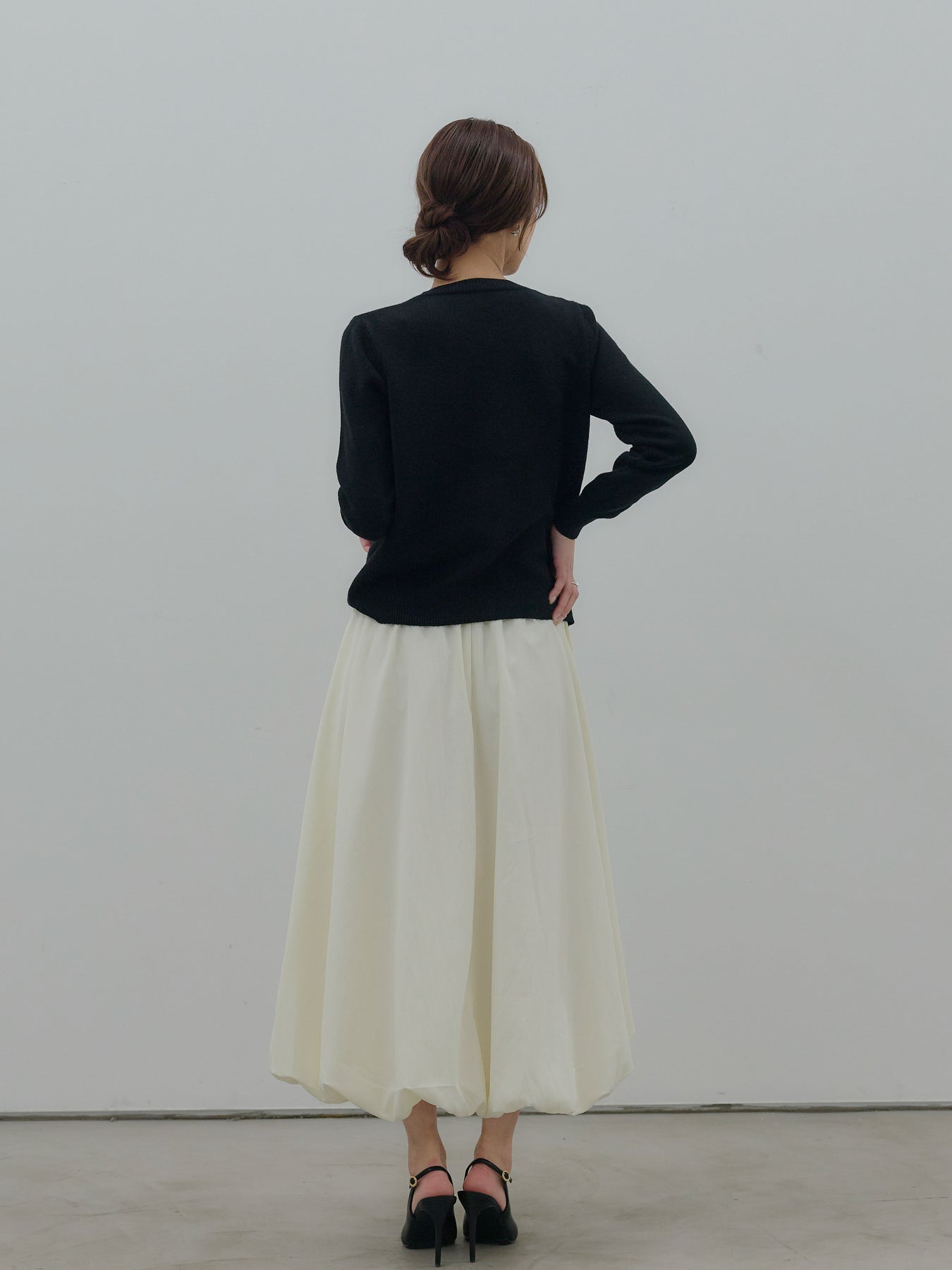 ふんわりと丸みのあるシルエットが印象的なバルーンスカート。 軽やかな素材を使用し、ボリュームがありながらも重たく見えないバランスに仕上げました。 ウエストまわりはすっきりと、 裾に向かって自然に膨らむフォルムが、女性らしい柔らかさを演出。 動くたびに揺れる表情が、スタイリングに奥行きを与えます。 シンプルなトップスと合わせるだけで、 ほどよく華やぎのあるコーディネートが完成します。