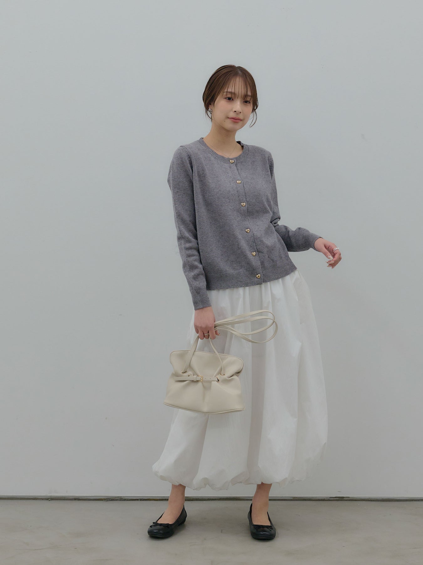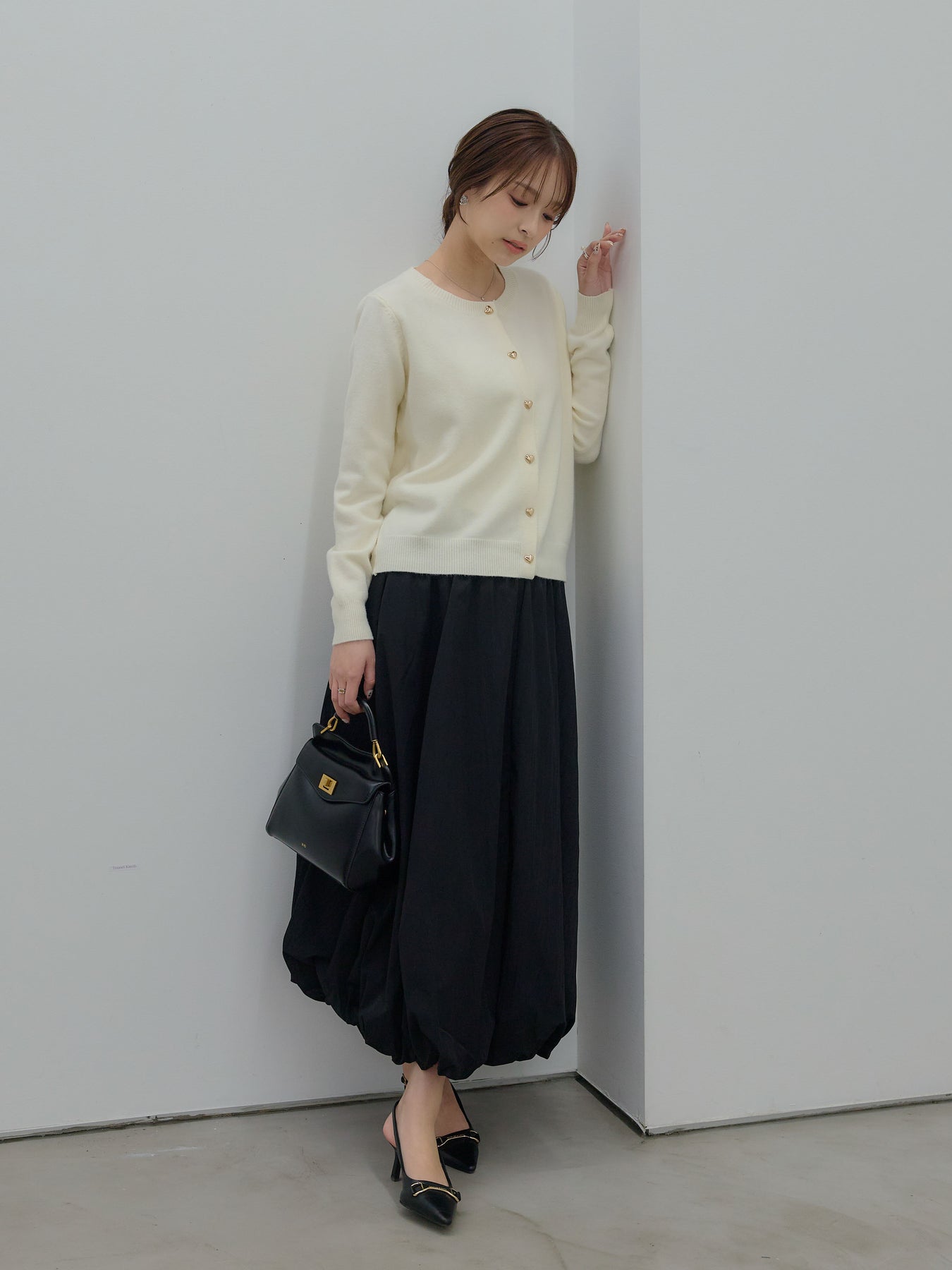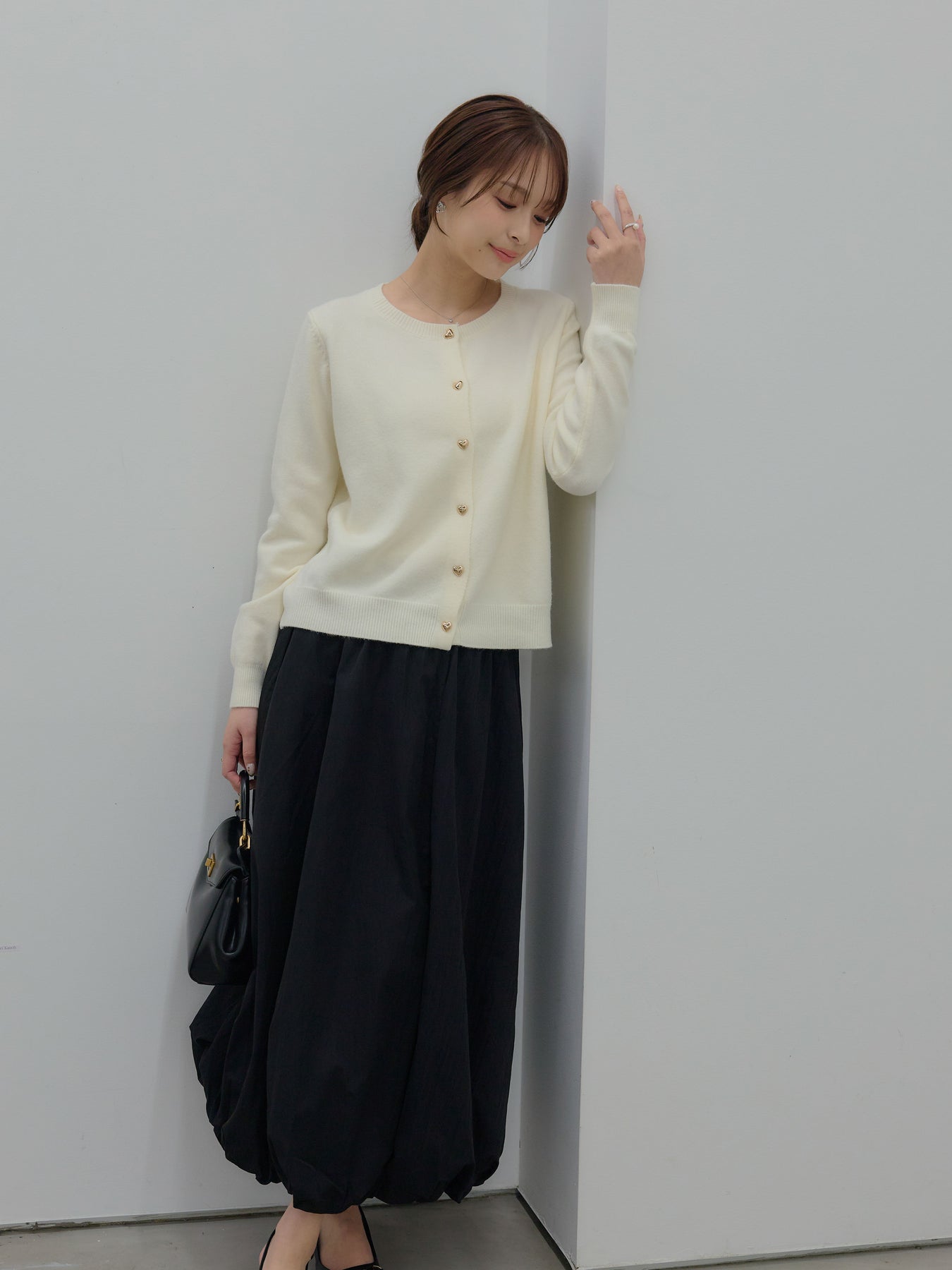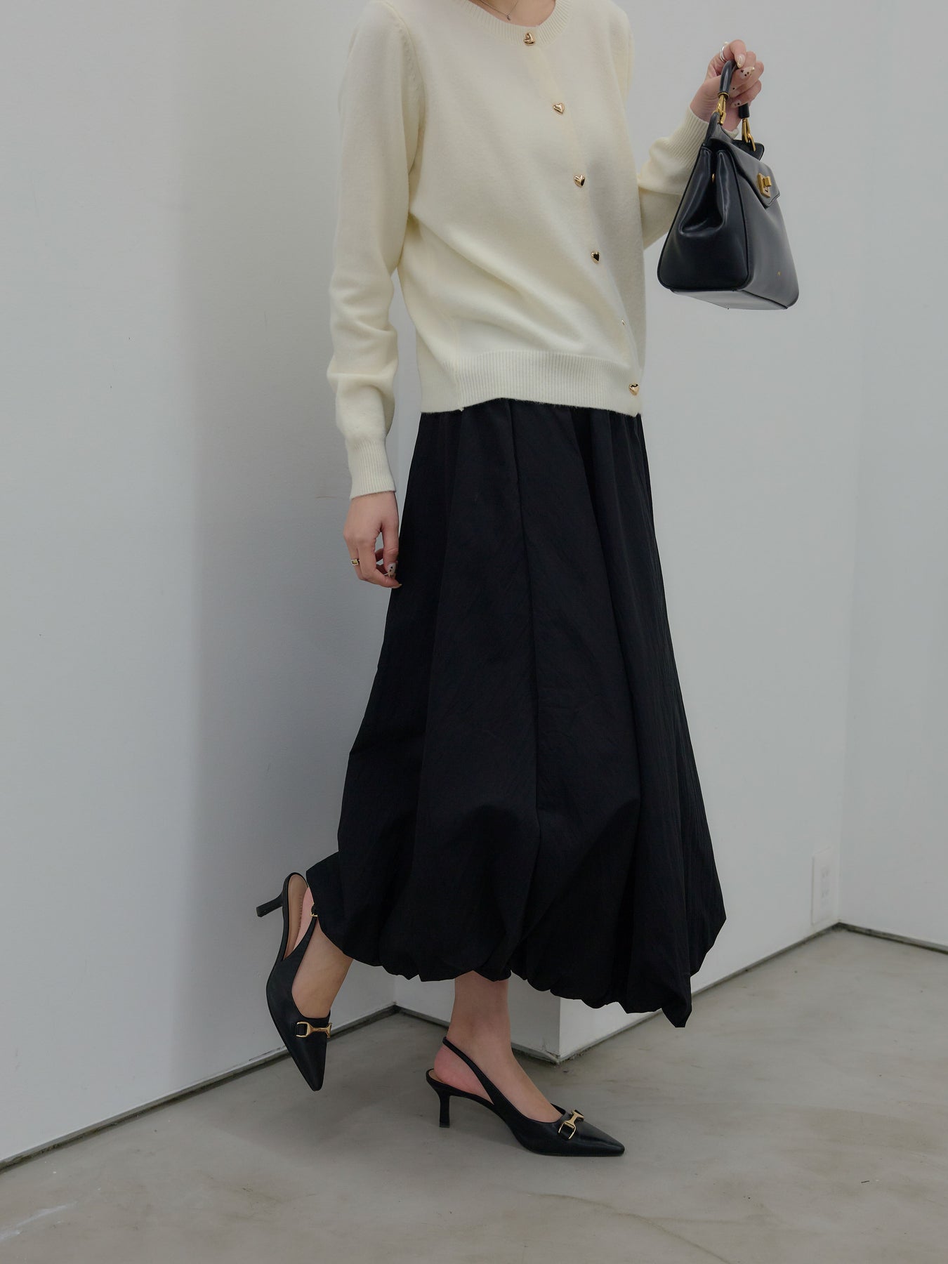 ふんわりと丸みのあるシルエットが印象的なバルーンスカート。 軽やかな素材を使用し、ボリュームがありながらも重たく見えないバランスに仕上げました。 ウエストまわりはすっきりと、 裾に向かって自然に膨らむフォルムが、女性らしい柔らかさを演出。 動くたびに揺れる表情が、スタイリングに奥行きを与えます。 シンプルなトップスと合わせるだけで、 ほどよく華やぎのあるコーディネートが完成します。
