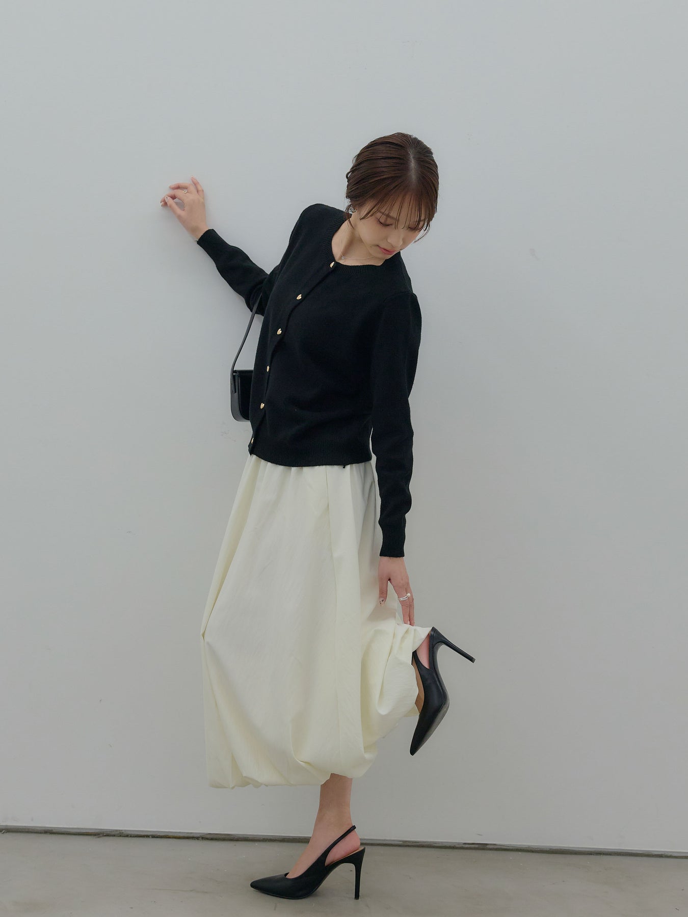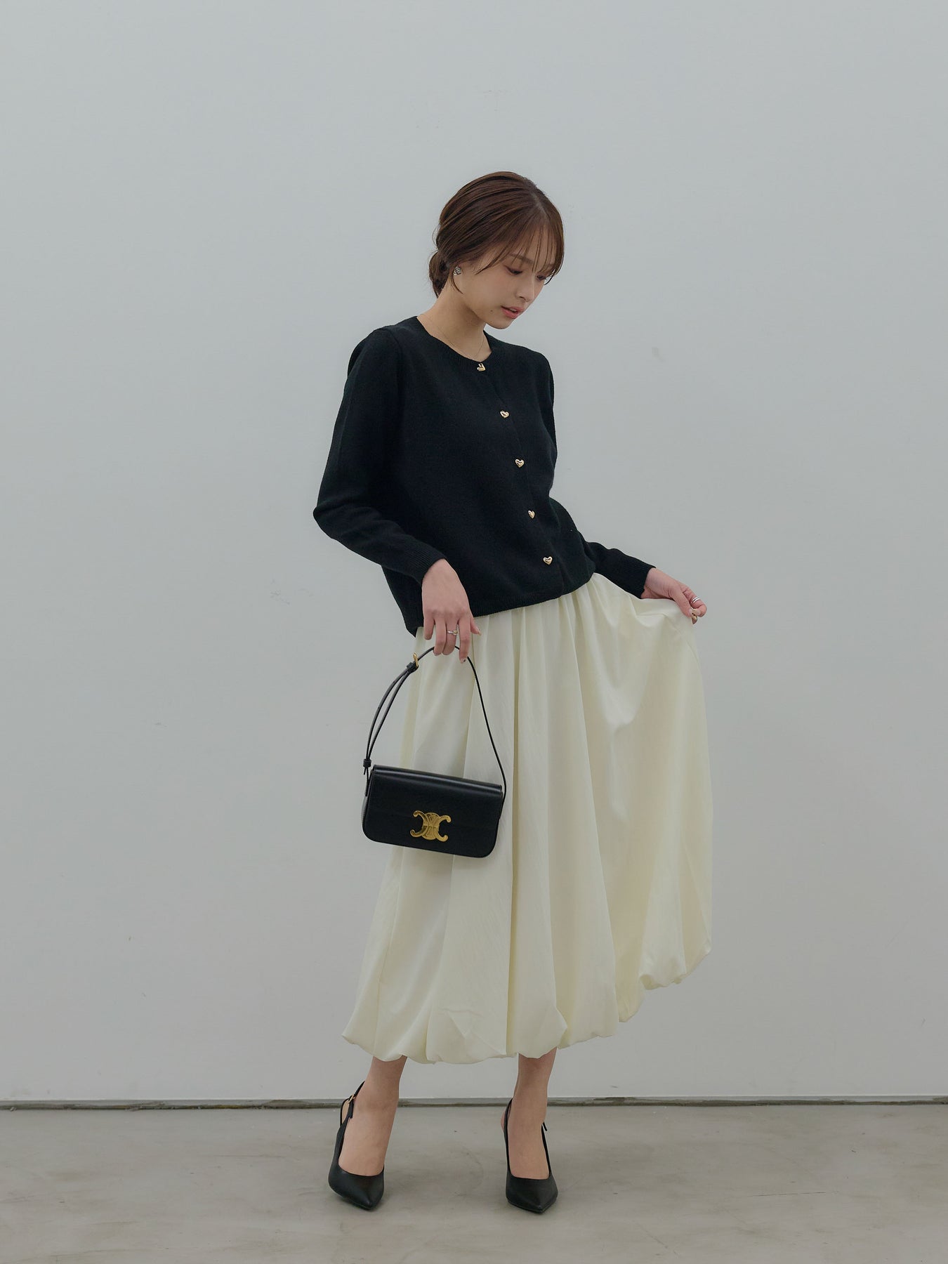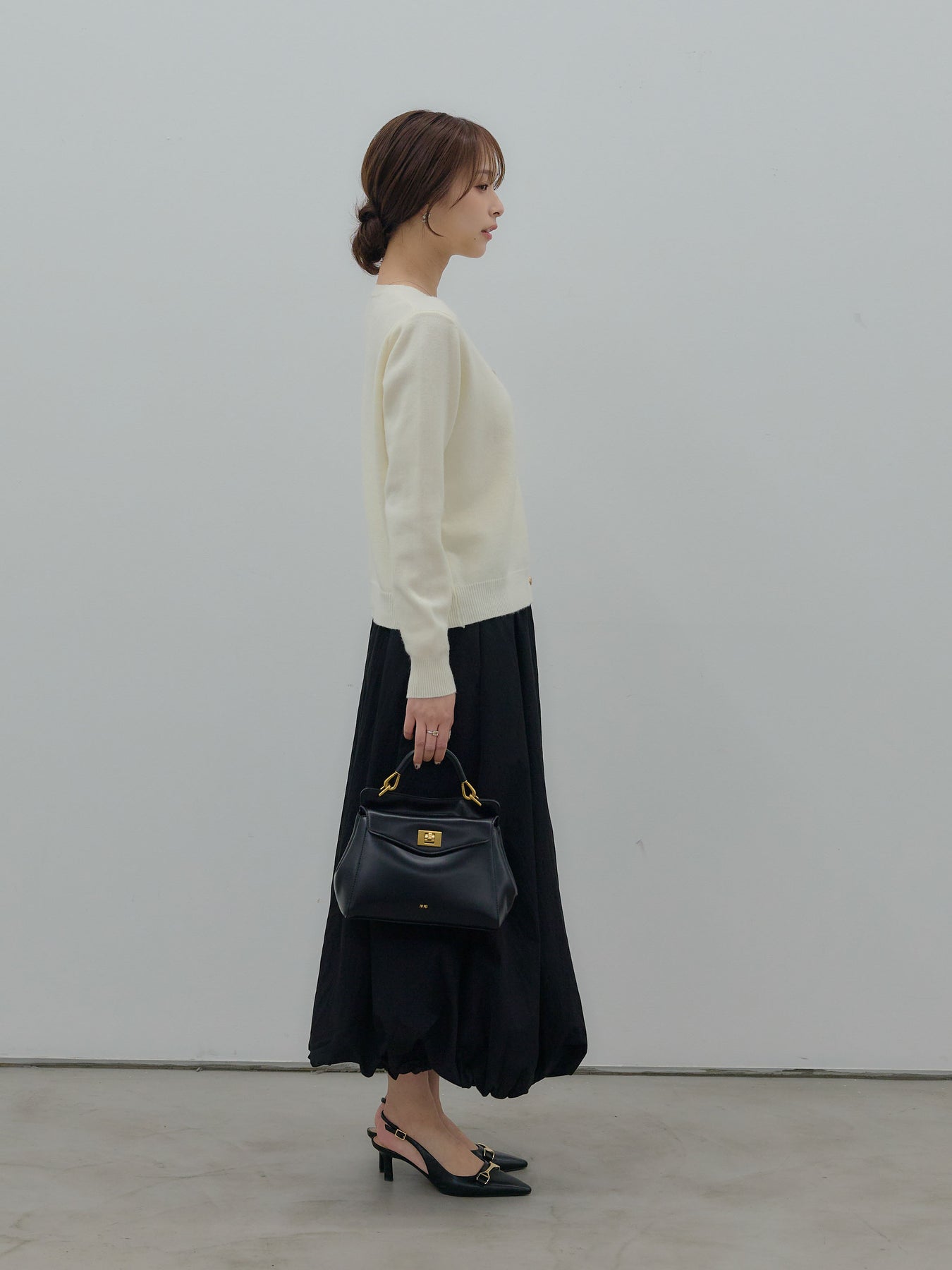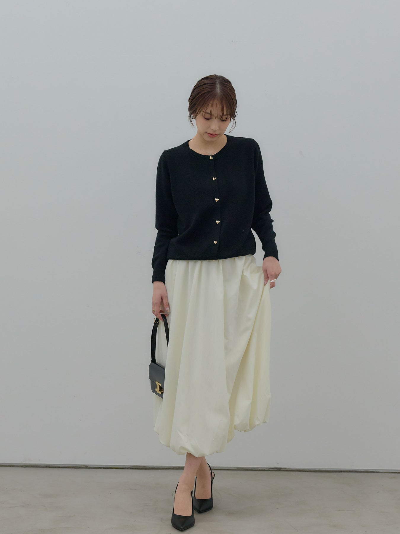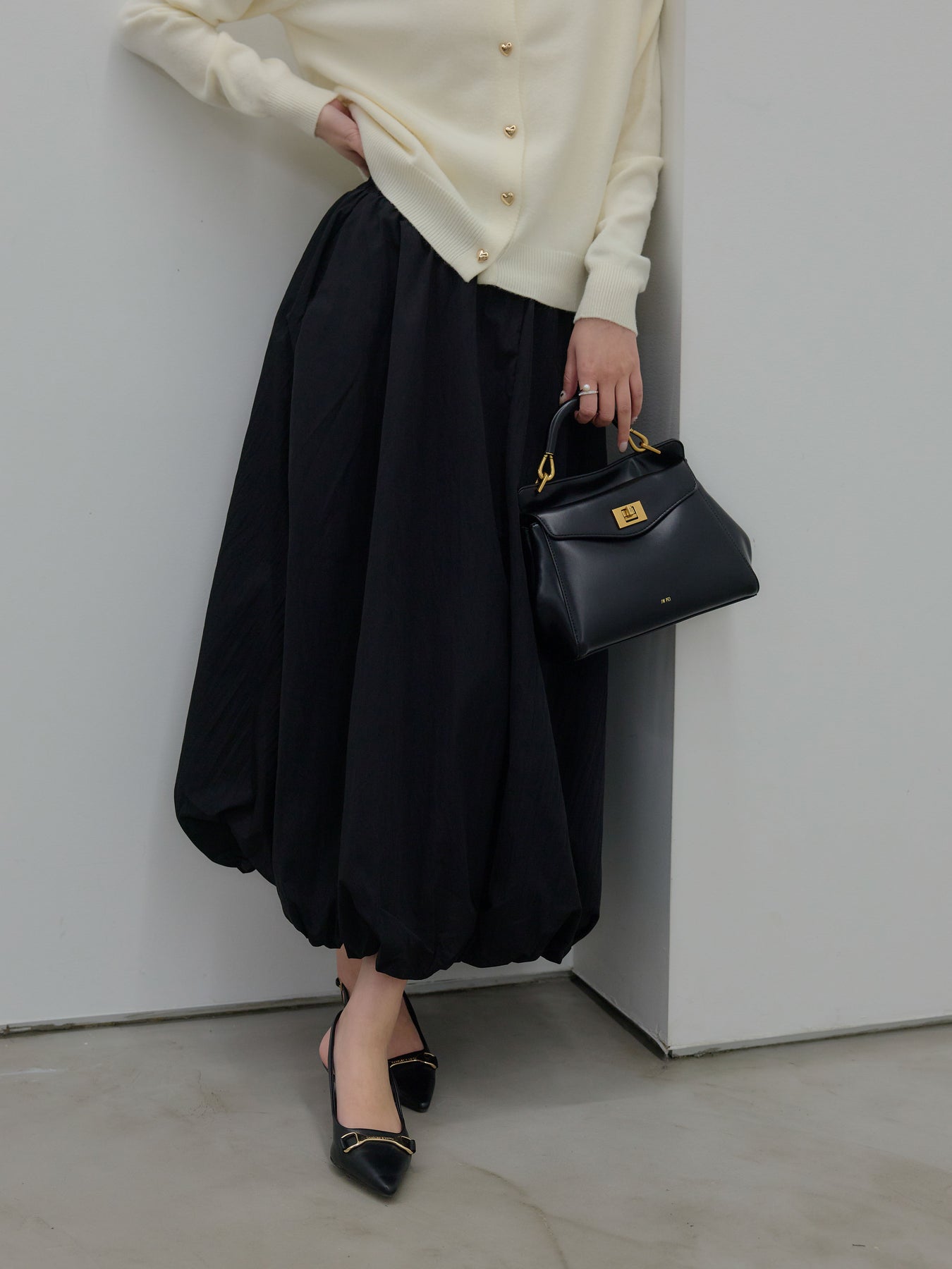 ふんわりと丸みのあるシルエットが印象的なバルーンスカート。 軽やかな素材を使用し、ボリュームがありながらも重たく見えないバランスに仕上げました。 ウエストまわりはすっきりと、 裾に向かって自然に膨らむフォルムが、女性らしい柔らかさを演出。 動くたびに揺れる表情が、スタイリングに奥行きを与えます。 シンプルなトップスと合わせるだけで、 ほどよく華やぎのあるコーディネートが完成します。