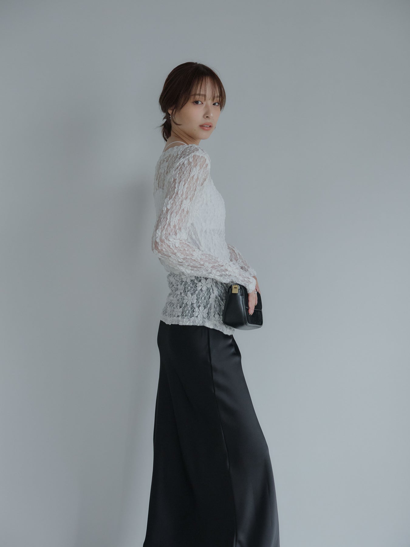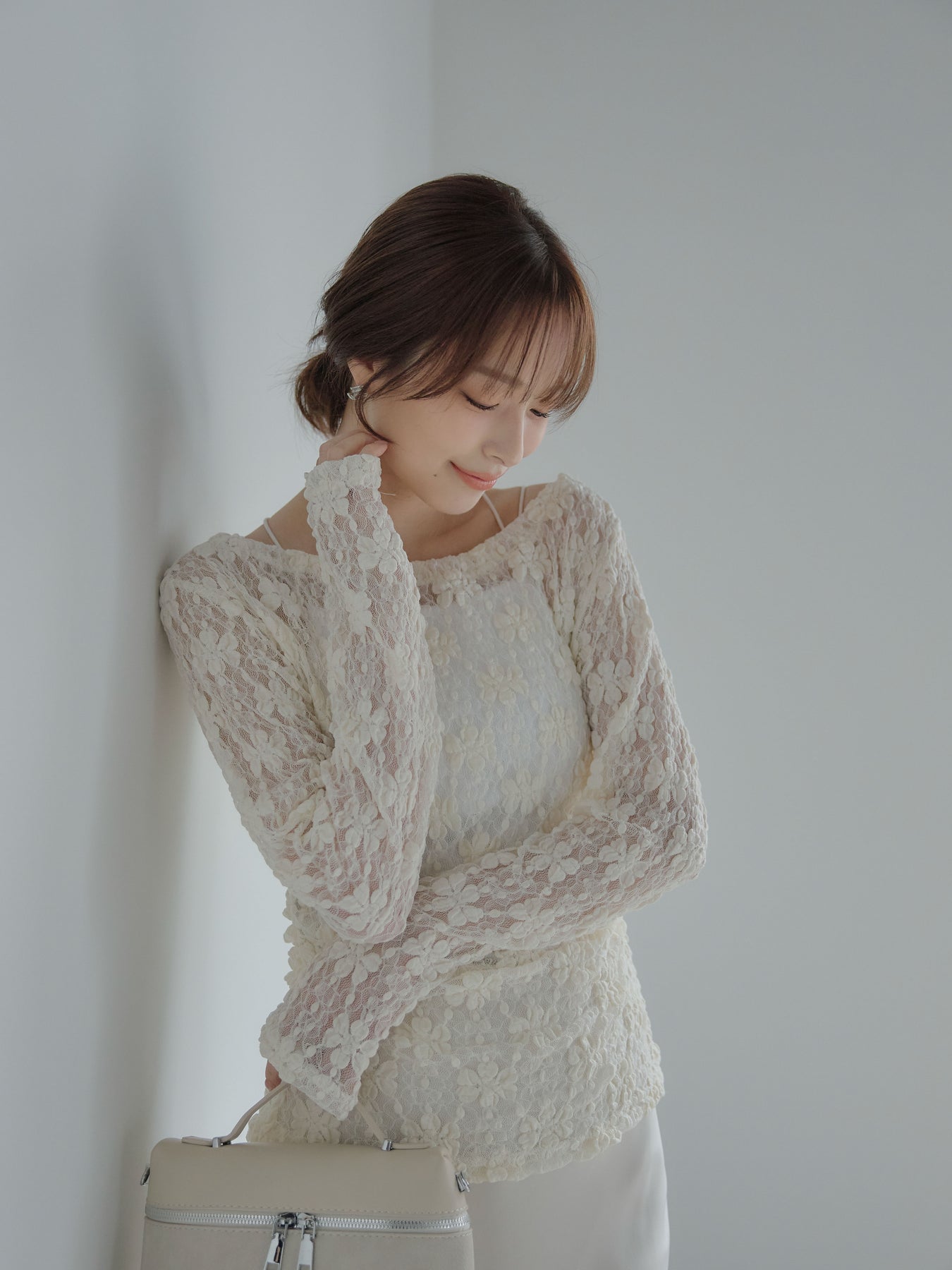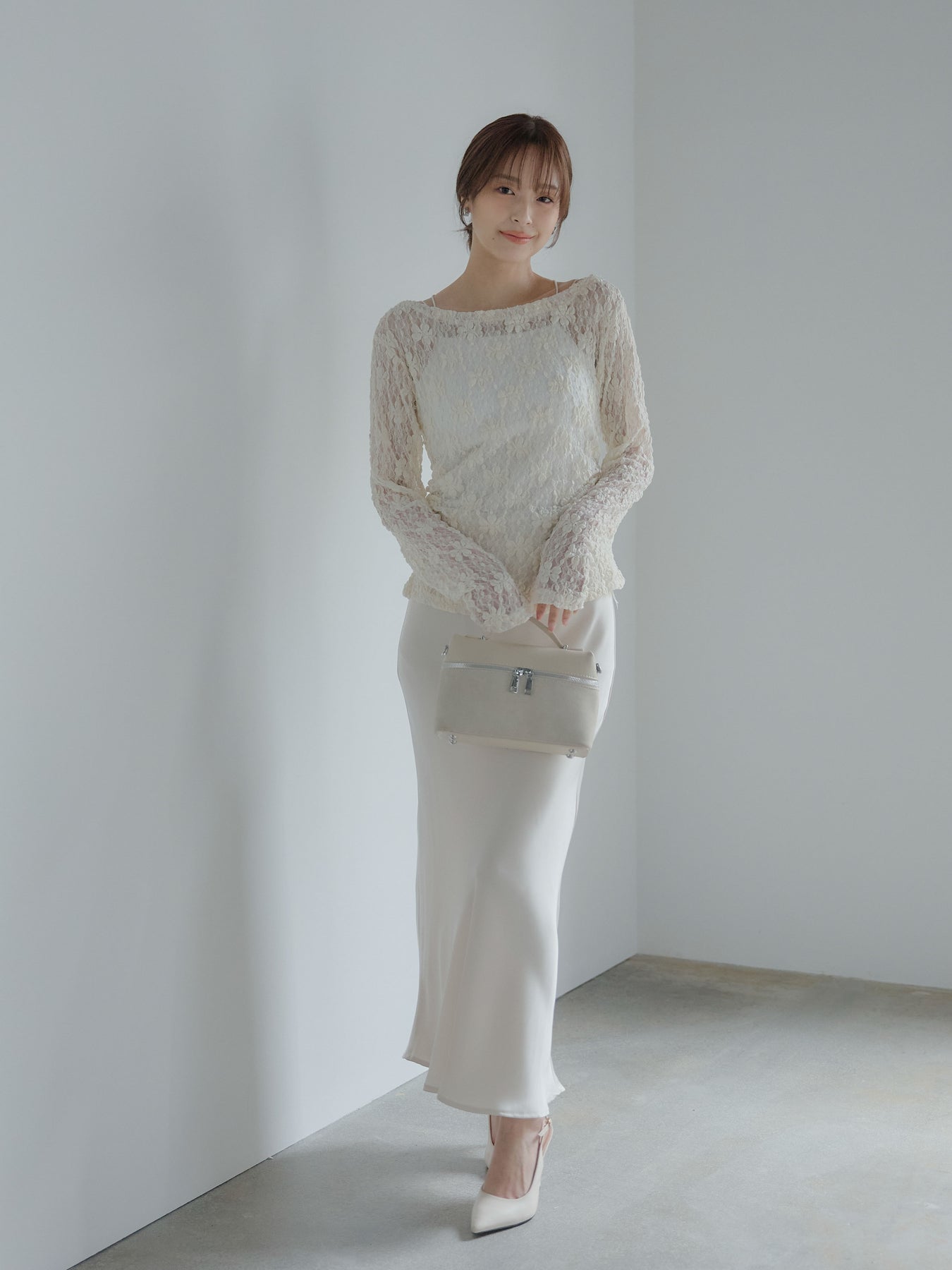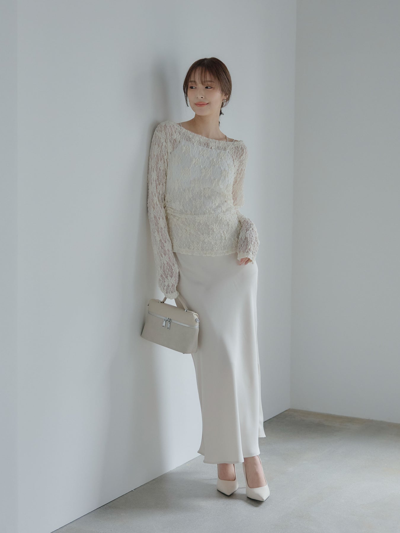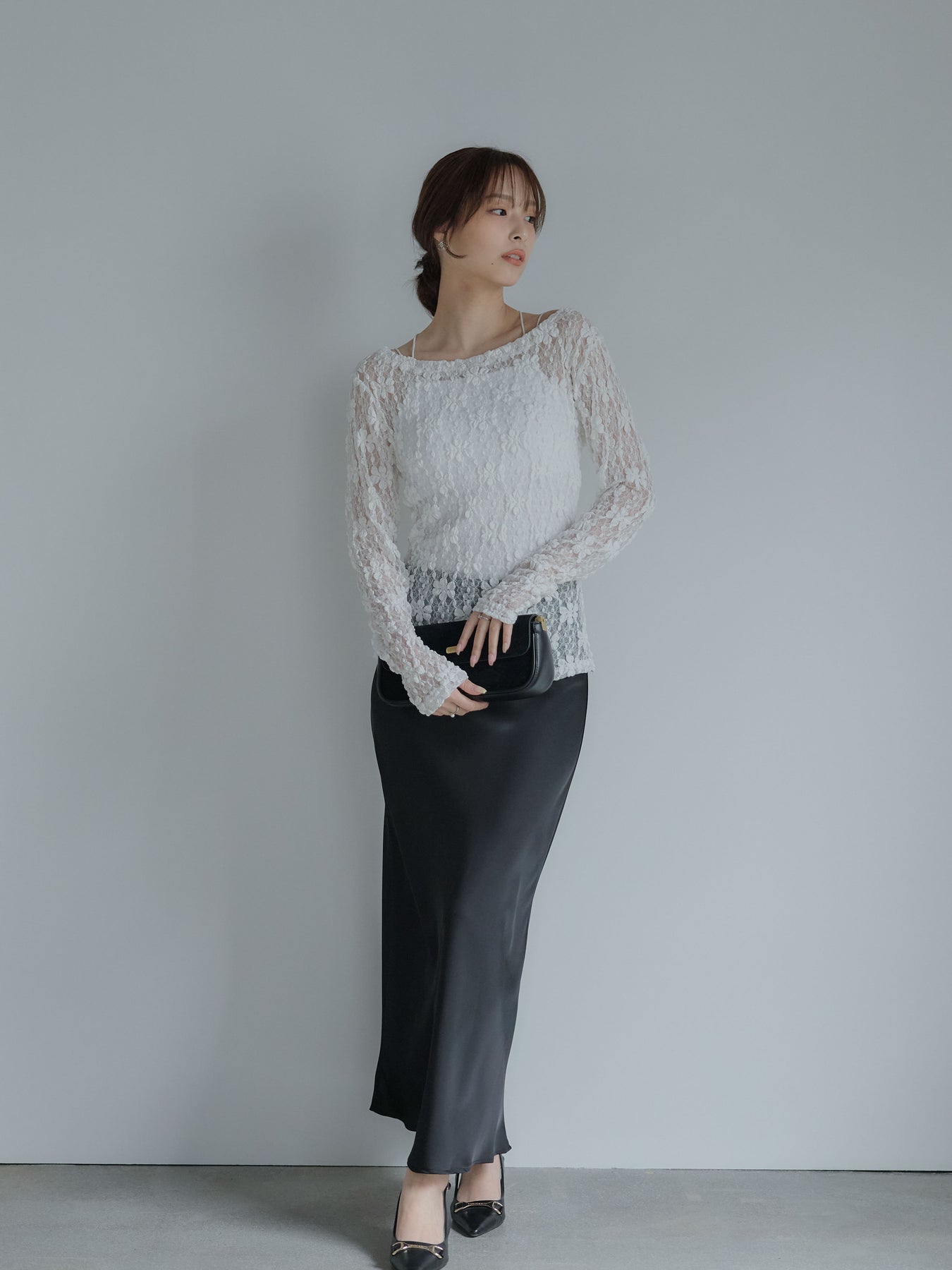 フラワージャガードデザインがシーズンムードを高めてくれるアイテム。サイドギャザーが施されており、自然にウエストに沿うので女性らしいシルエットに。大きめに開いたネックはデコルテを美しく見せてくれます。販売中のインナーを合わせて透け感を楽しんでいただくのがおすすめ。