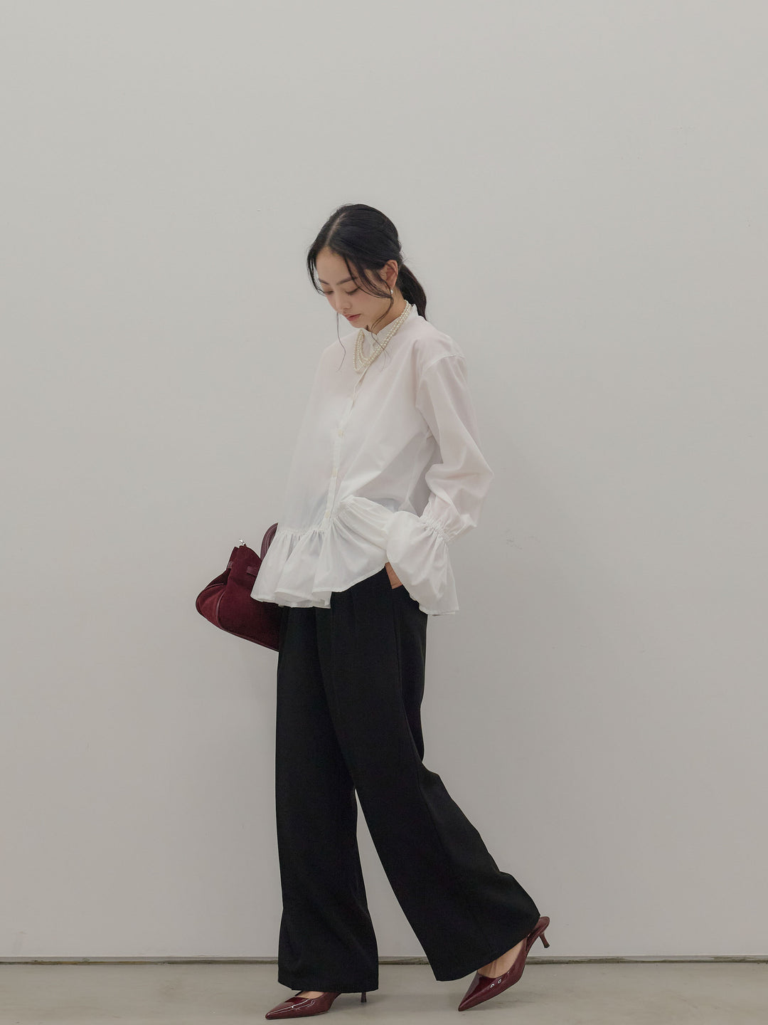 ラウンドネックベルスリーブペプラムブラウス