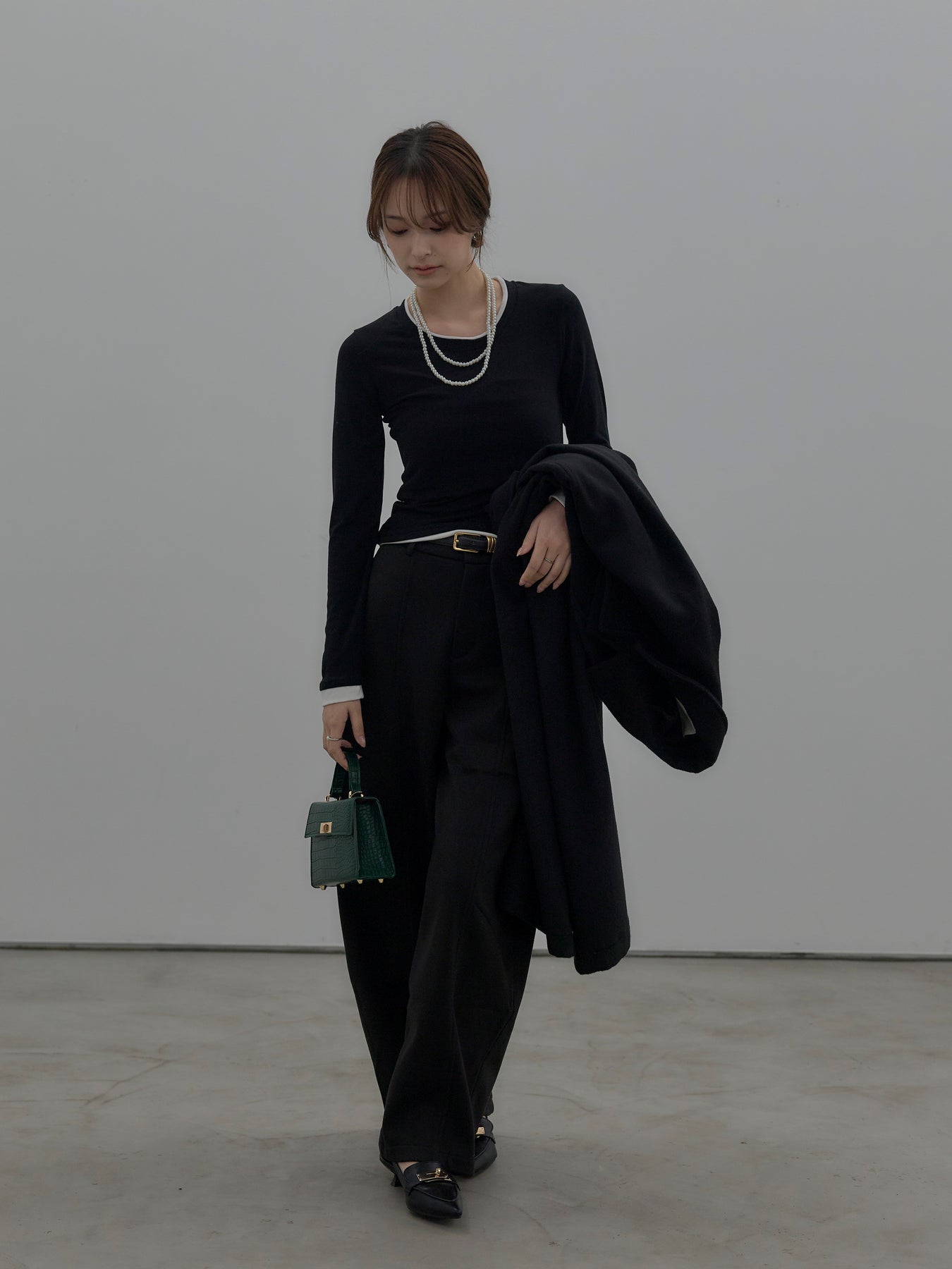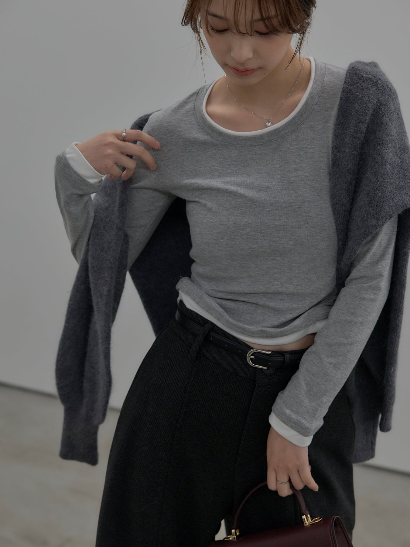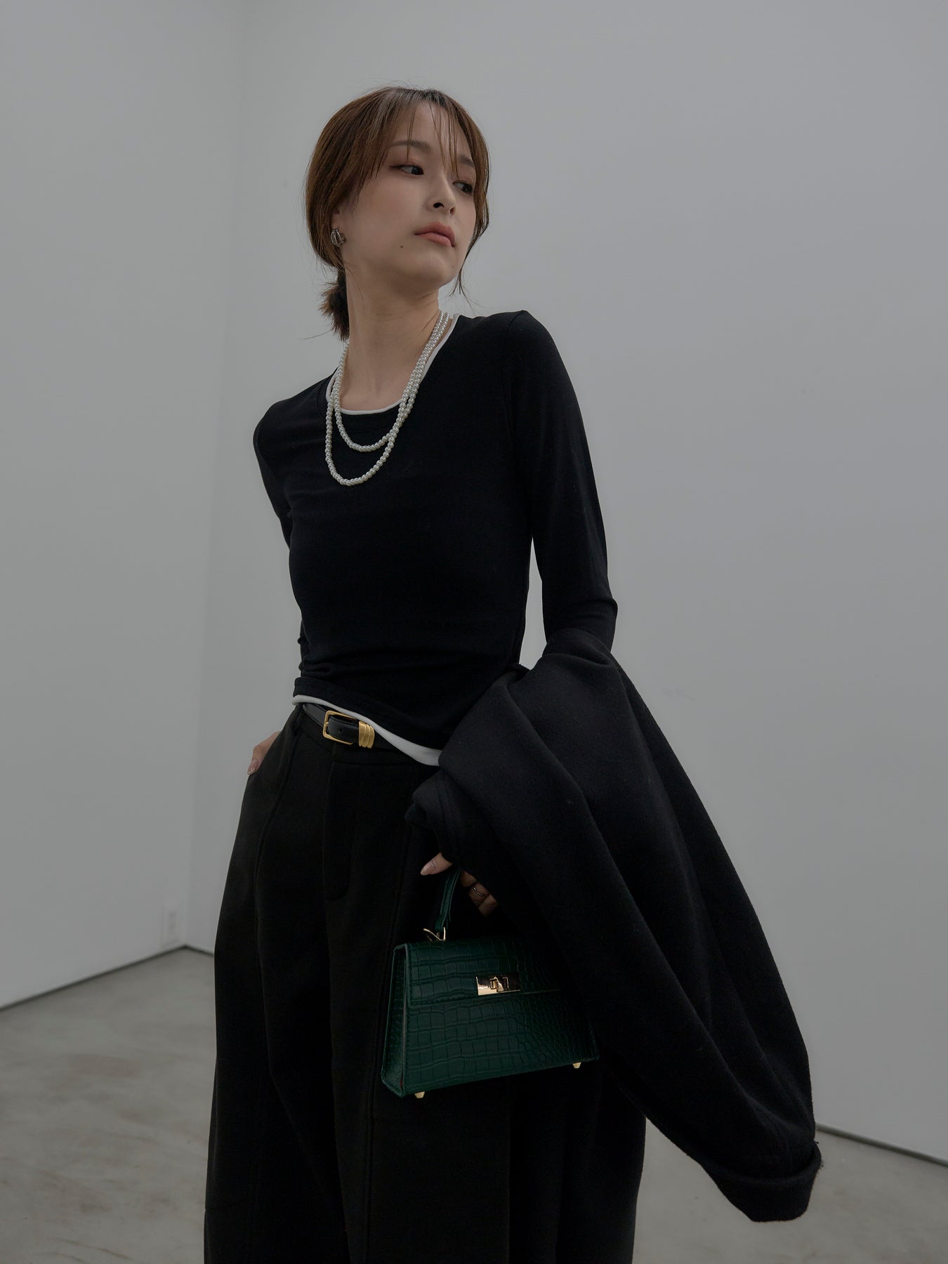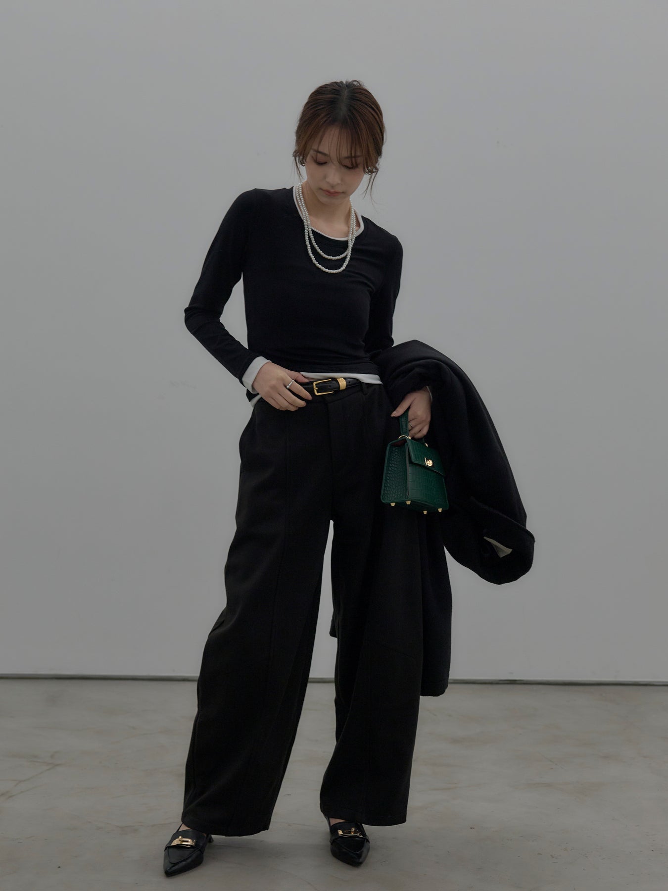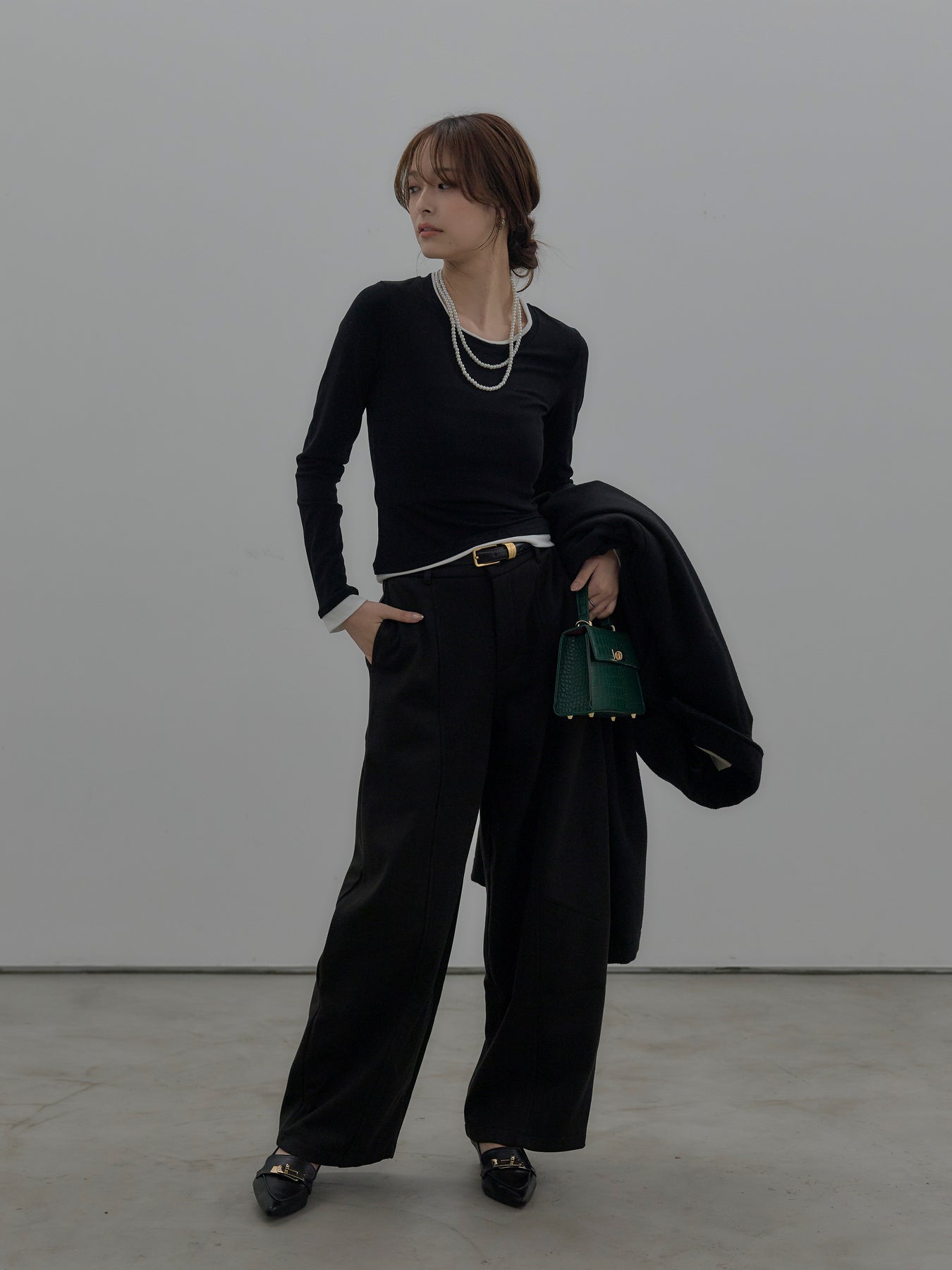 【SET】バイカラーレイヤードカットソー+カーブデザインスウェットライクパンツ(2set)