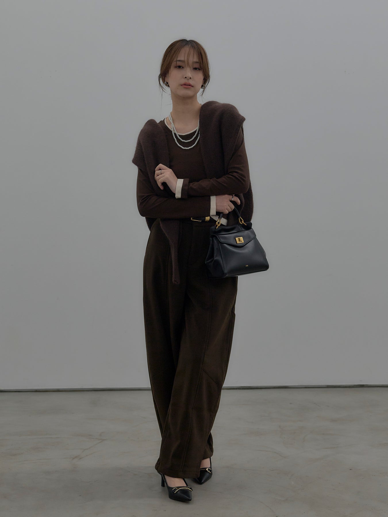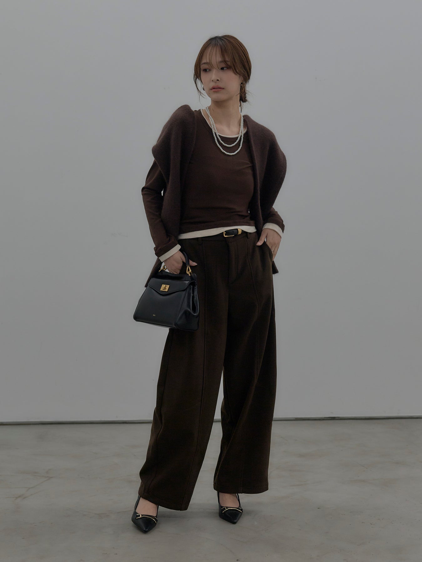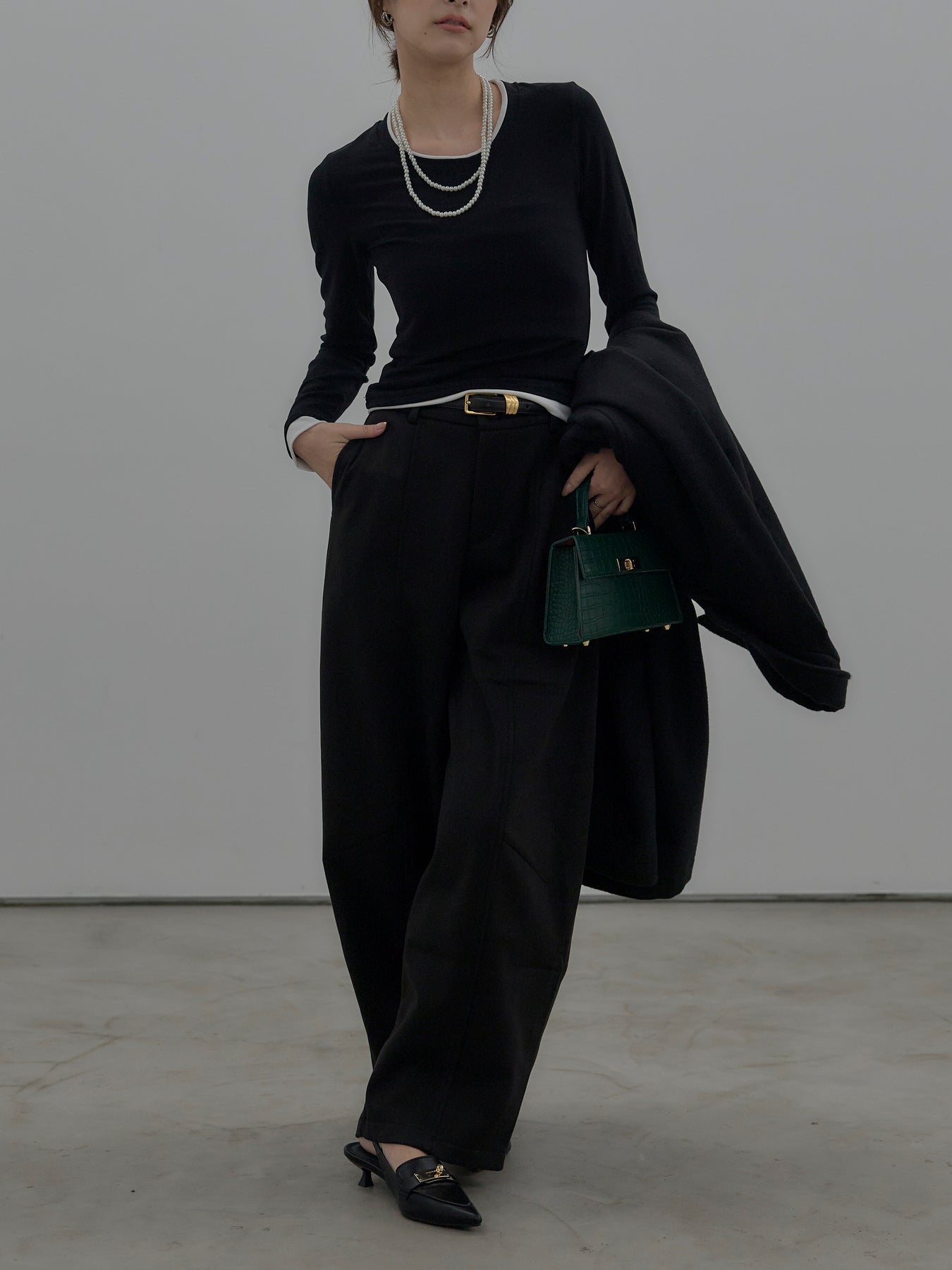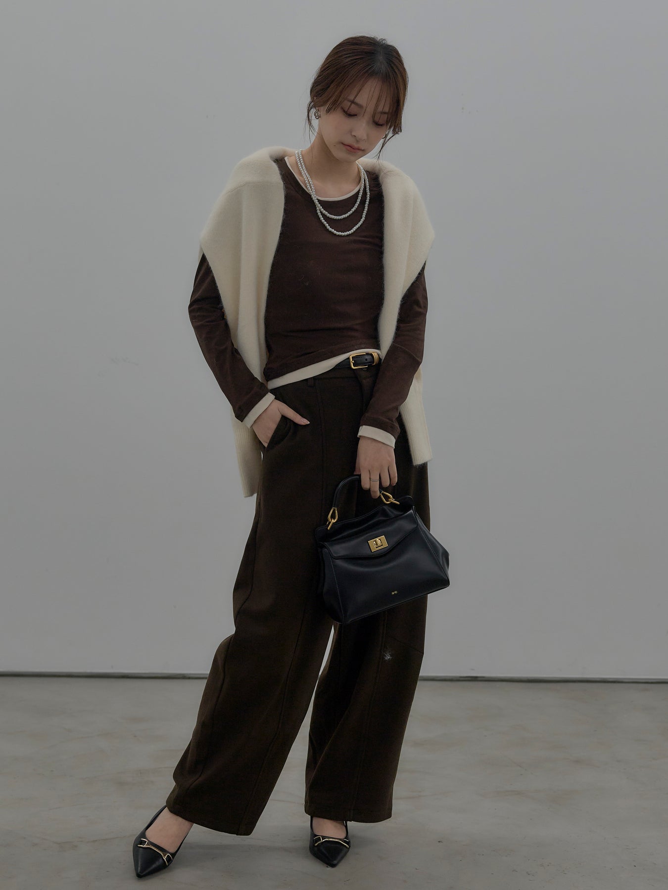 緩やかなカーブラインが特徴のスウェットライクパンツ。 リラックス感のある穿き心地ながら、立体的なシルエットでスタイルよく見せてくれます。 カジュアルすぎず上品さもあるデザインで、デイリーコーデに自然と馴染む万能ボトムです。