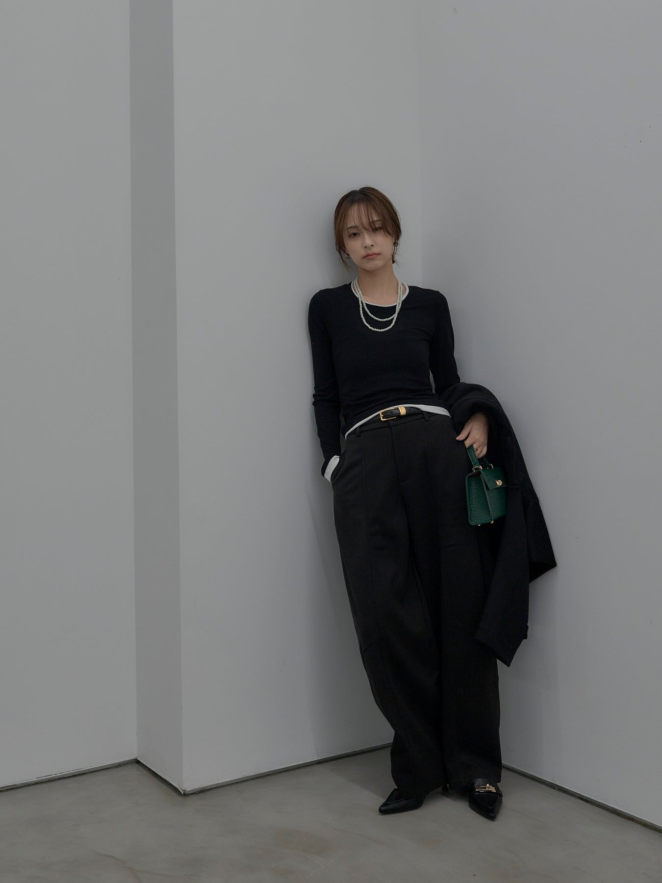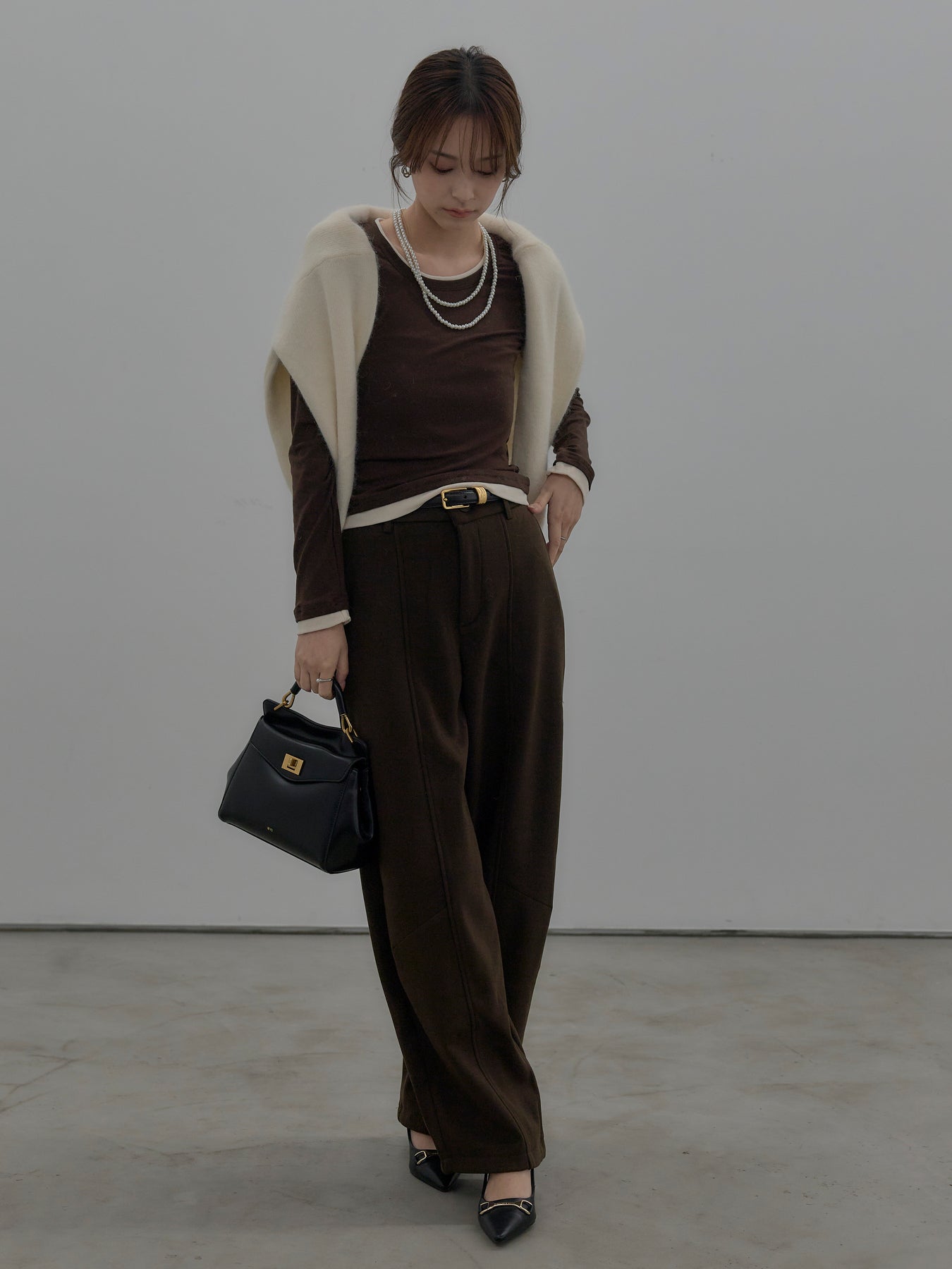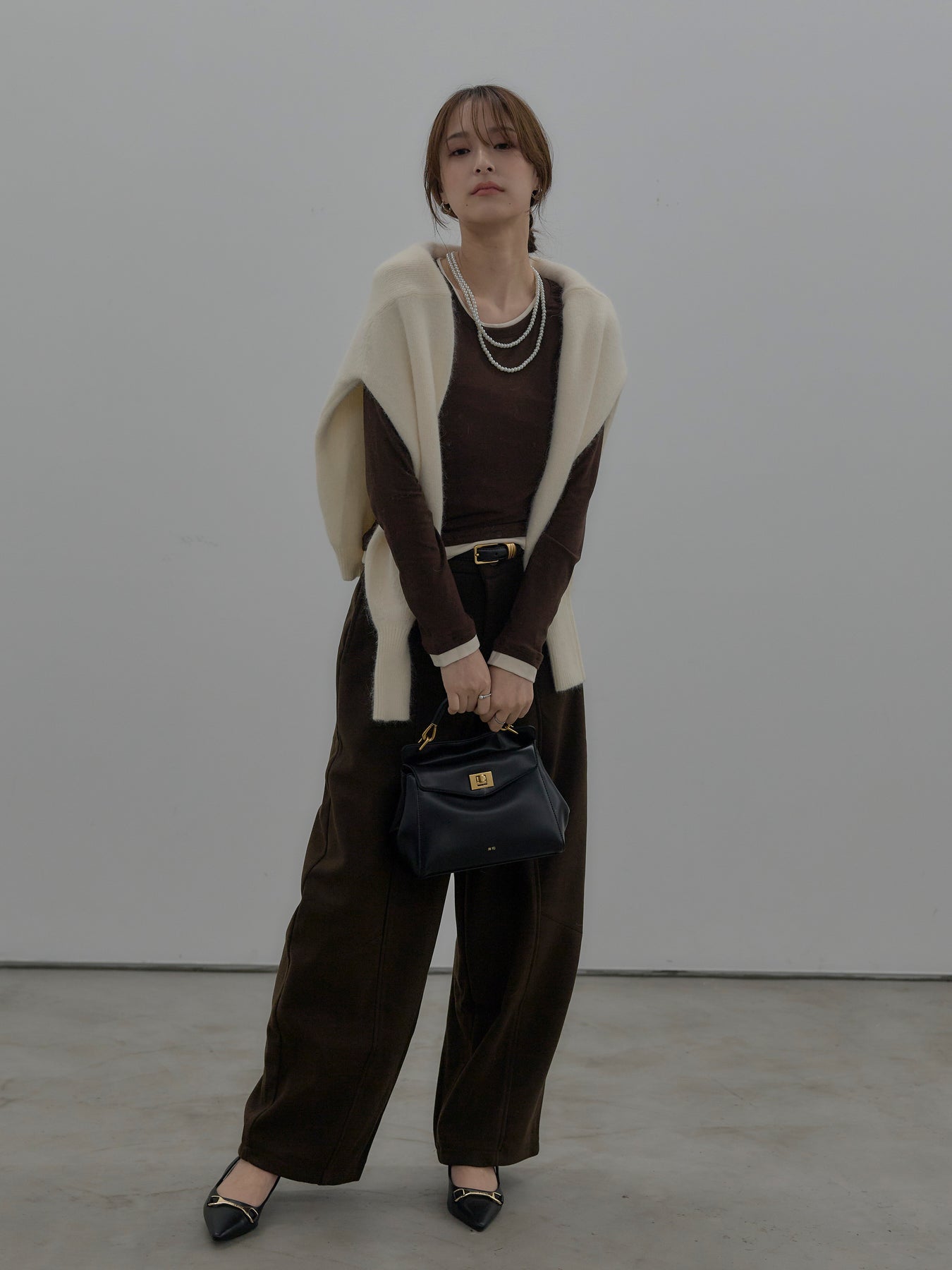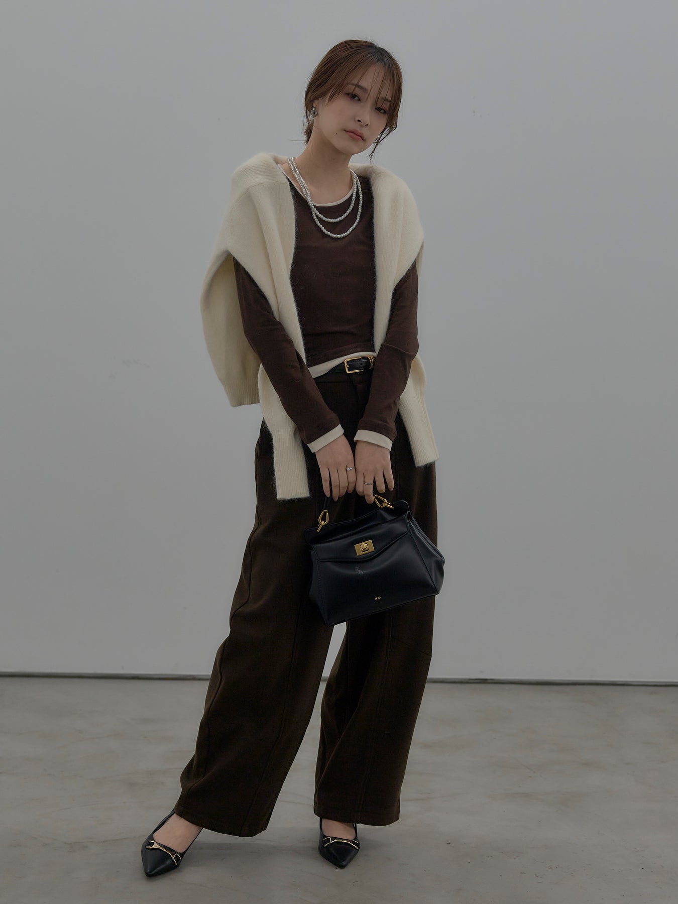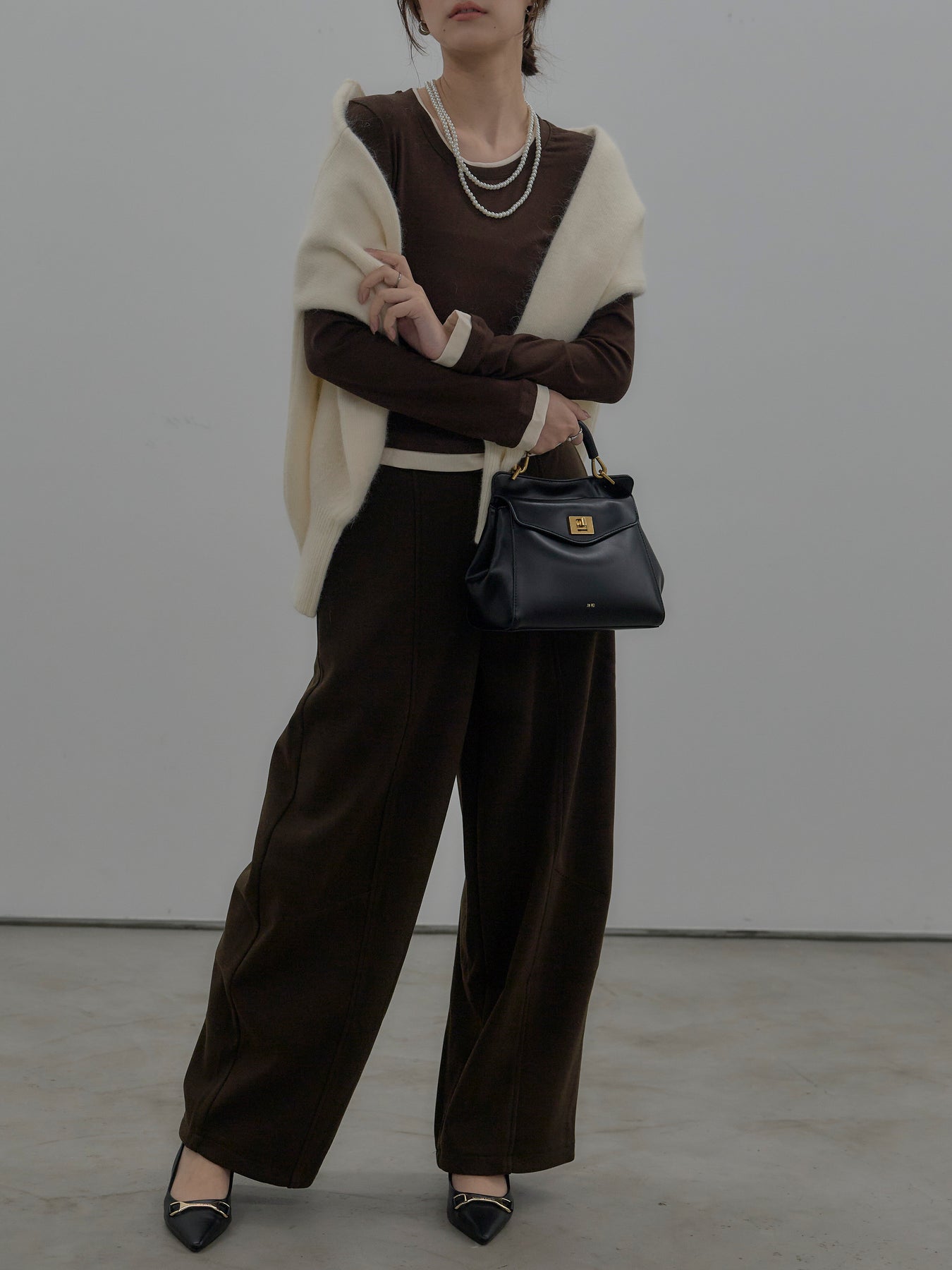 緩やかなカーブラインが特徴のスウェットライクパンツ。 リラックス感のある穿き心地ながら、立体的なシルエットでスタイルよく見せてくれます。 カジュアルすぎず上品さもあるデザインで、デイリーコーデに自然と馴染む万能ボトムです。