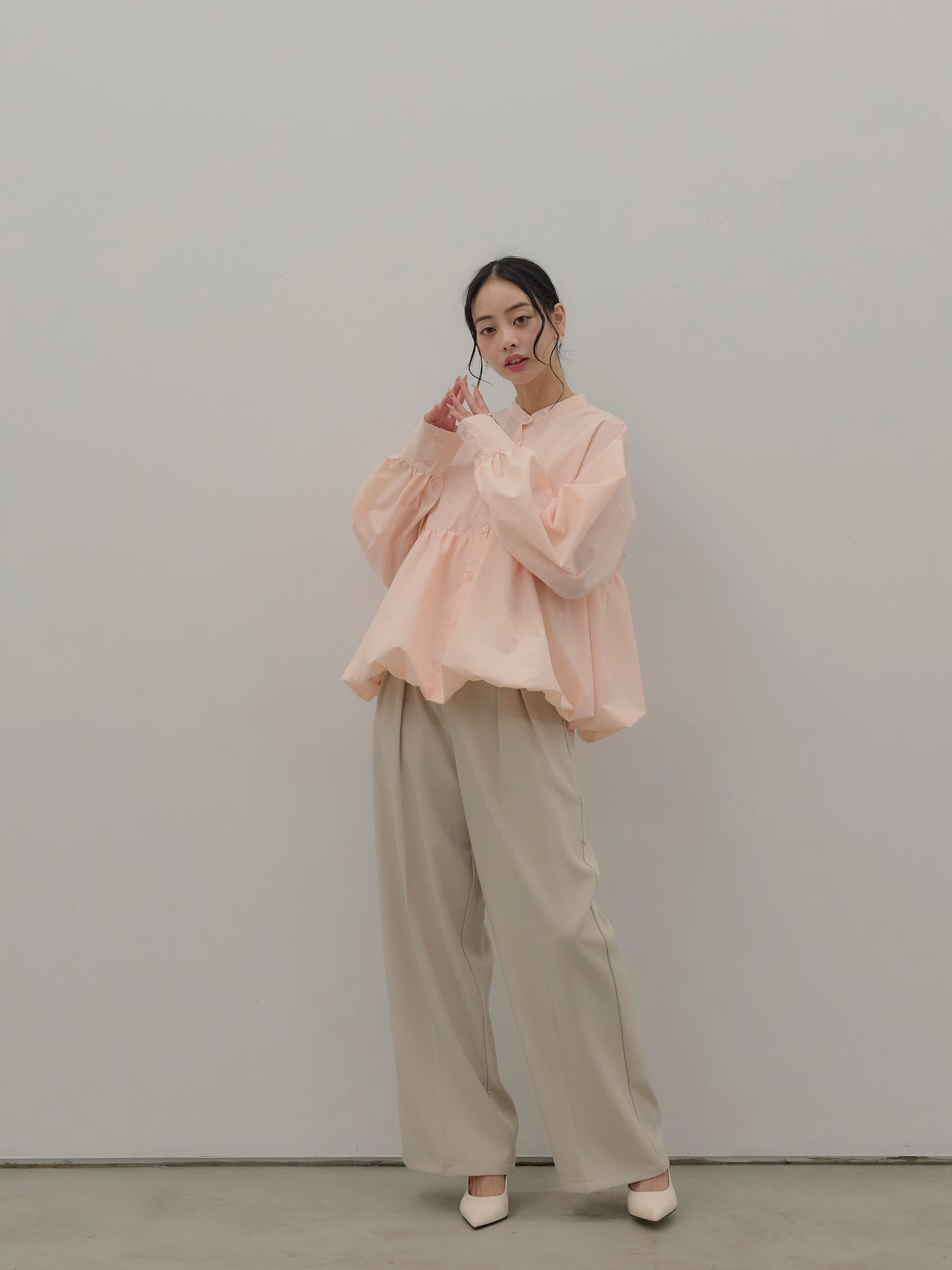ハリのあるブロード素材を使用したバルーンシルエットのシャツ。