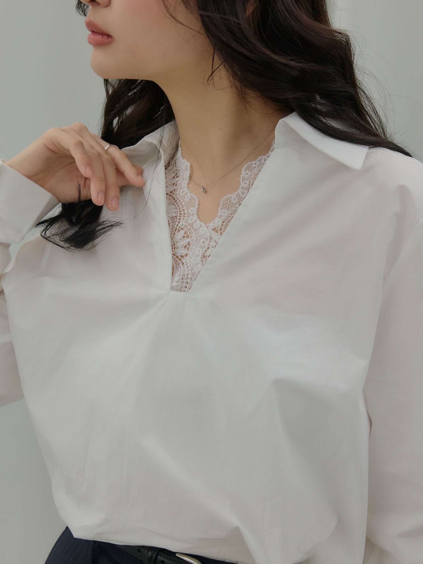 シャープなシャツの構造に、レースの繊細さを忍ばせた一枚。深すぎないVラインから覗くレースが、肌感を調整しながら女性らしさを引き出します。甘さを主張するのではなく、直線的なフォルムの中に静かに混ぜる設計。一枚で着ても、レイヤードしても成立し、スタイリングに奥行きを与えるシャツです。