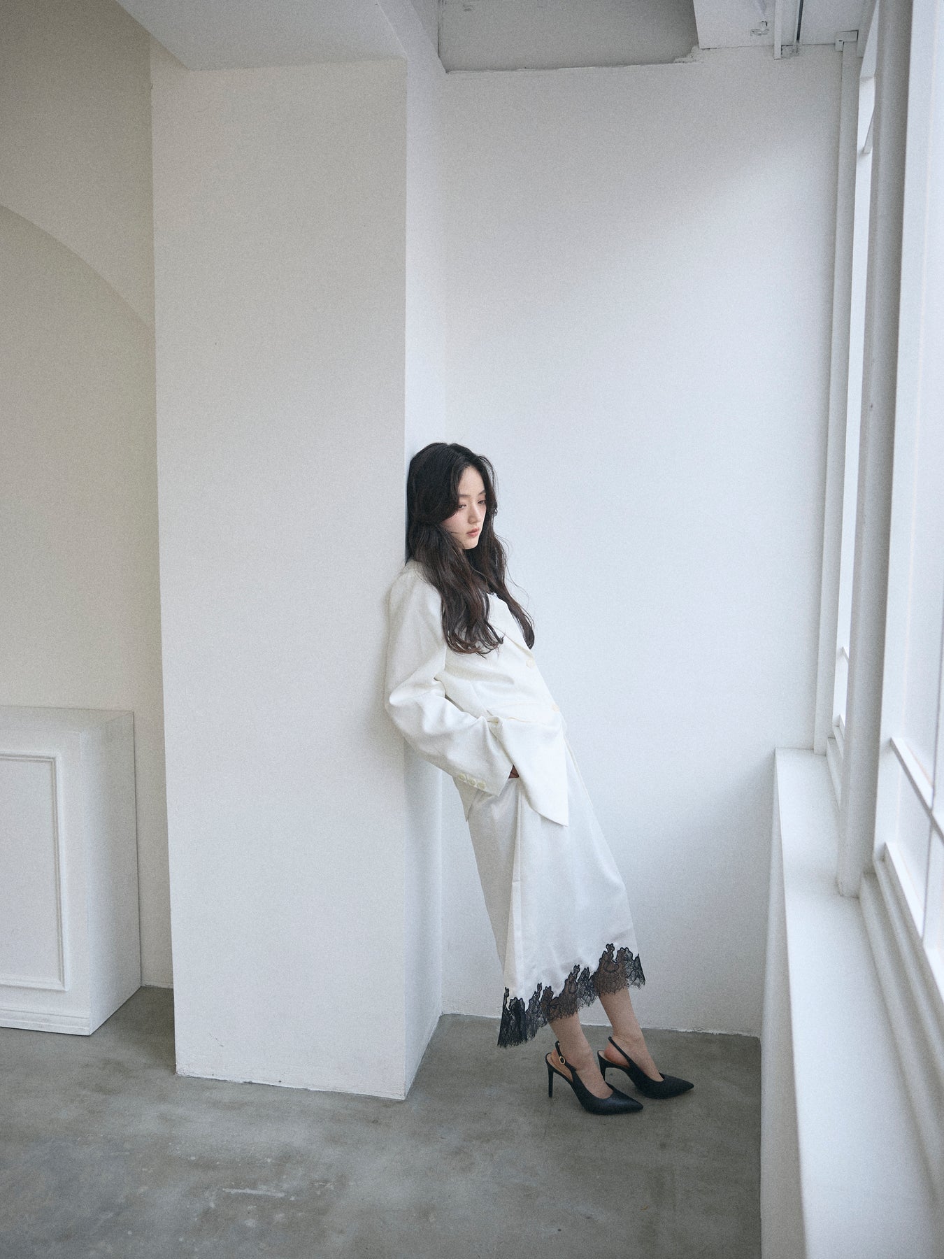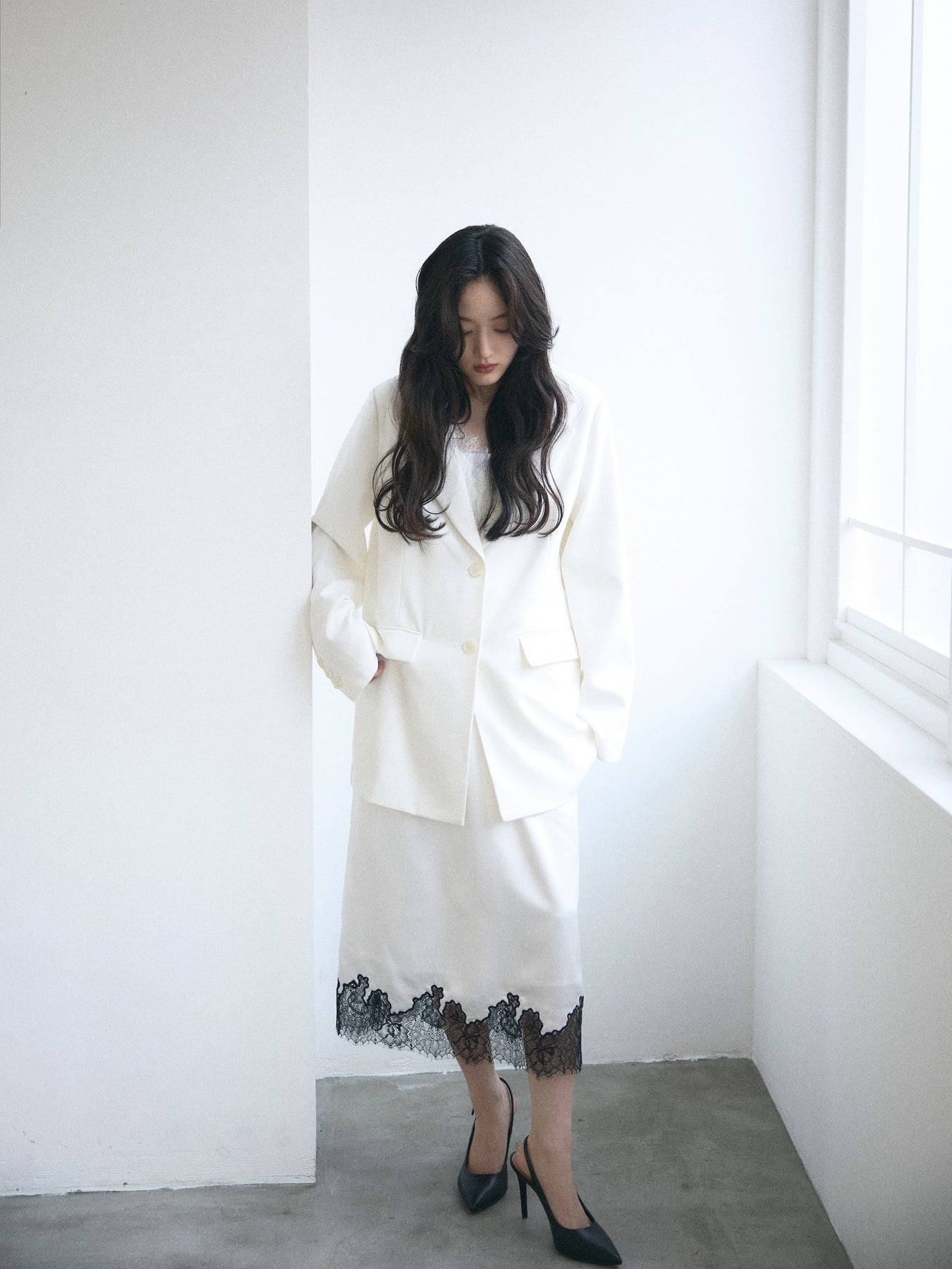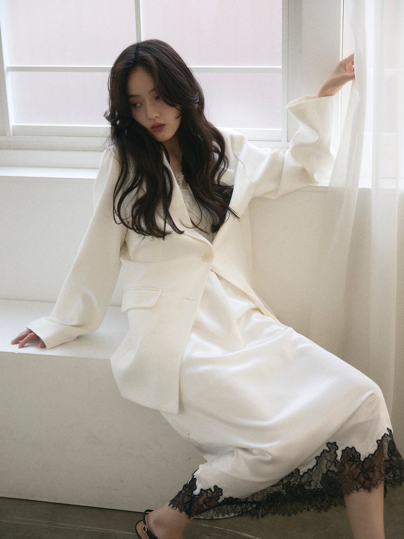 ワンピースやキャミソールに重ねればセンシュアルに、同素材のパンツと合わせれば端正なセットアップとしても成立します。