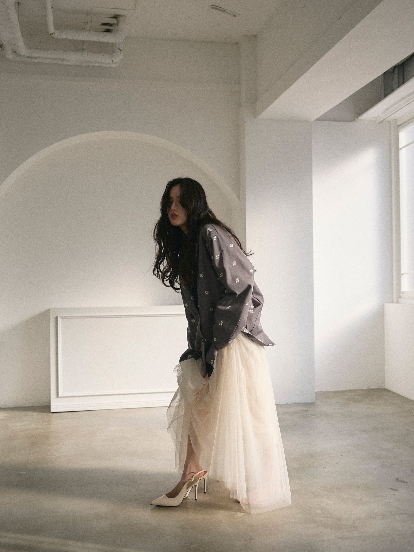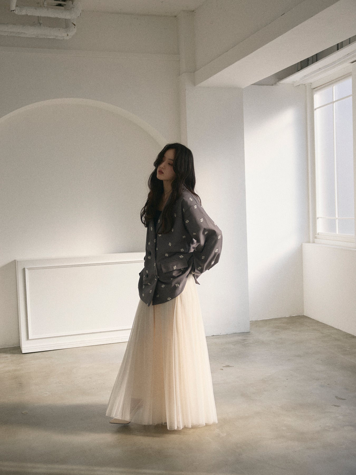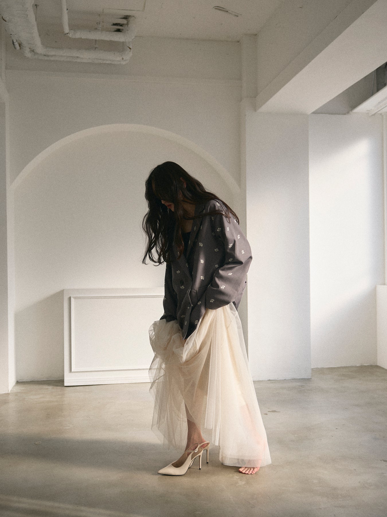 【モデル着用サイズ:M】重ねたチュールでボリュームたっぷりのスカートに仕上げました。振り向く瞬間、ドラマチックな裾の広がりに心躍ること間違いなし。オールシーズン使えてどんなアイテムとも好相性です。