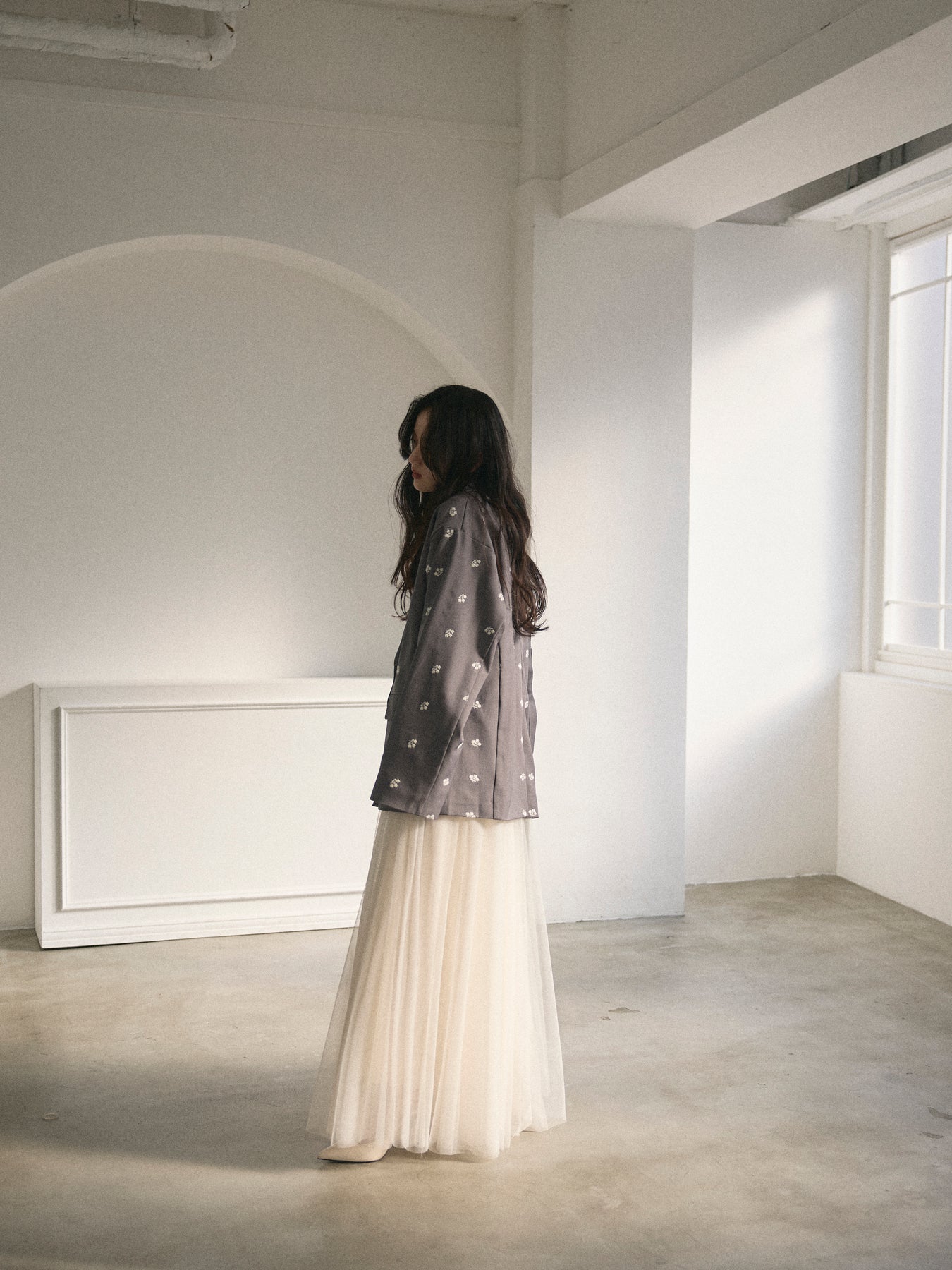 フラワー刺繍が施されたテーラードジャケット。今の気分にぴったりなやや大きめなつくりなのでスタイリングに抜け感を生んでくれます。白で統一された刺繍でさりげないガーリーなアクセントになってくれます。一着で華やかなのでボトムはシンプルな組み合わせを楽しんでいただけます。裏地付き。