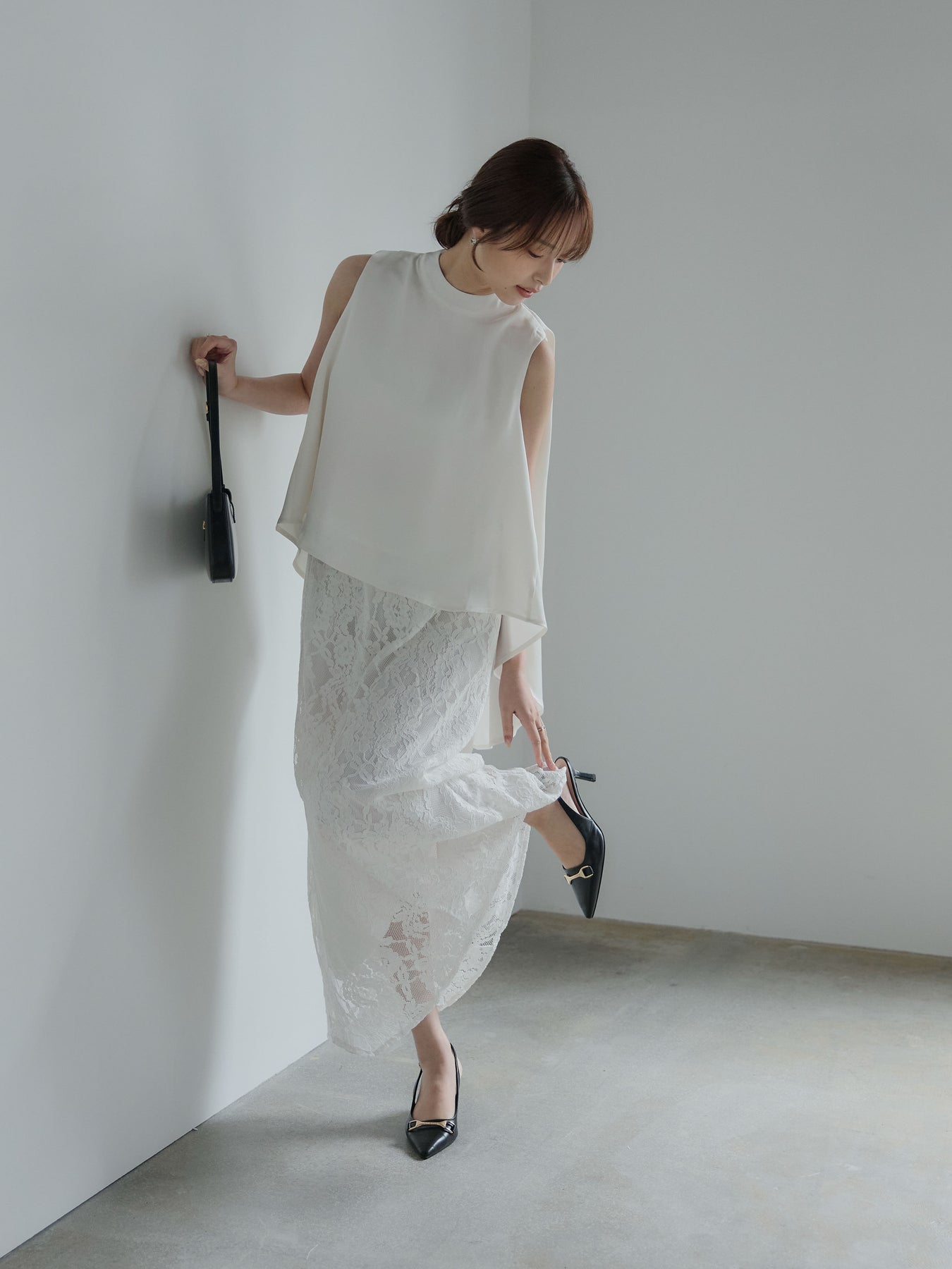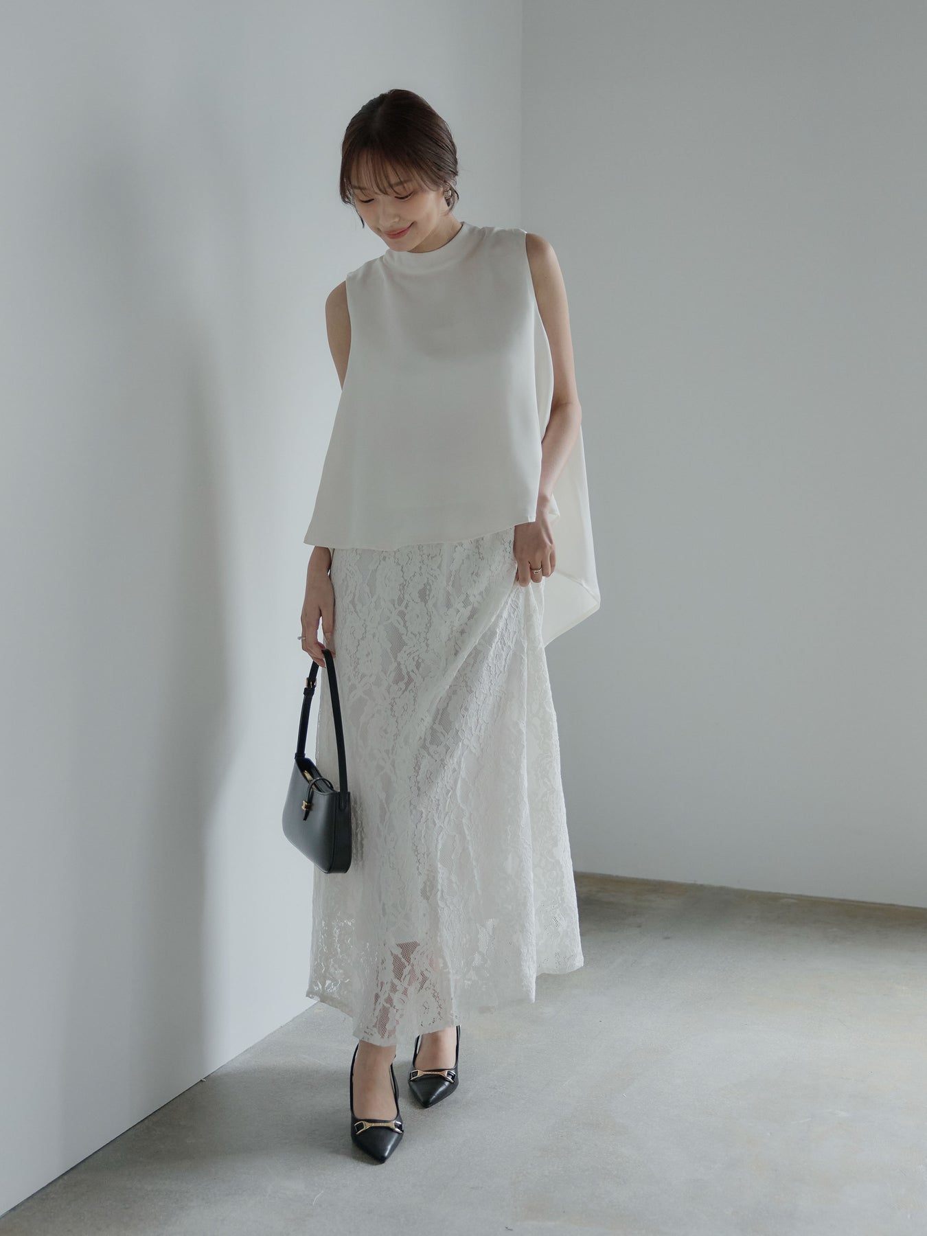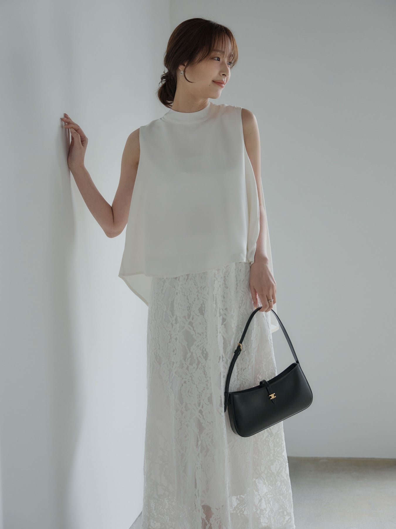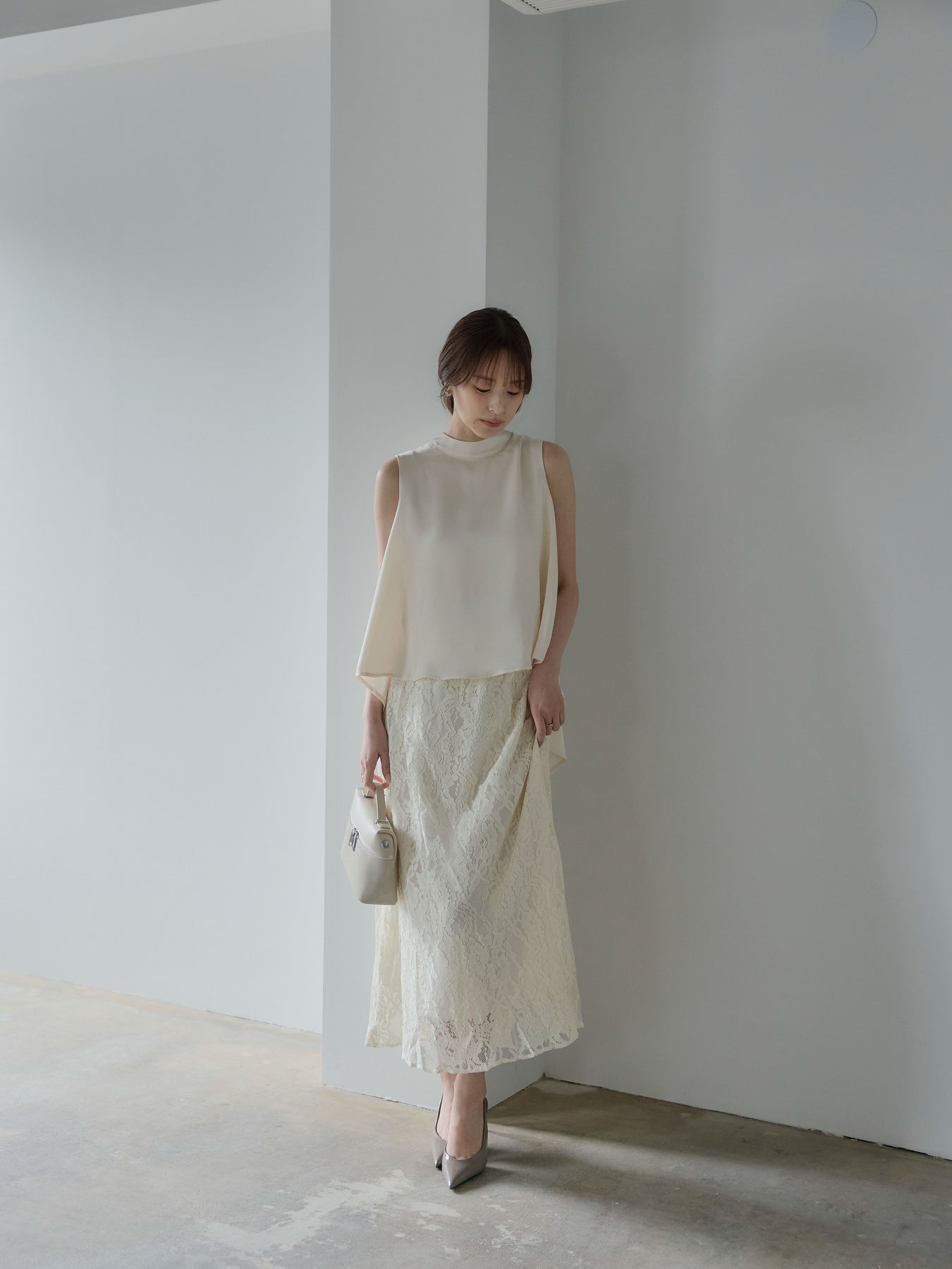 上品な光沢が魅力のサテン素材で仕立てたノースリーブトップス。
