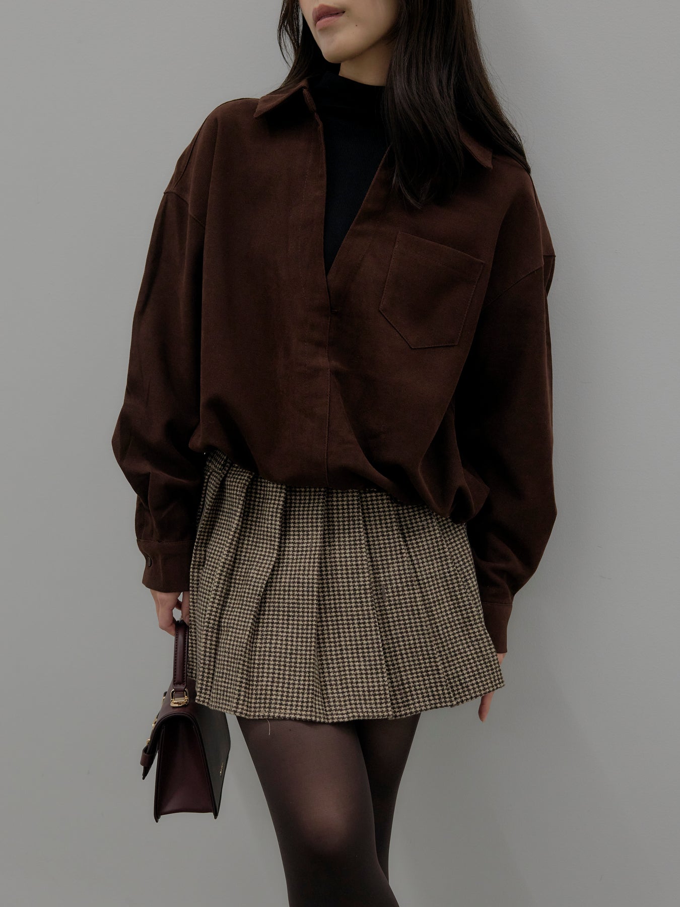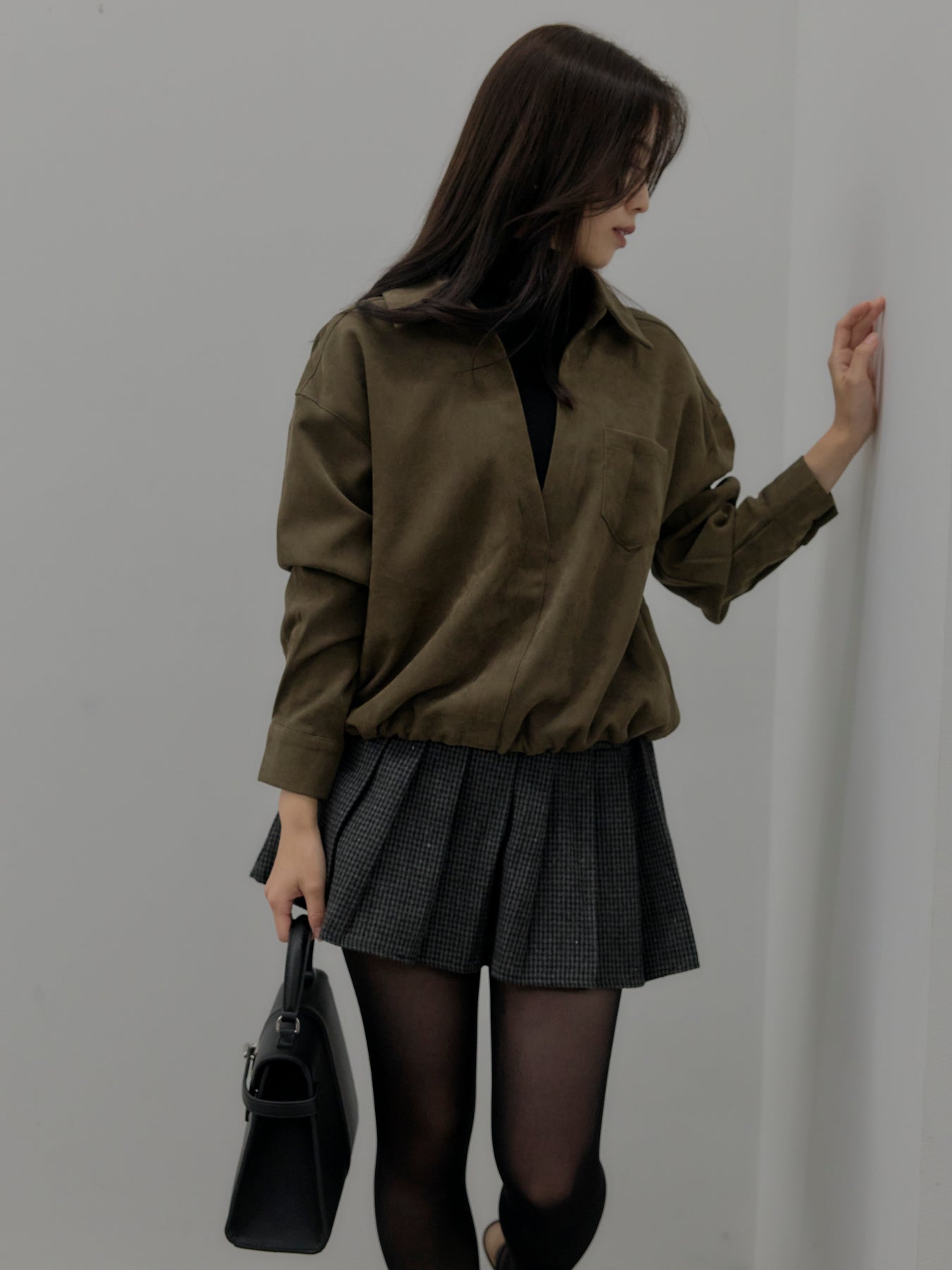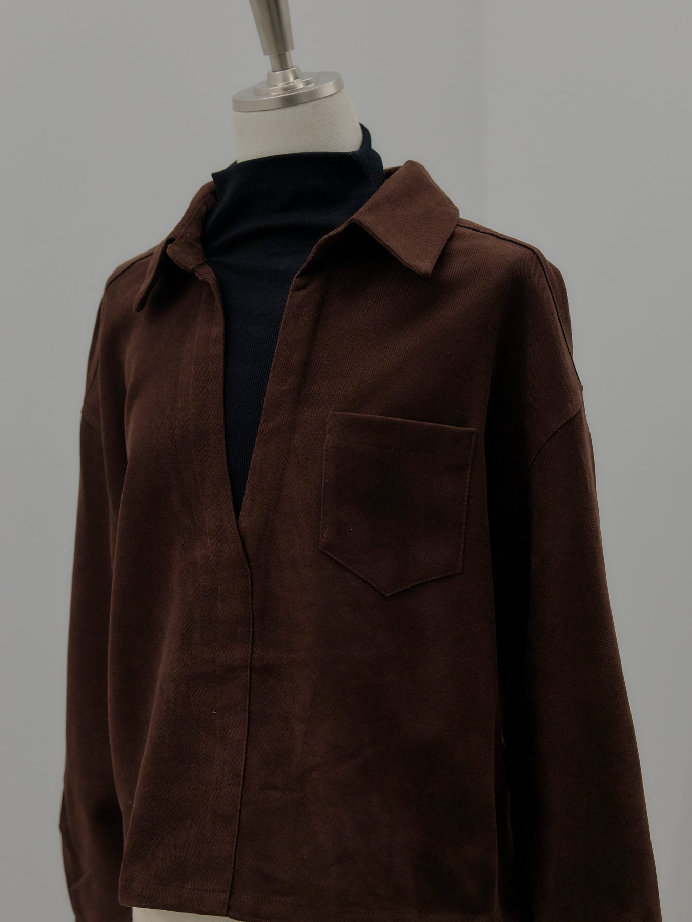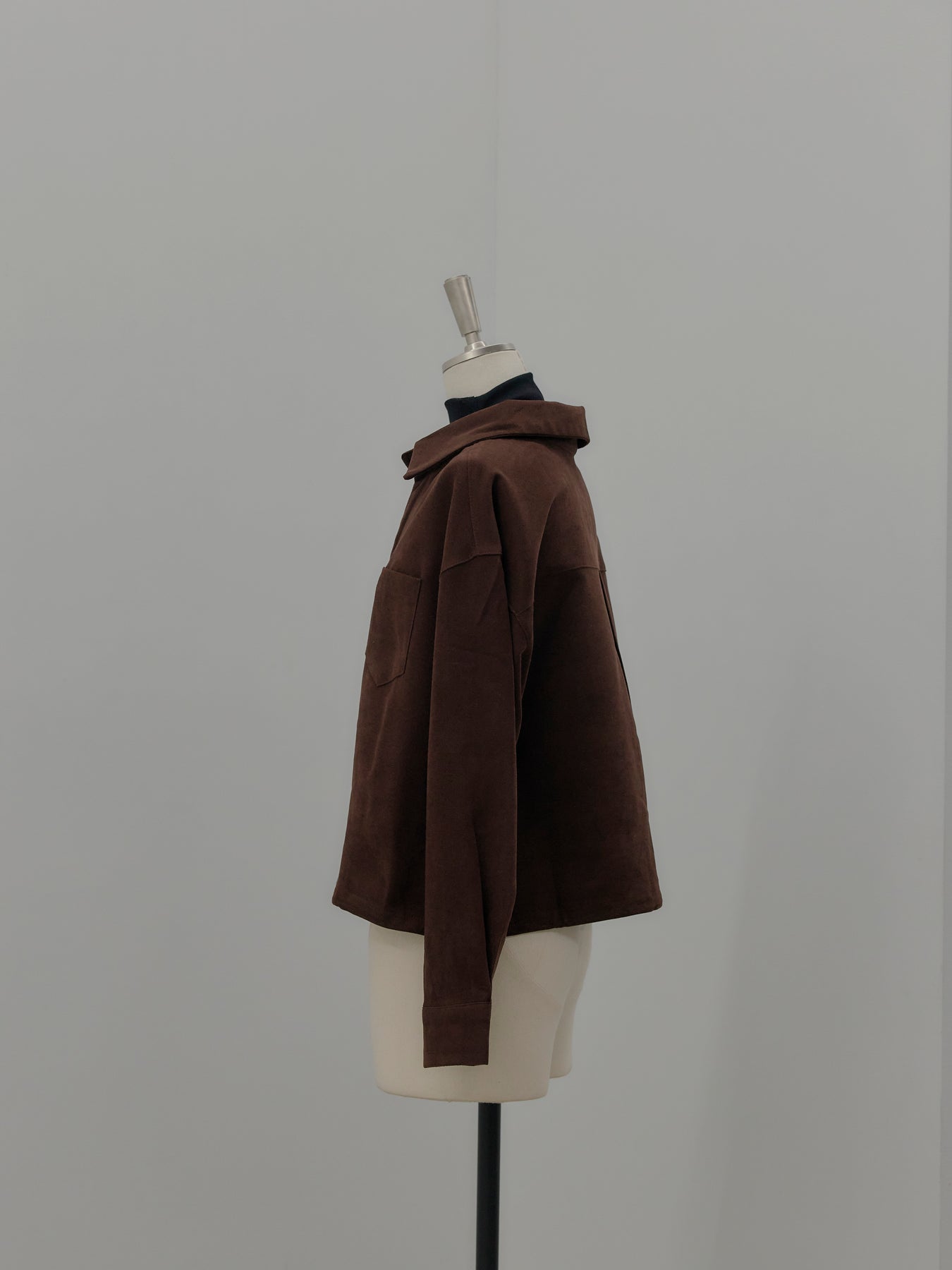 異素材を組み合わせたドッキングデザインが魅力のスエードシャツ。