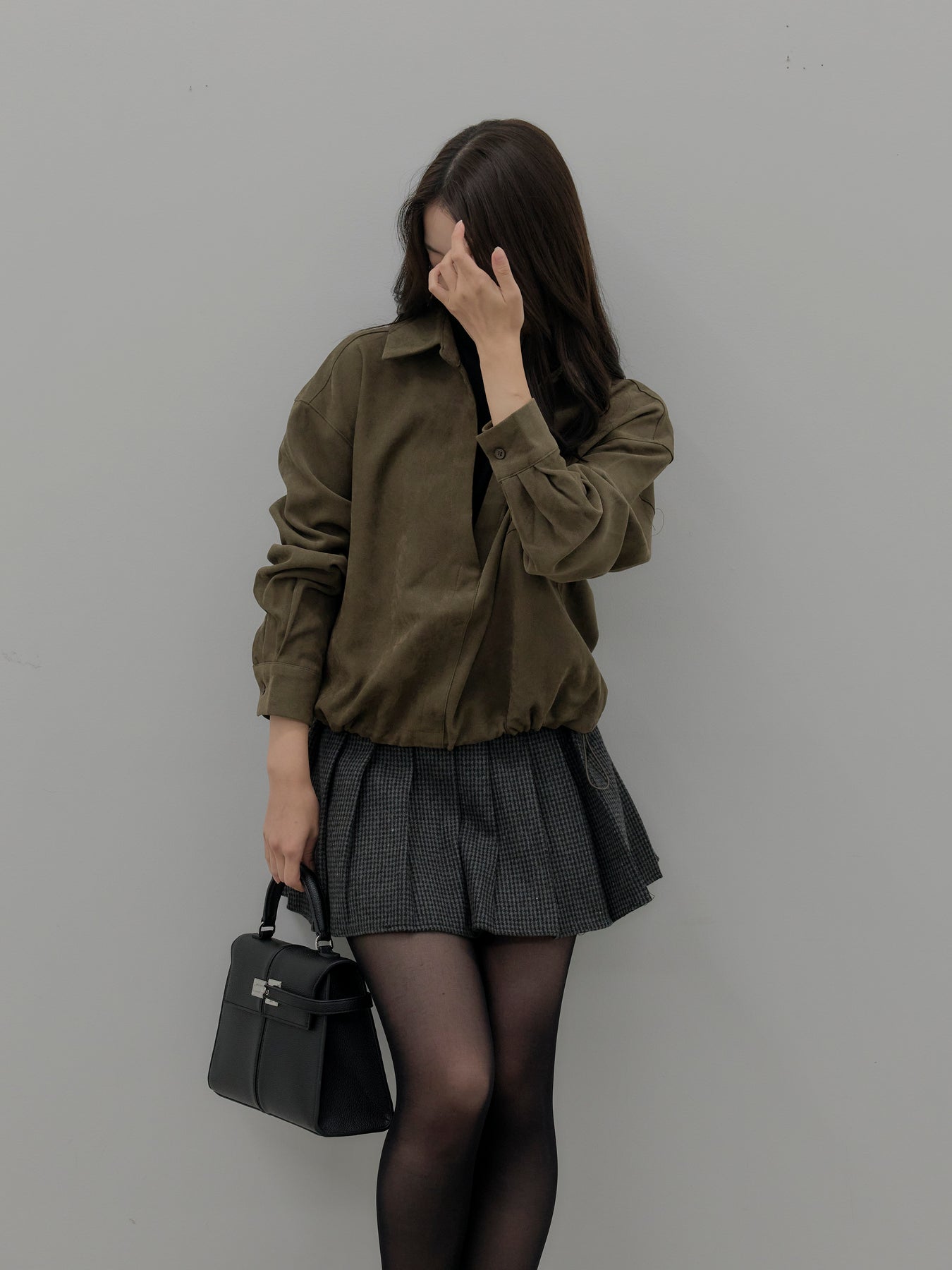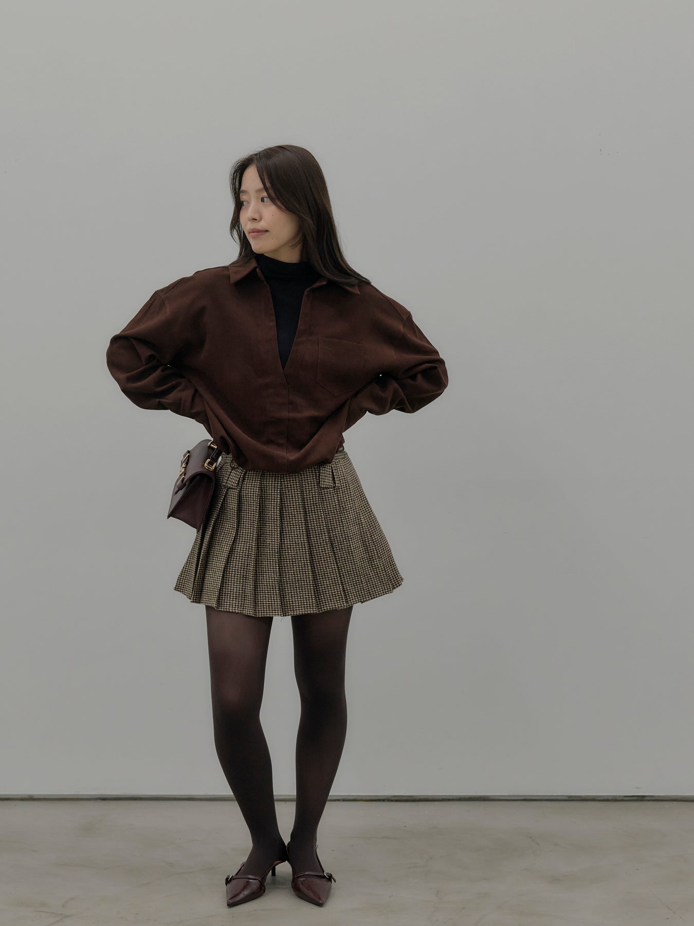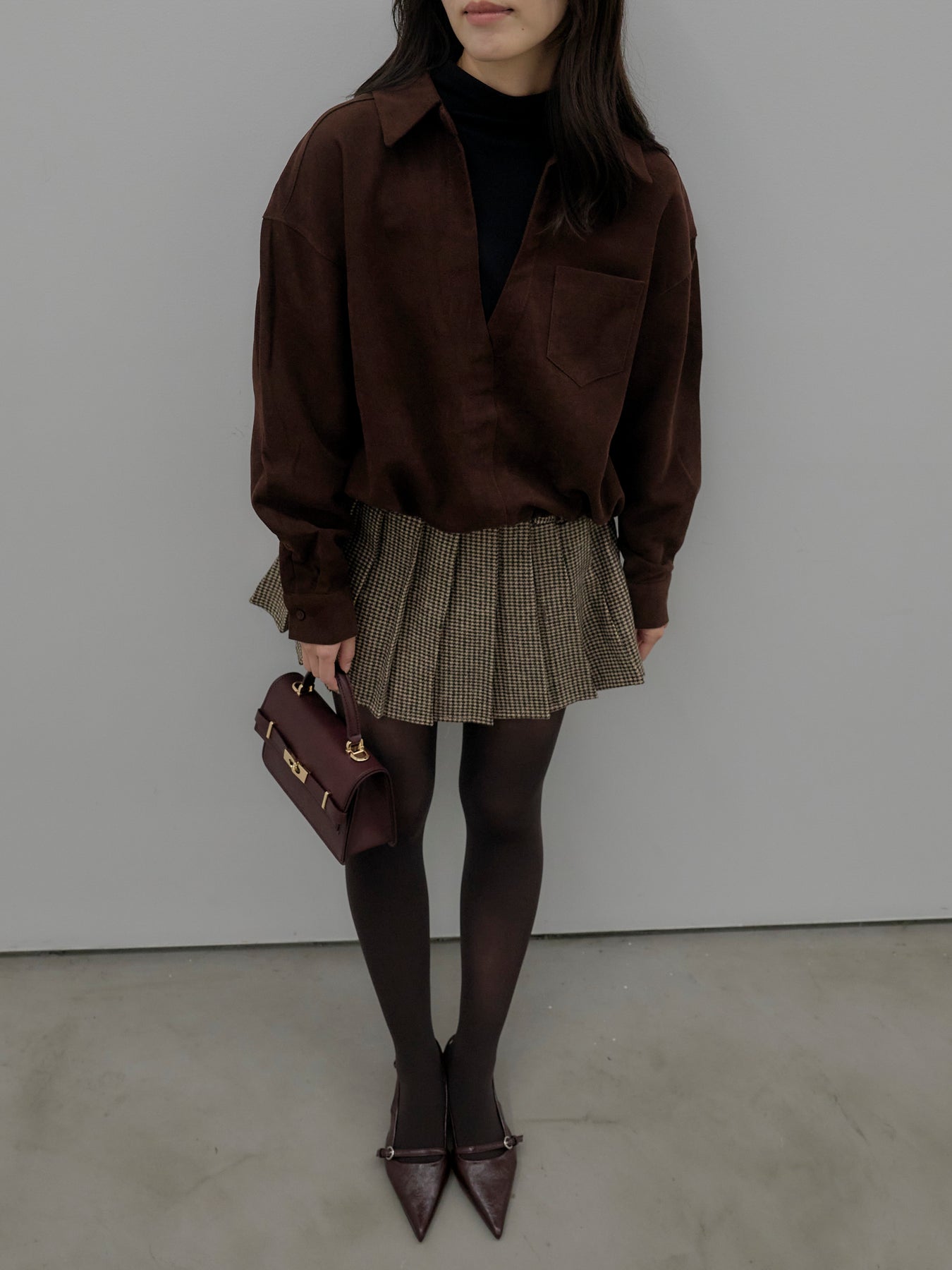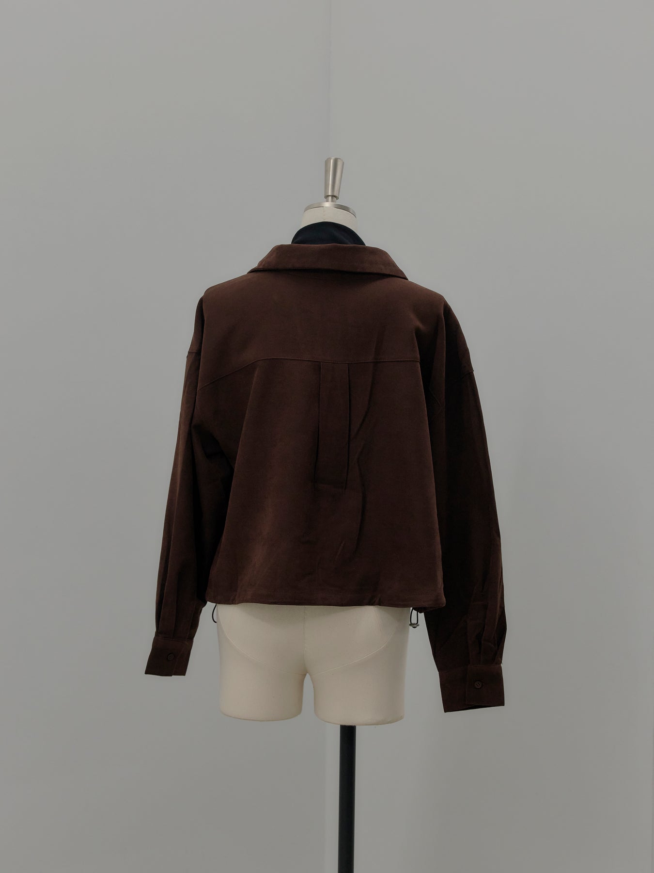 異素材を組み合わせたドッキングデザインが魅力のスエードシャツ。