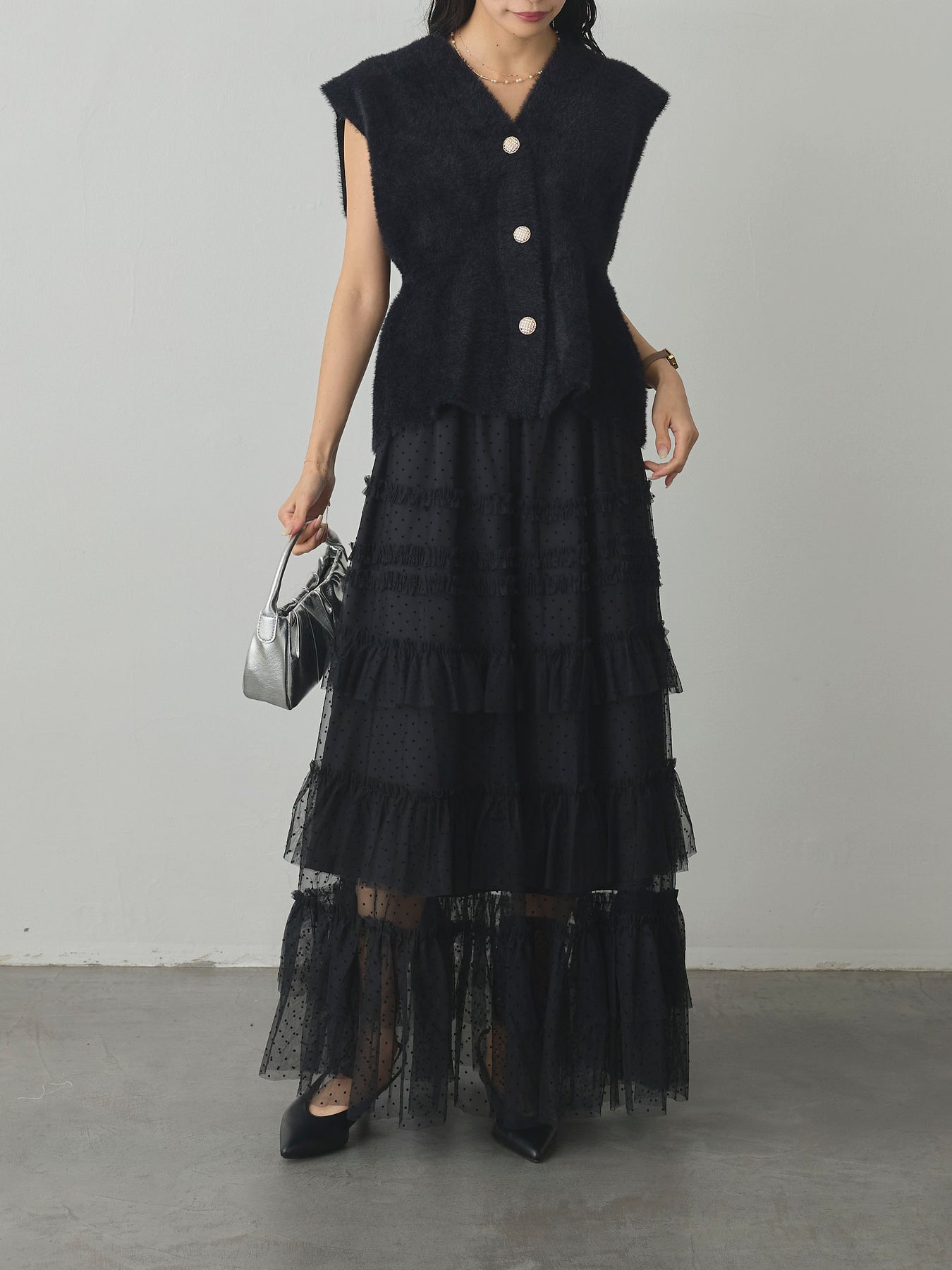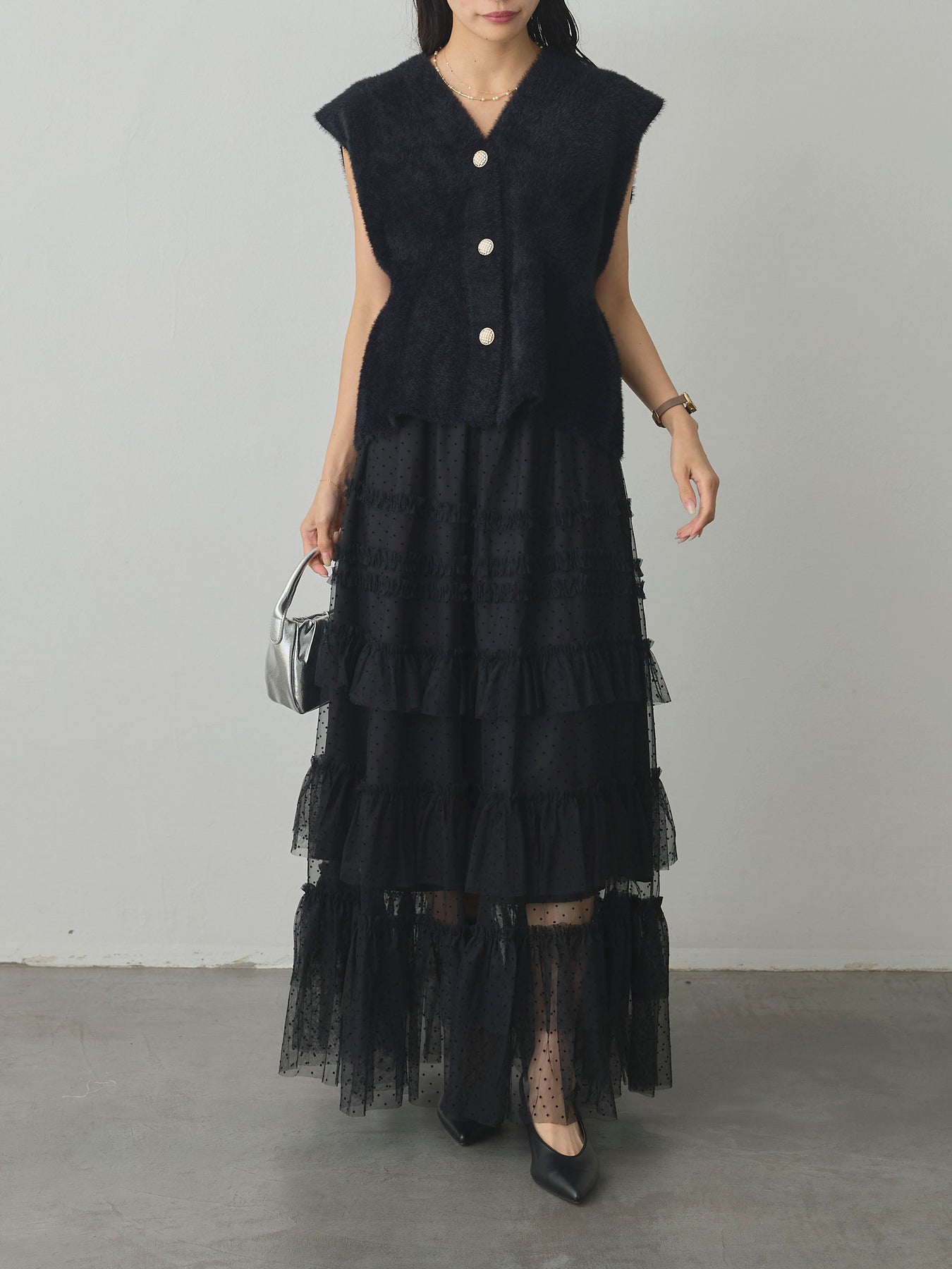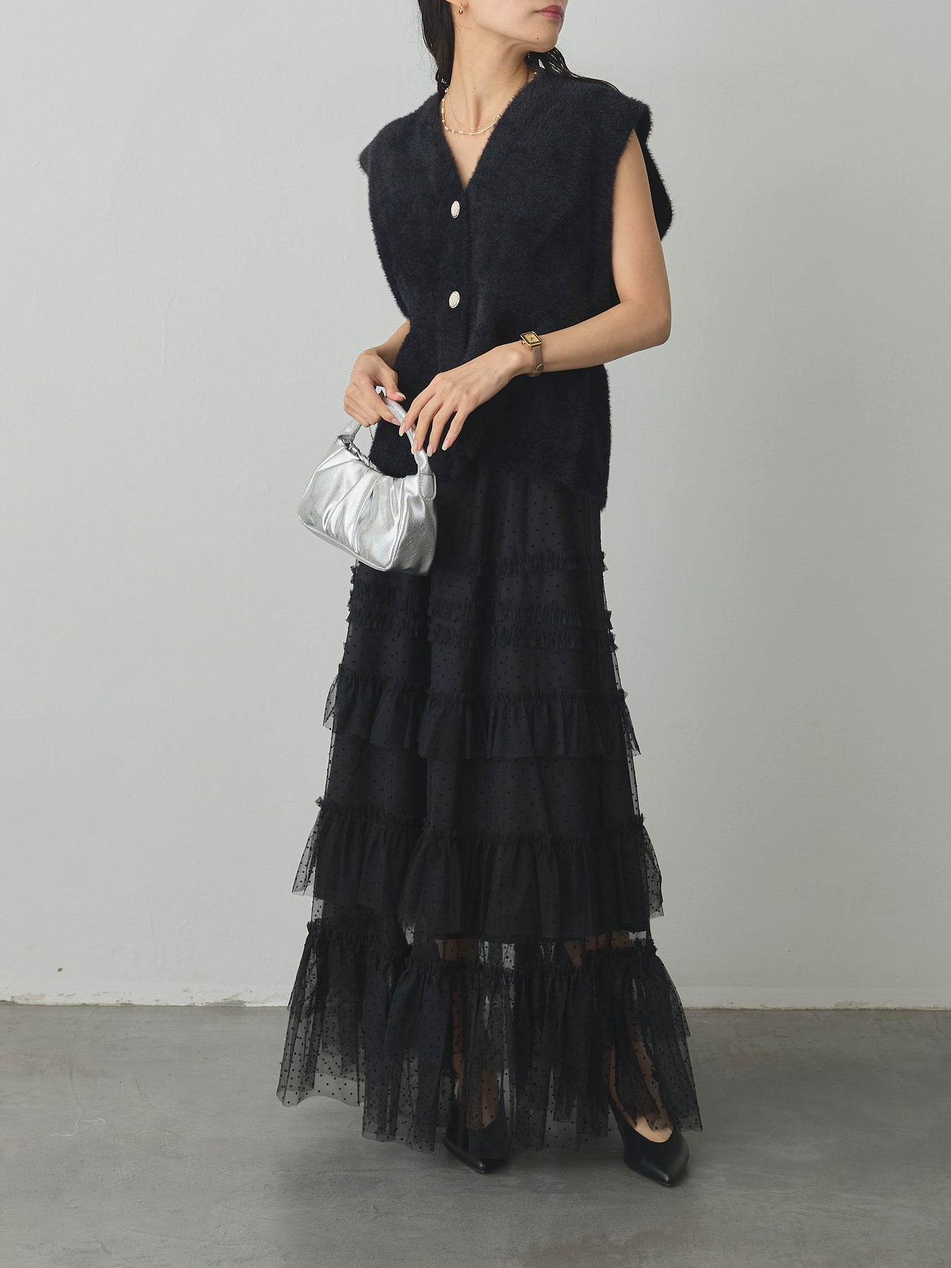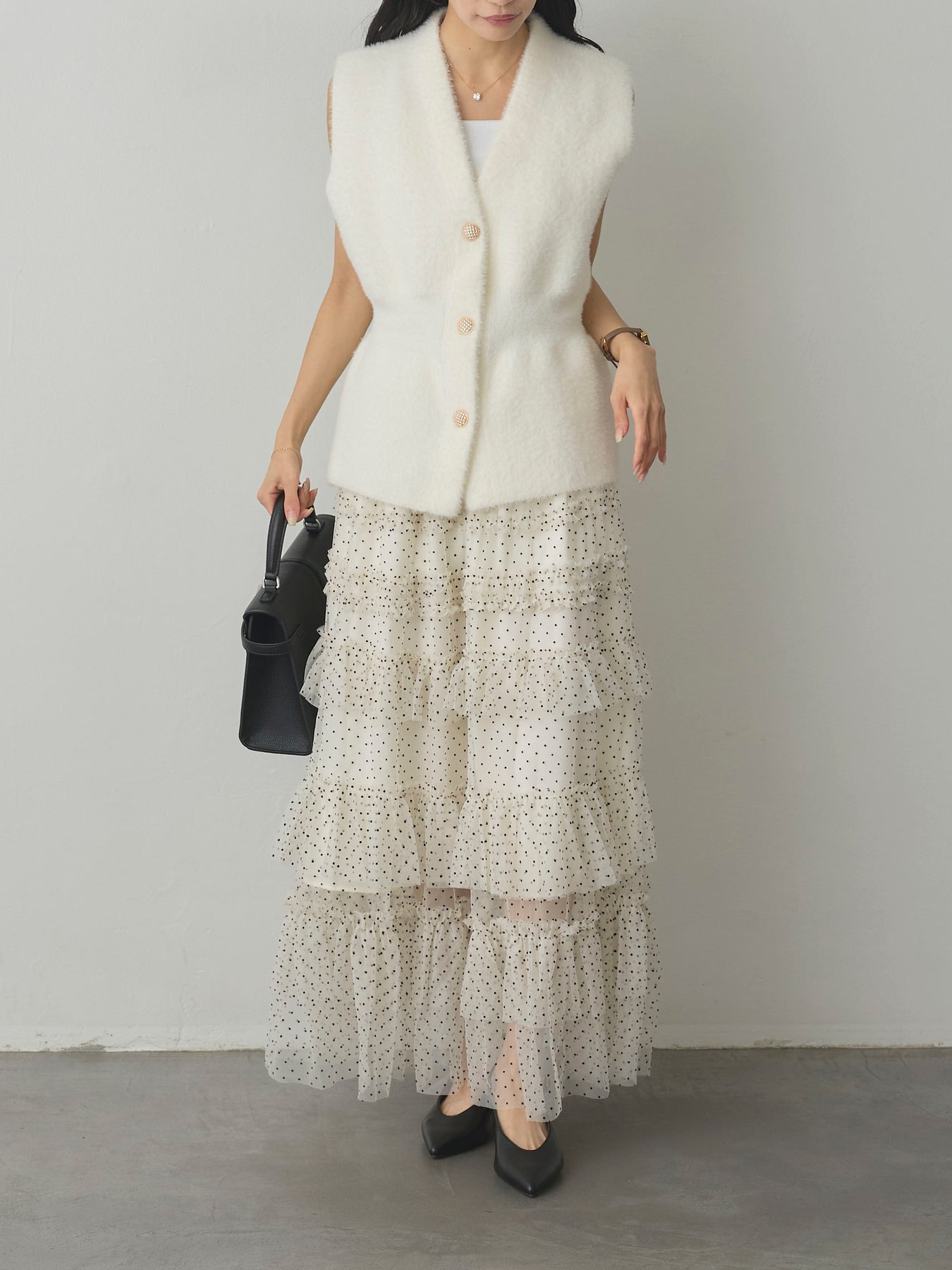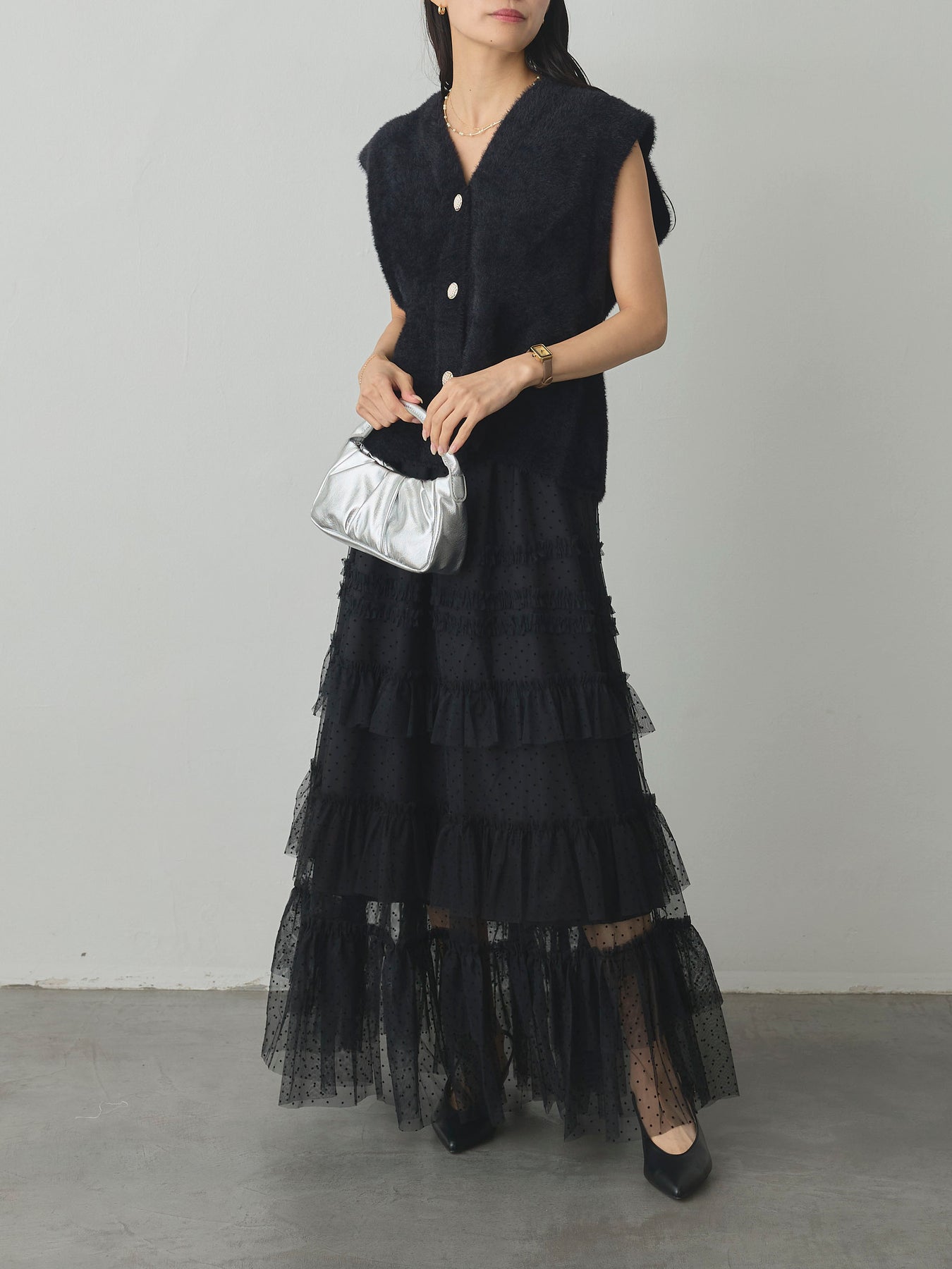 軽やかなチュール素材にドットをあしらい、ティアードデザインで華やかに仕上げたスカート。動くたびに揺れるシルエットが女性らしさを引き立て、シンプルなトップスと合わせるだけでコーディネートが完成します。