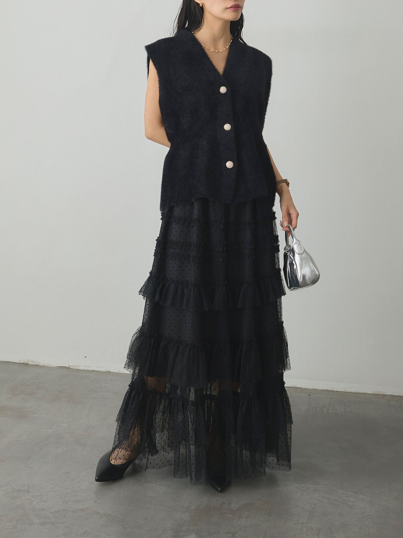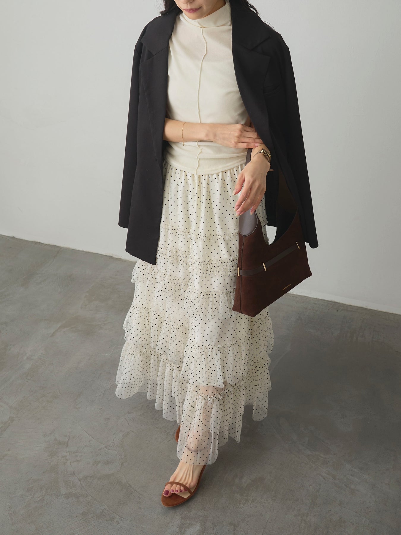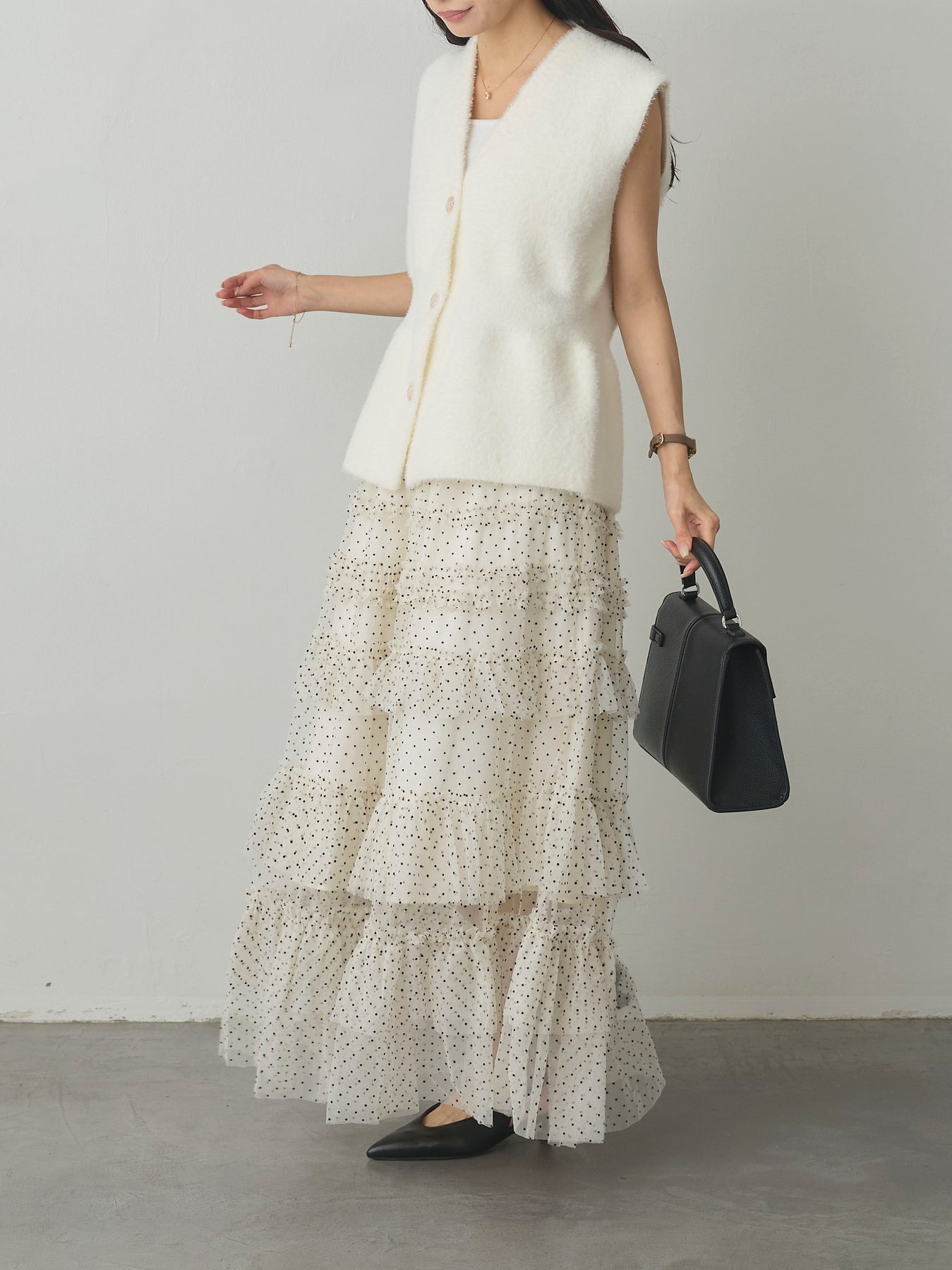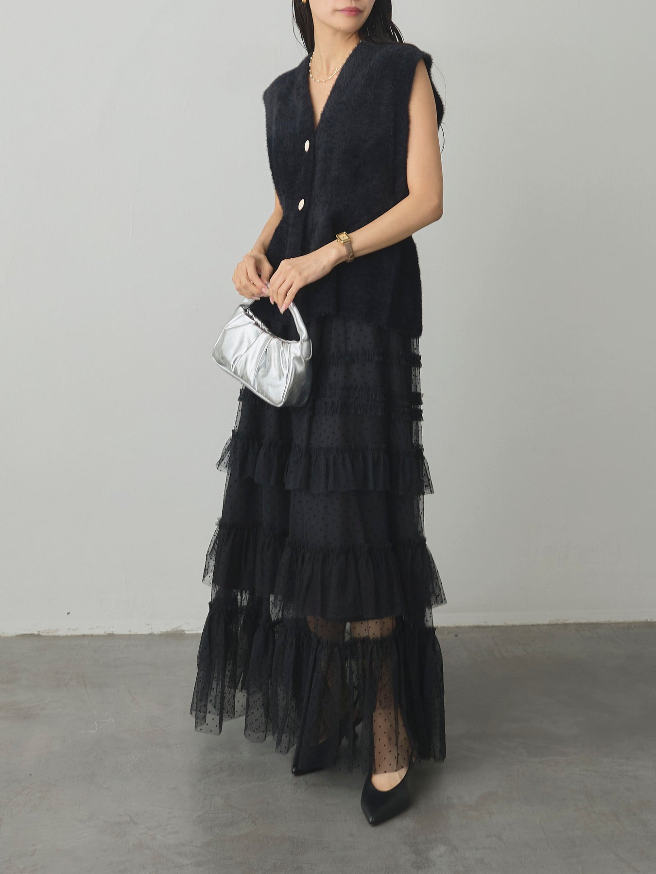 軽やかなチュール素材にドットをあしらい、ティアードデザインで華やかに仕上げたスカート。動くたびに揺れるシルエットが女性らしさを引き立て、シンプルなトップスと合わせるだけでコーディネートが完成します。